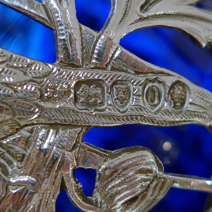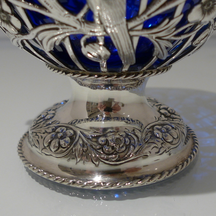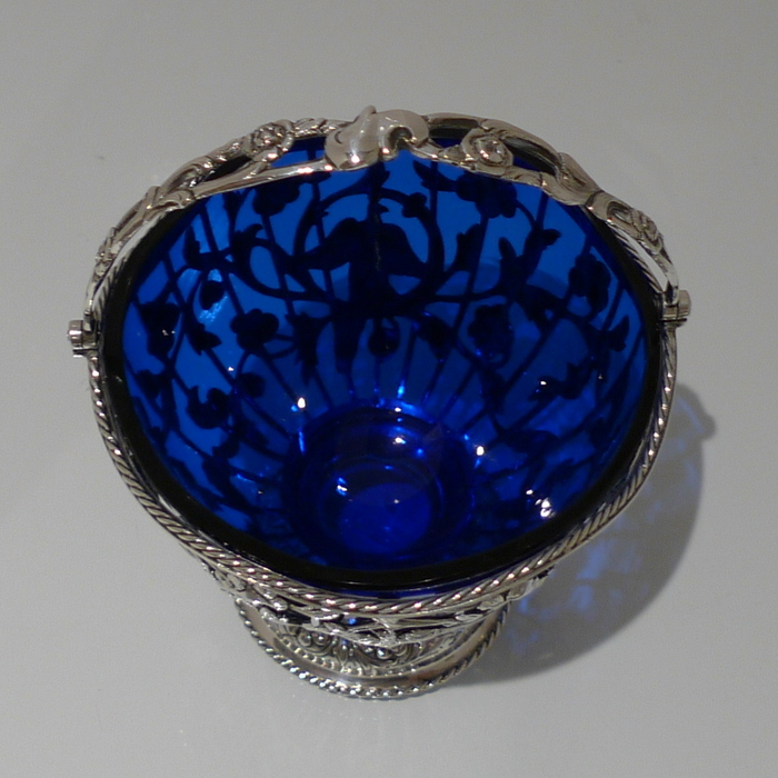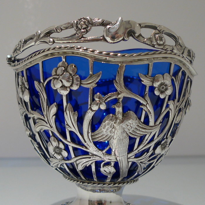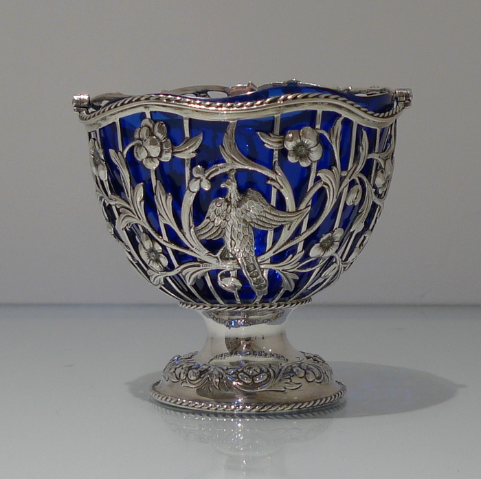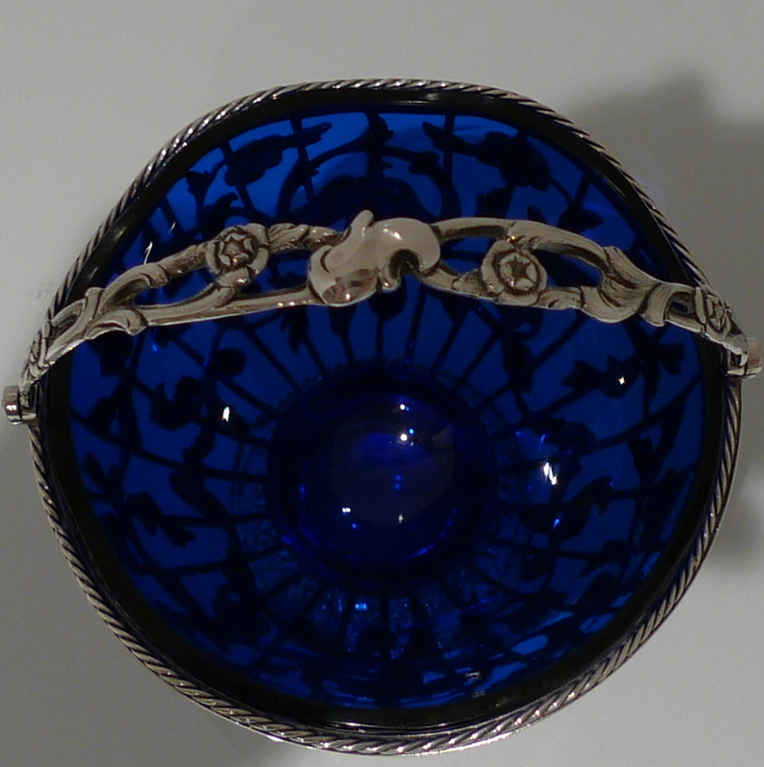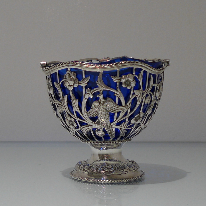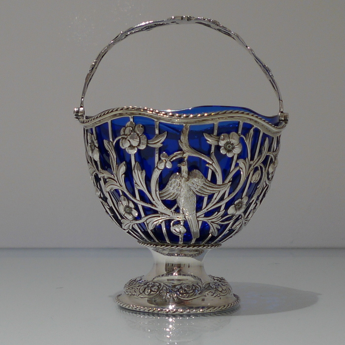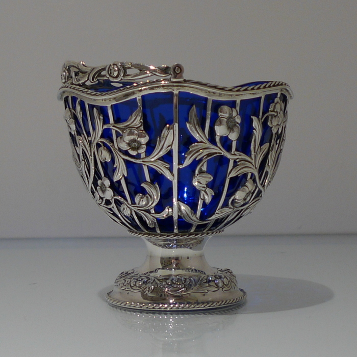 A stylish shaped edged circular swing handled sugar basket with an applied decorative upper and lower rope border. Â The body is elegantly pierced with floral and foliage themes for decoration. Â The foot is raised pedestal in design and has a lower band of ornate embossing for lowlights.