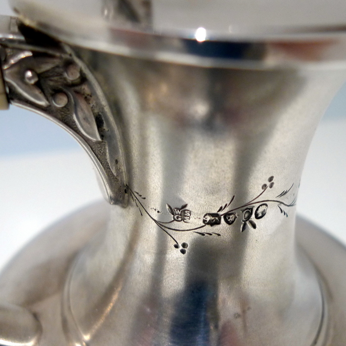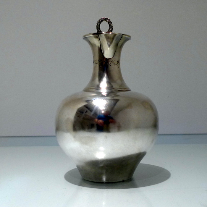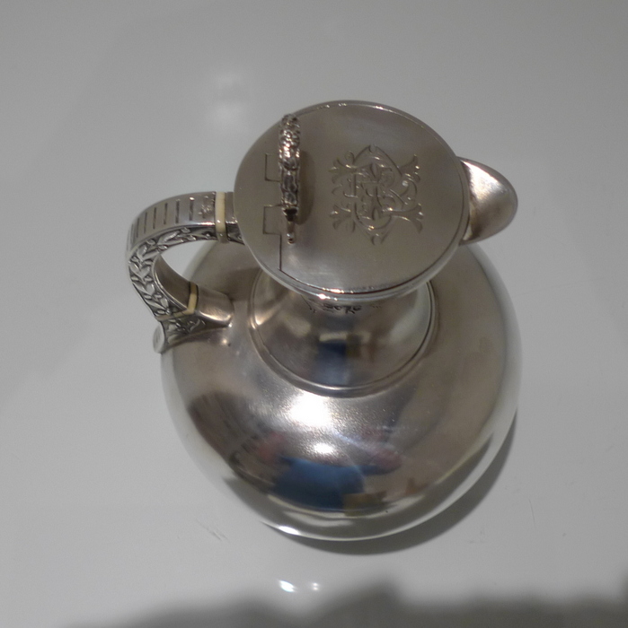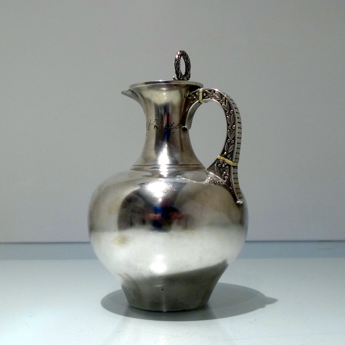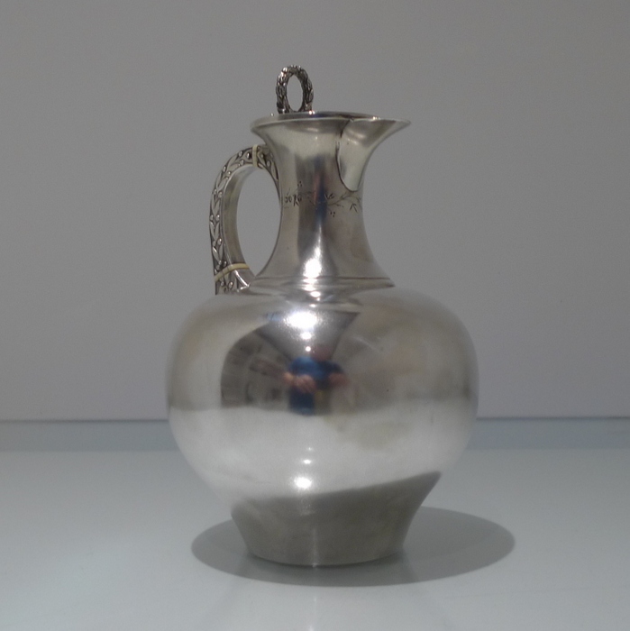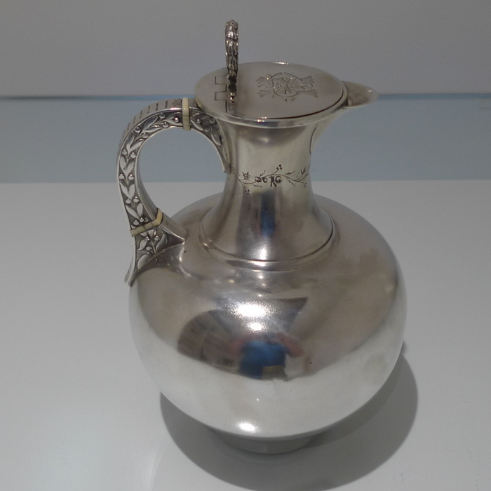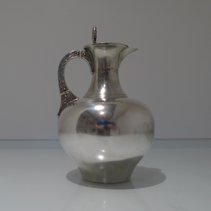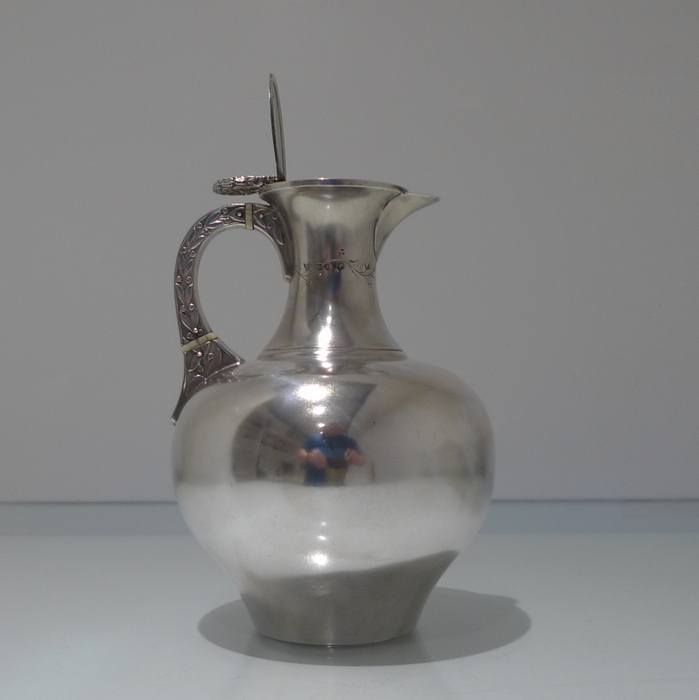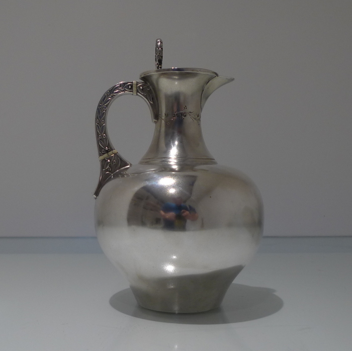 An extremely rare example of a Victorian period wine jug designed with a stylish matt finished patina and a single band of floral engraving. Â The handle is scroll form with ornate decoration for highlights. Â The lid is hinged and has a contemporary initial for importance.