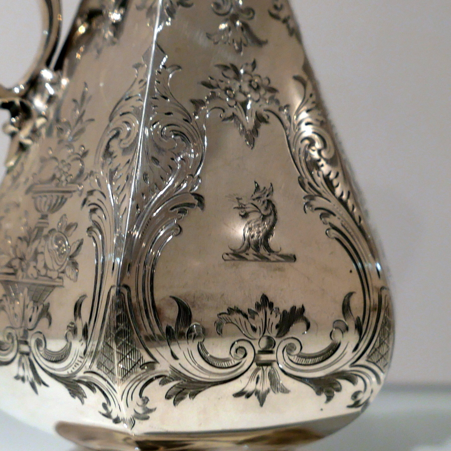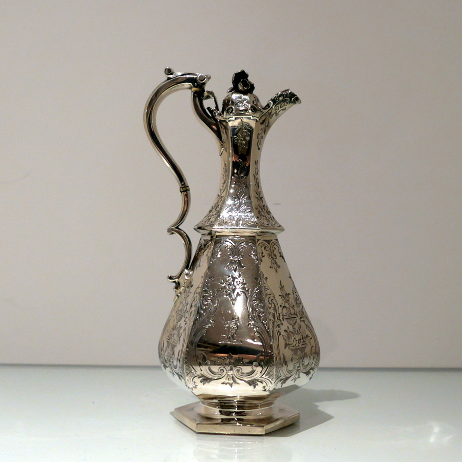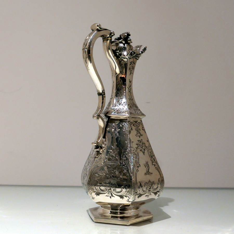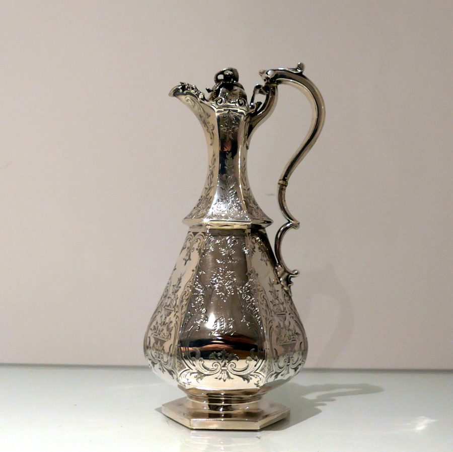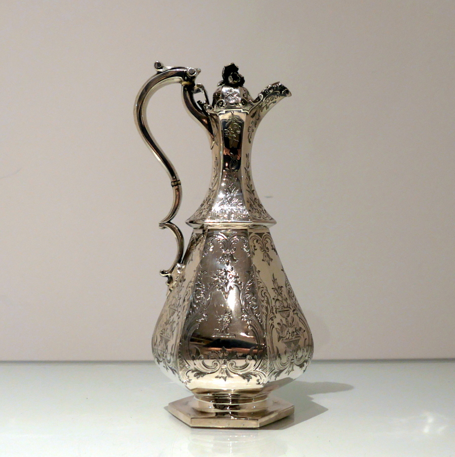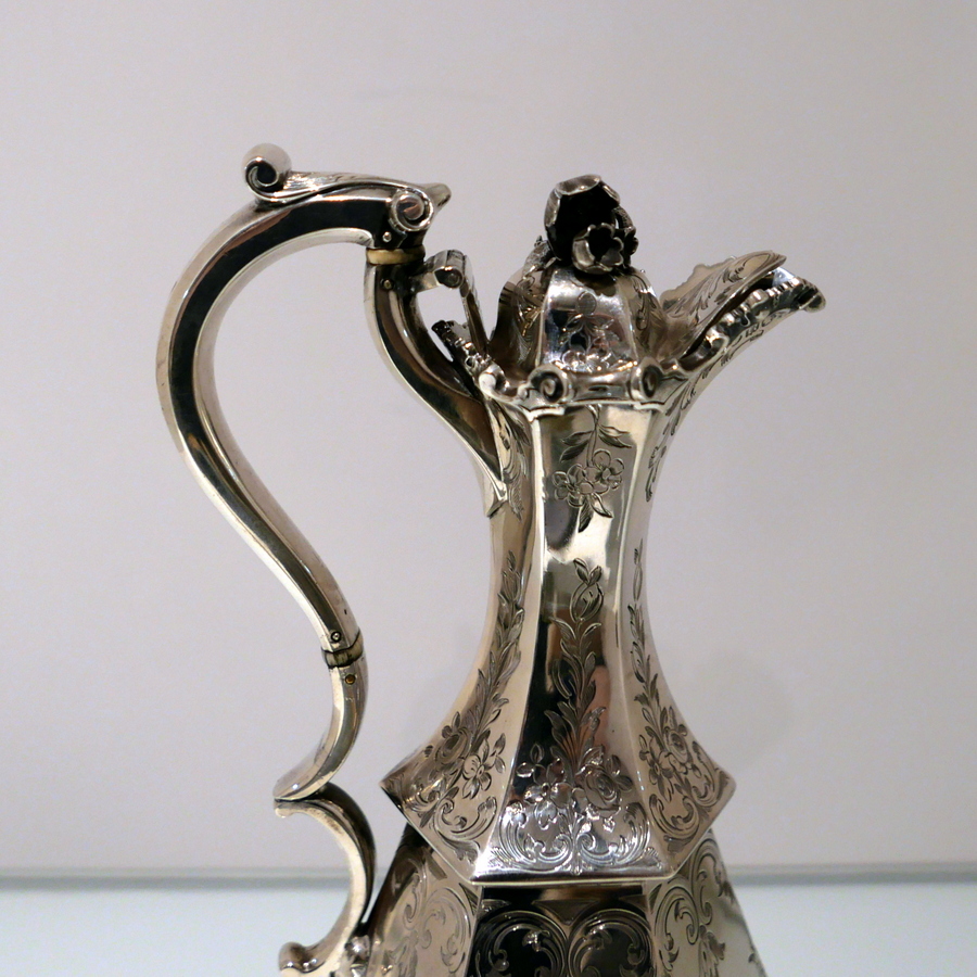 8A stunning Victorian sterling silver wine jug designed with elegant bulbous panelled body which has been stylishly engraved with intricate bright cut engraving. Â The domed hinged lid and the double scroll handle truly enhance a wonderful piece of craftsmanship. Â The cartouches have been hand engraved with contemporary initials and crest.