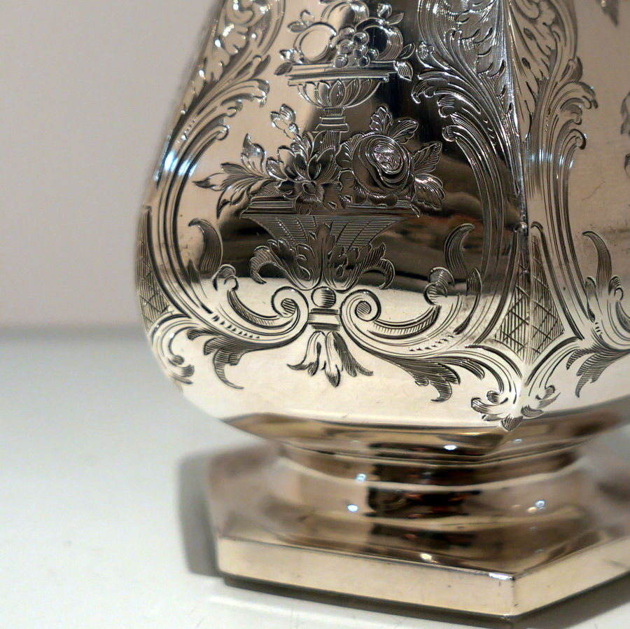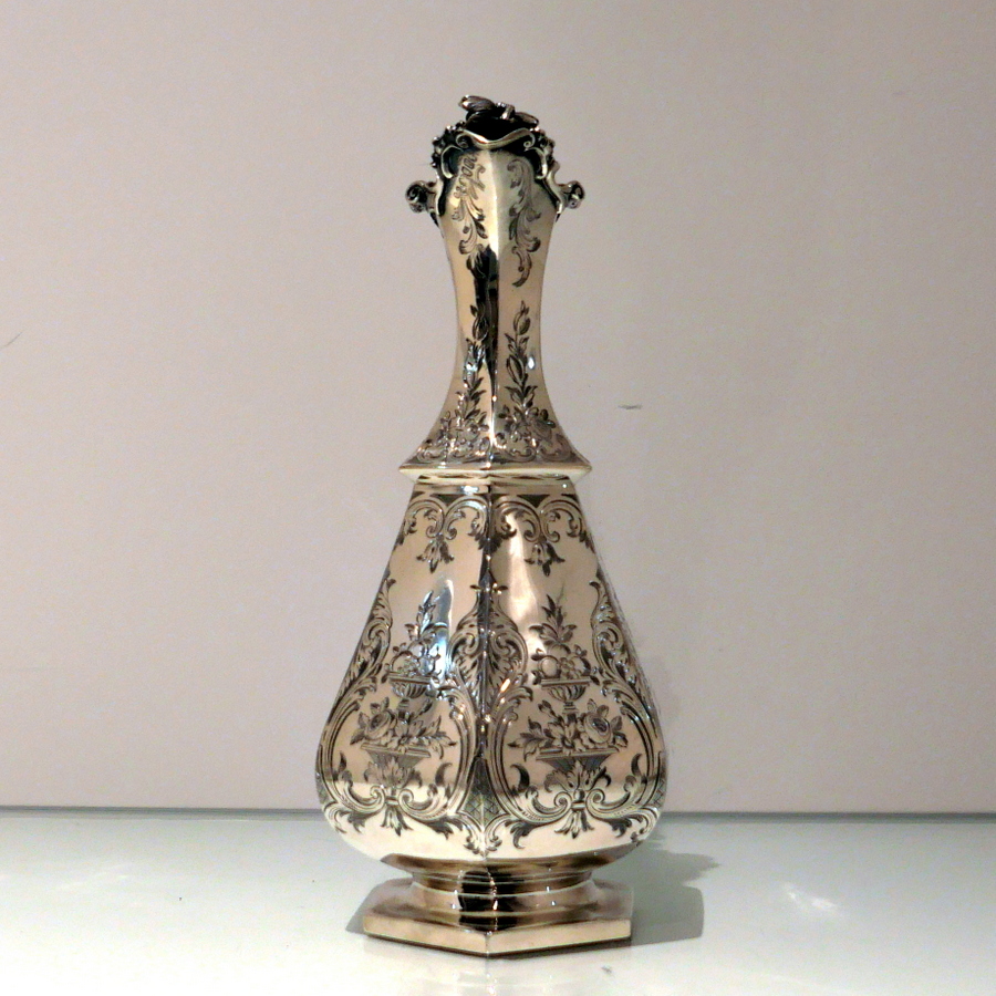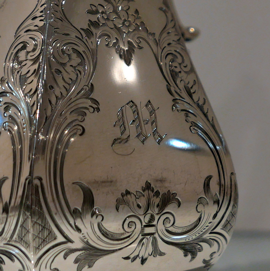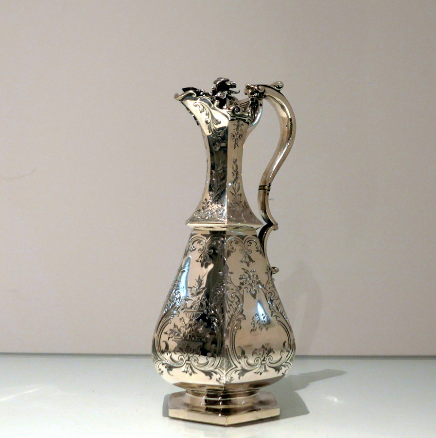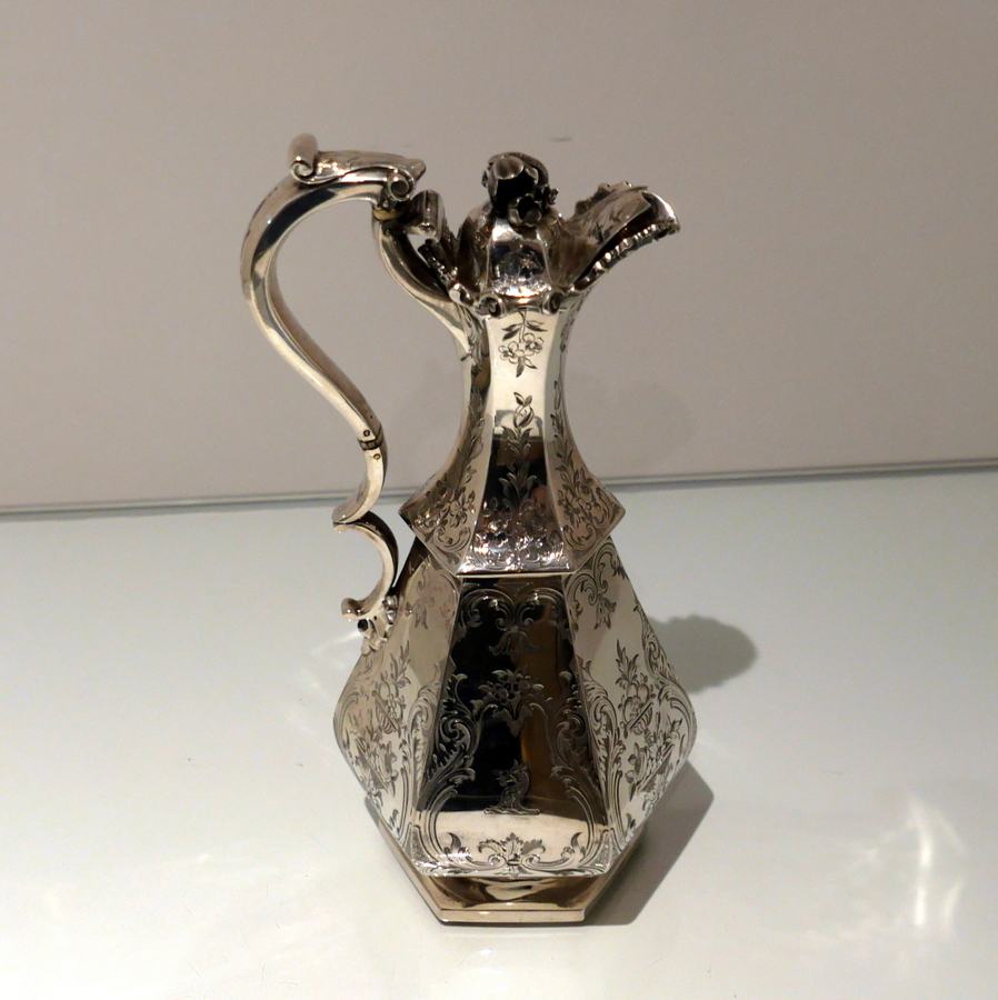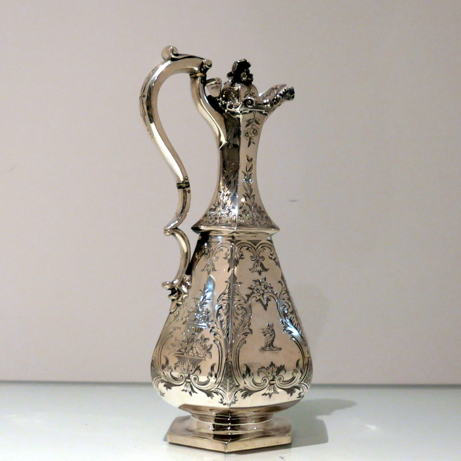 8A stunning Victorian sterling silver wine jug designed with elegant bulbous panelled body which has been stylishly engraved with intricate bright cut engraving. Â The domed hinged lid and the double scroll handle truly enhance a wonderful piece of craftsmanship. Â The cartouches have been hand engraved with contemporary initials and crest.