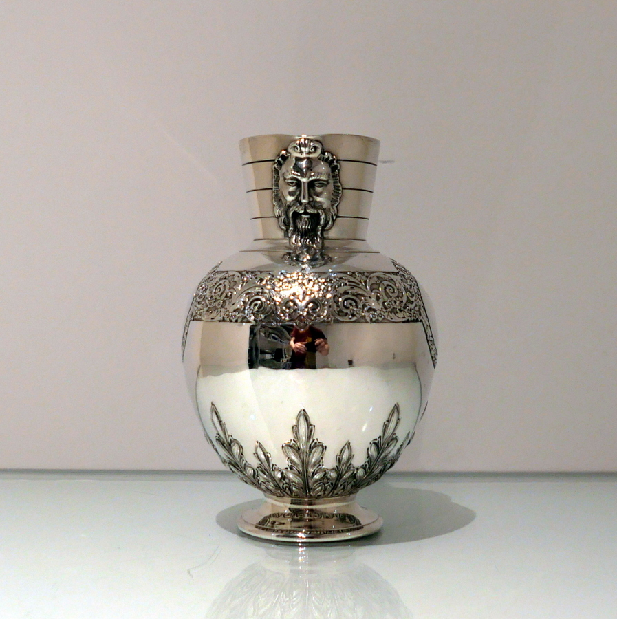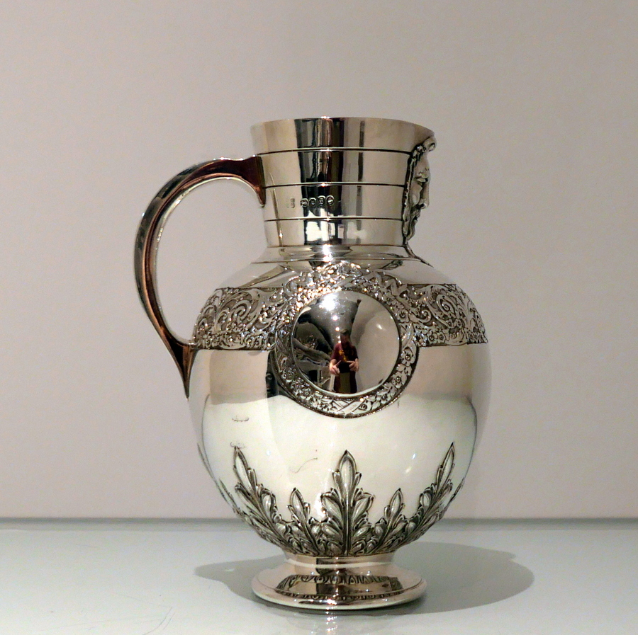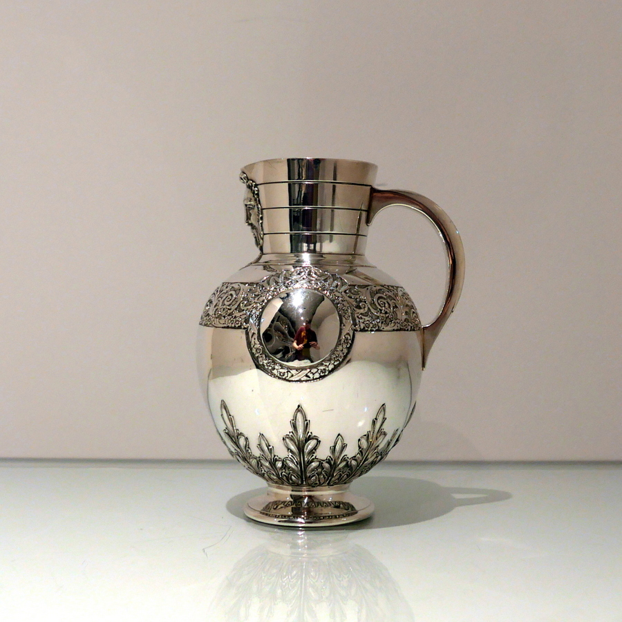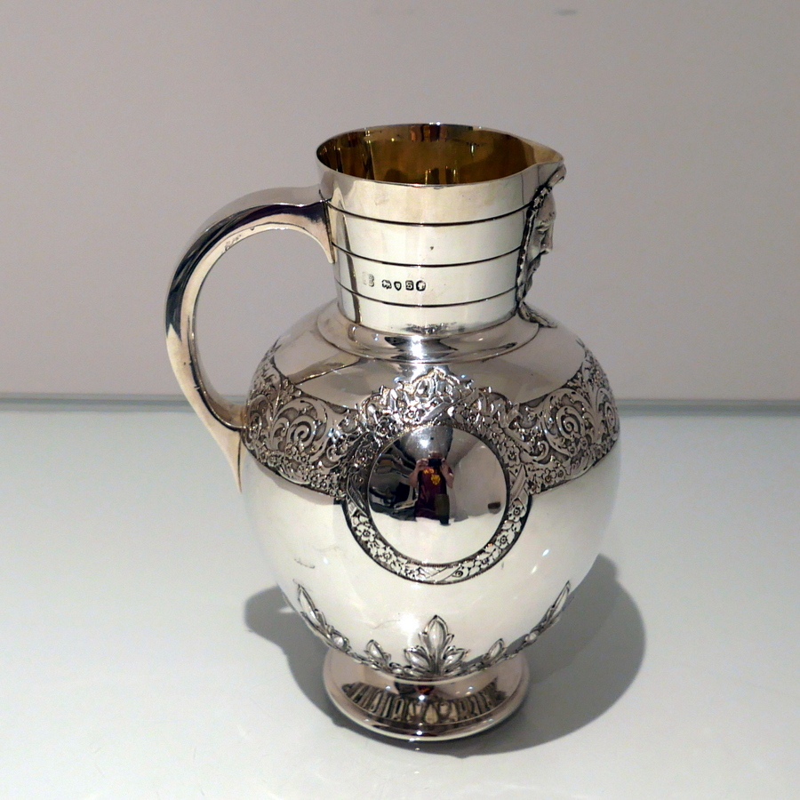 A beautiful 19th century sterling silver wine jug shaped with an elegant bulbous body and an intricate decorative strap work band which merges into a double (both sides) cartouche. Â The underside of the bowl has additional floral decoration.