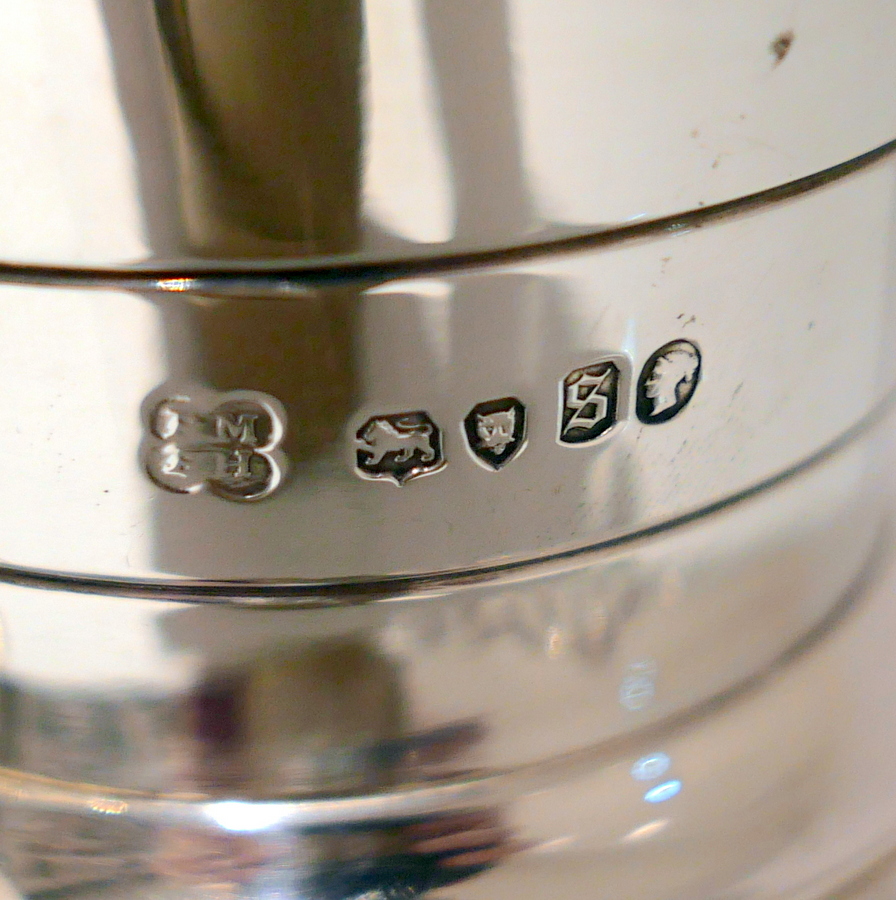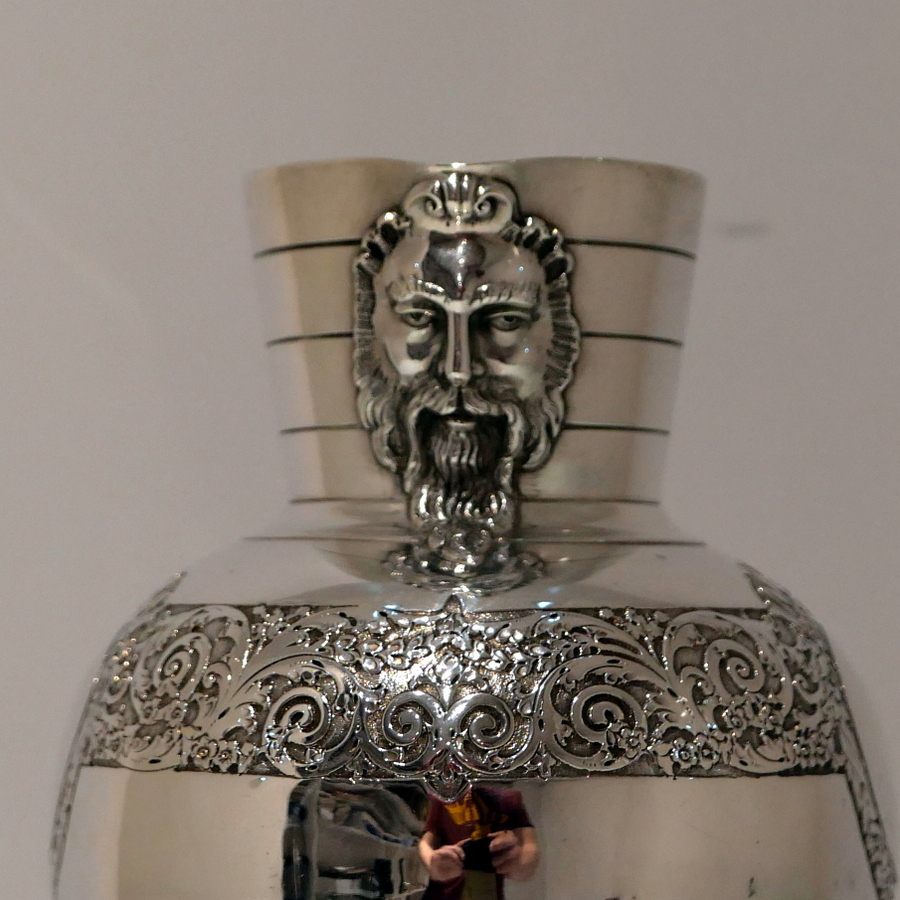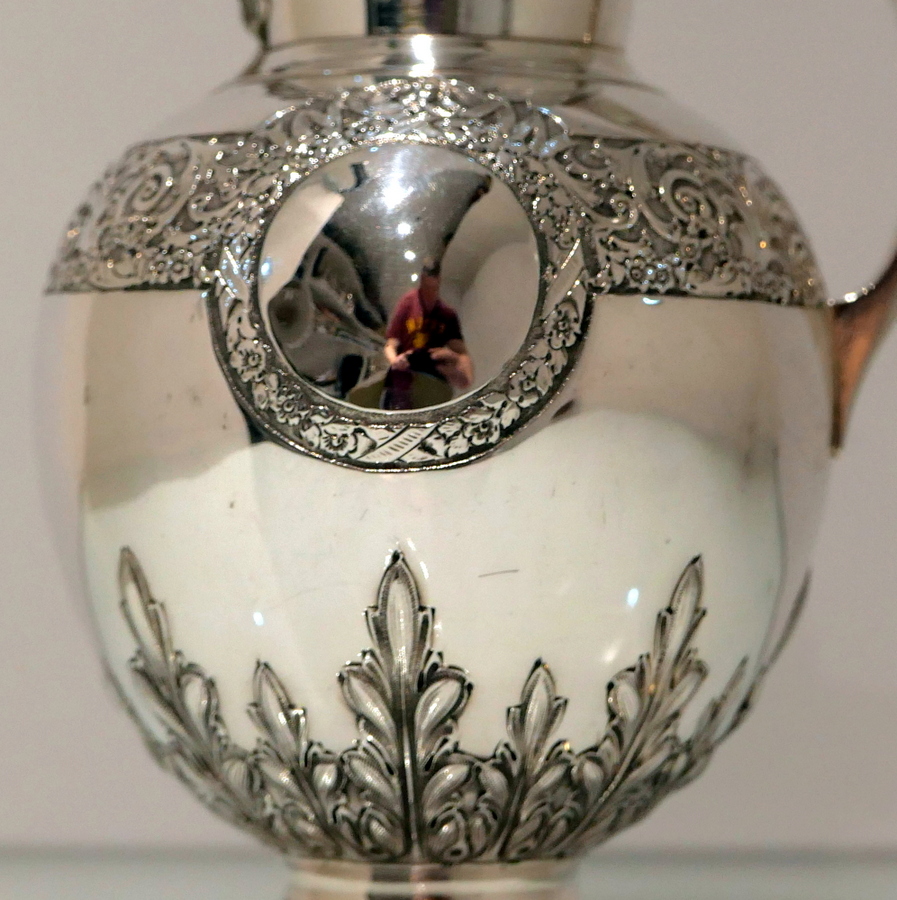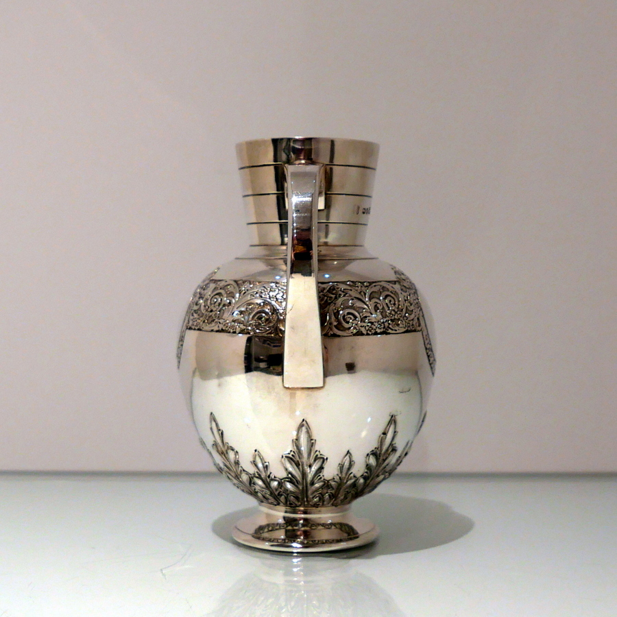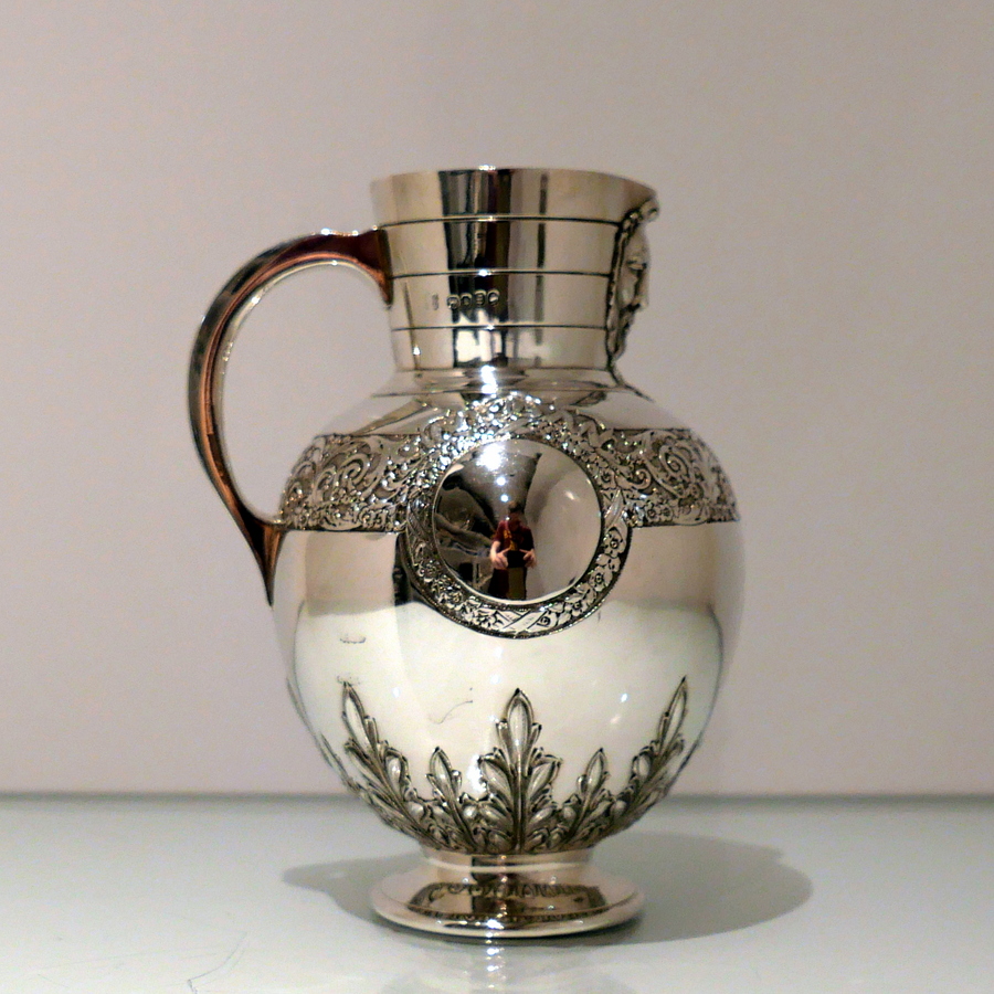 A beautiful 19th century sterling silver wine jug shaped with an elegant bulbous body and an intricate decorative strap work band which merges into a double (both sides) cartouche. Â The underside of the bowl has additional floral decoration.