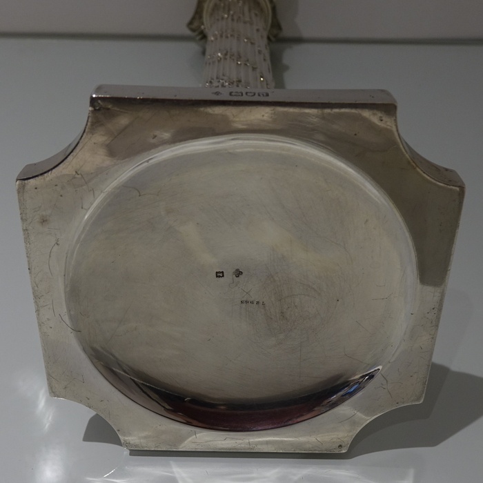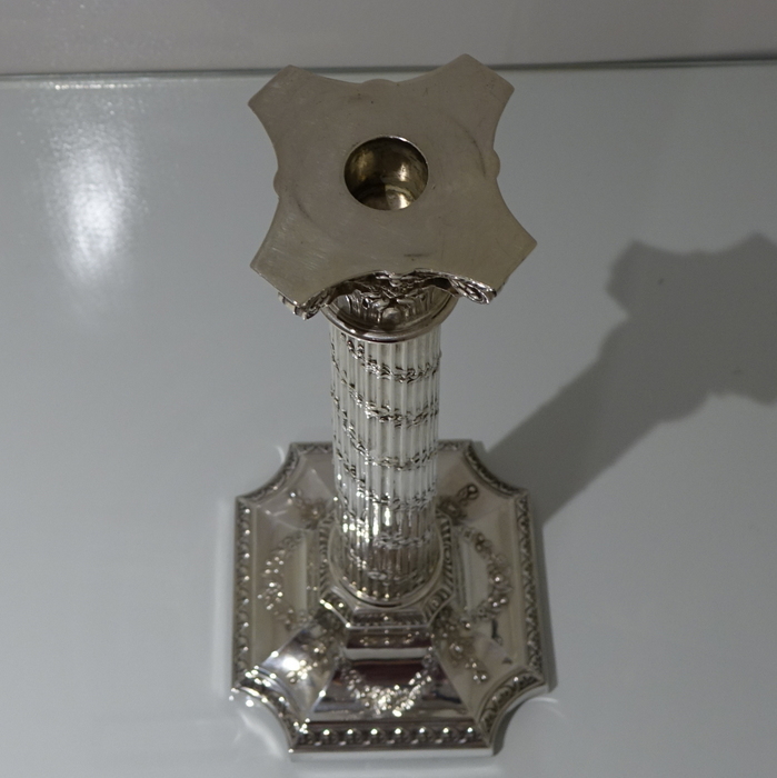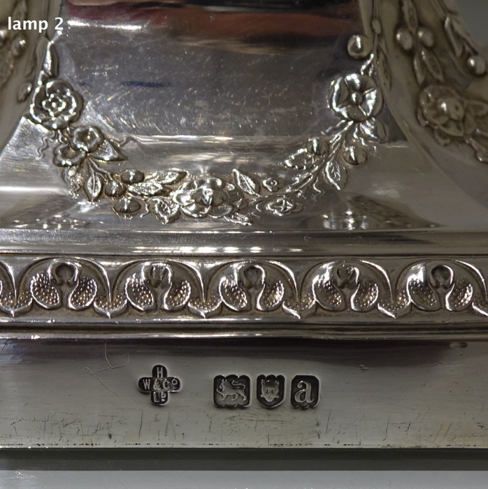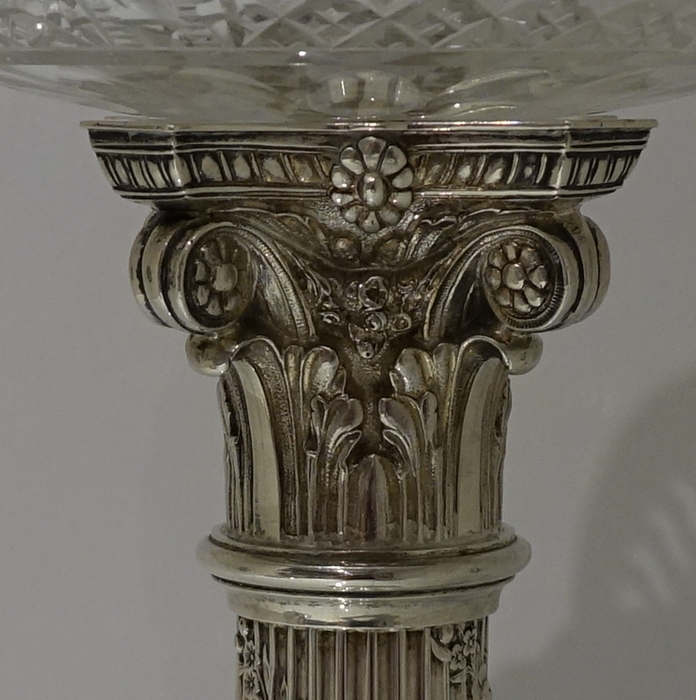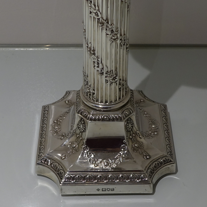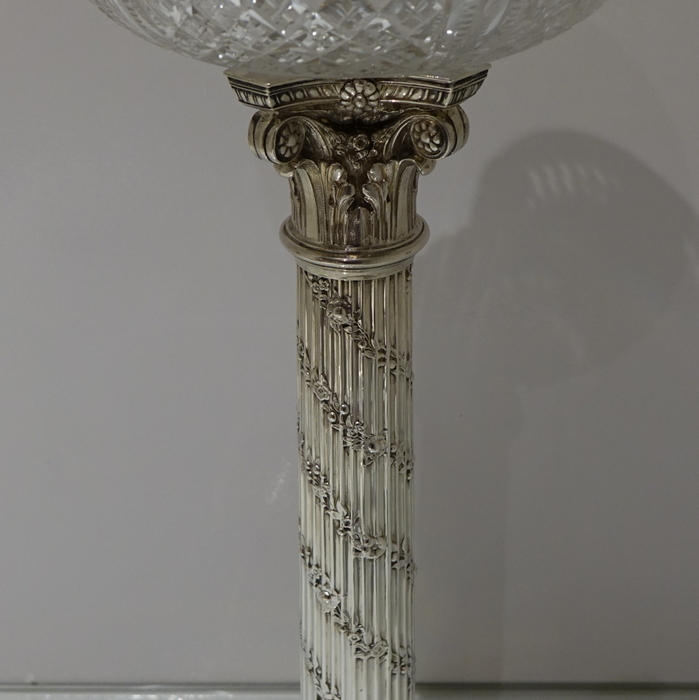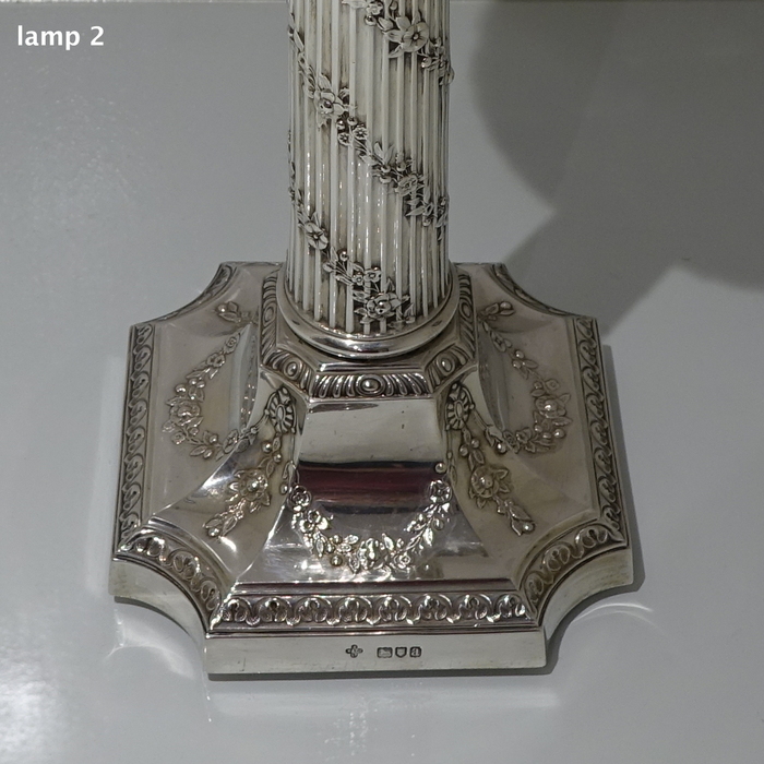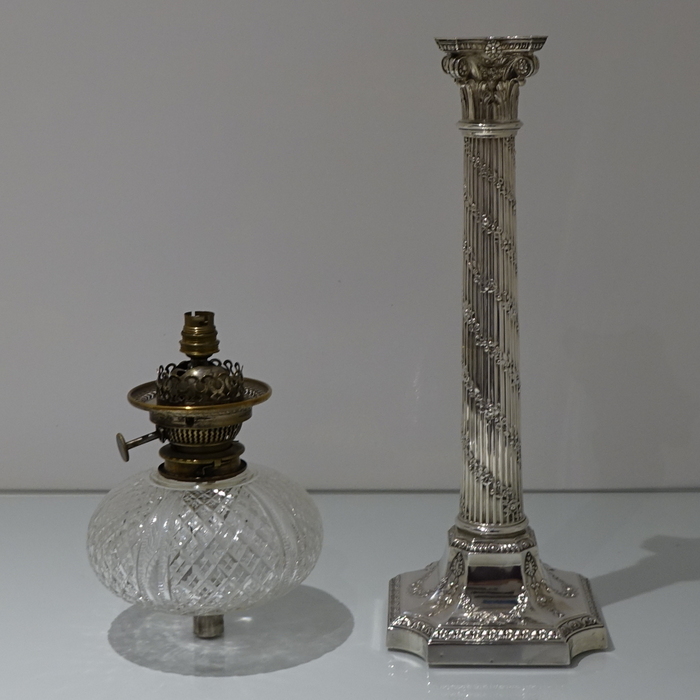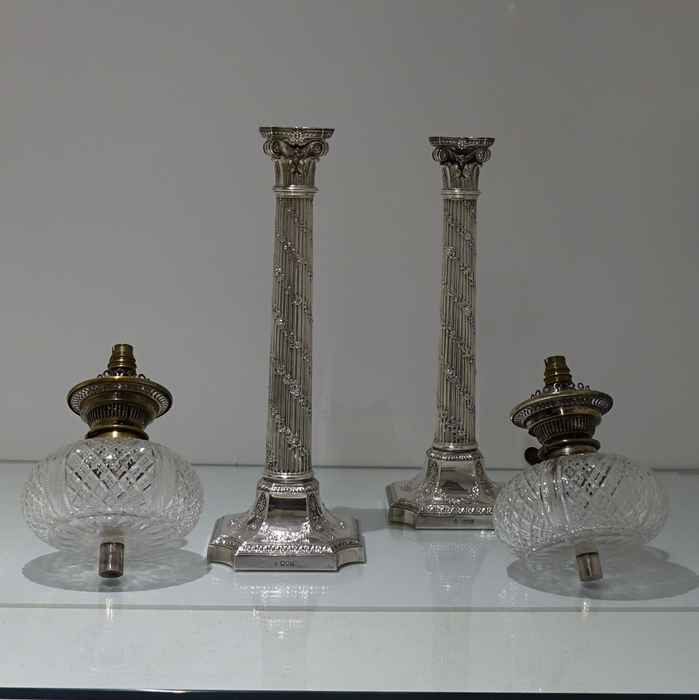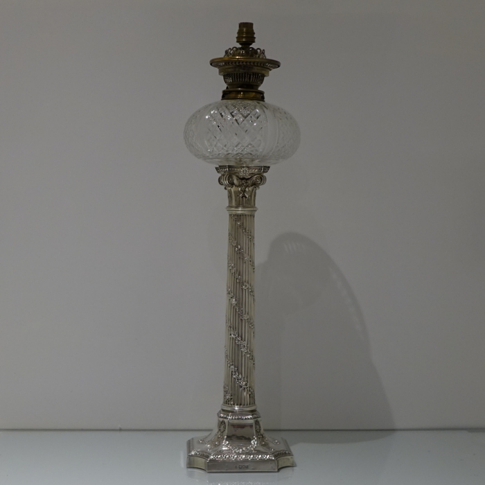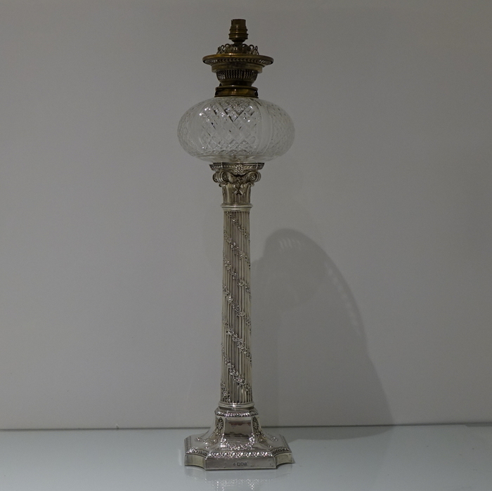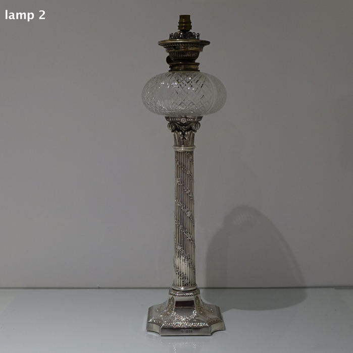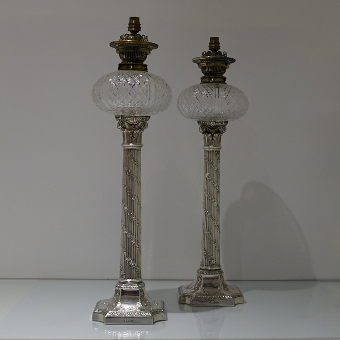 A rare and extremely impressive pair of large Victorian table lamps with corinthian columns with an additional spiral floral design for highlights. Â The bases are square cut cornered with elegant ornate workmanship for low lights. Â The detachable hobnail cut glass oil compartment is crowned with a brass electric fitting and storm feature.