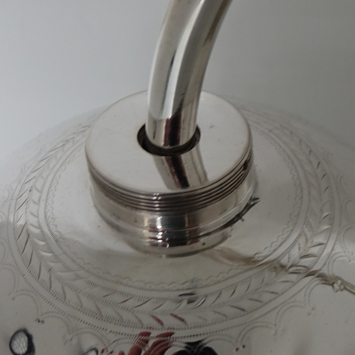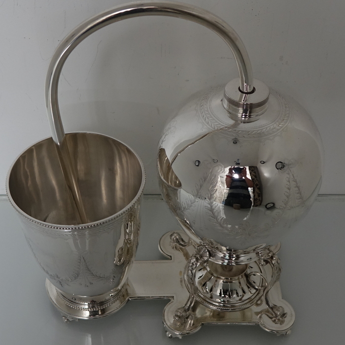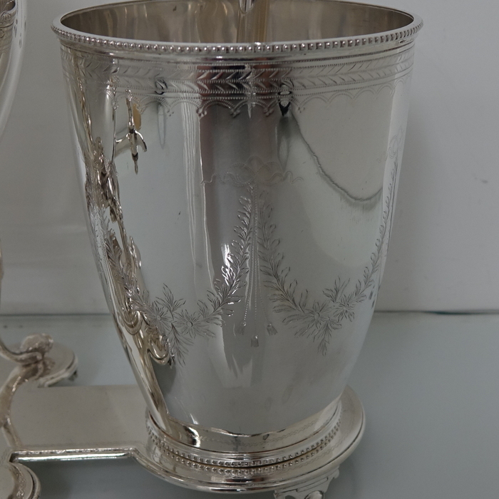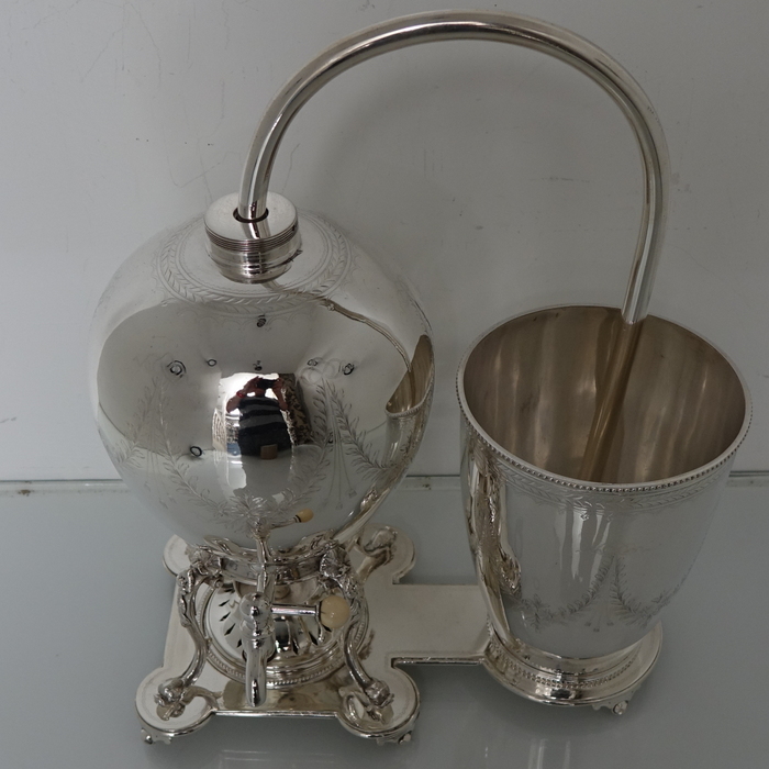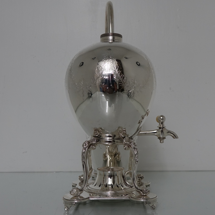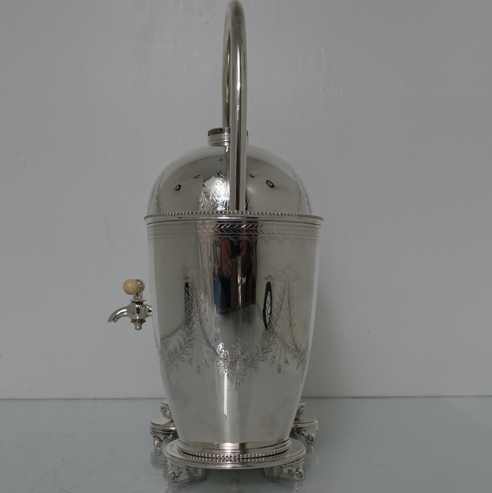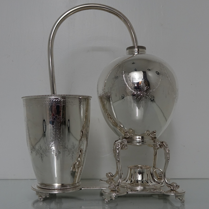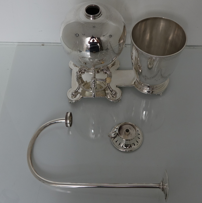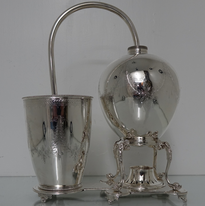A very rare and extremely collectable antique silver-plated coffee machine, with elegant engraving sandwich between bead upper and lower borders for decoration. Â There is a plate mark on the underside of the base.