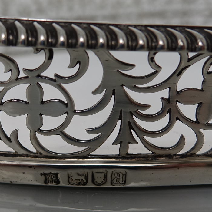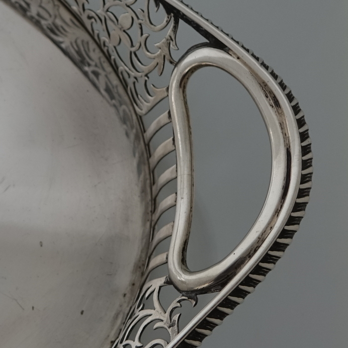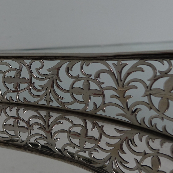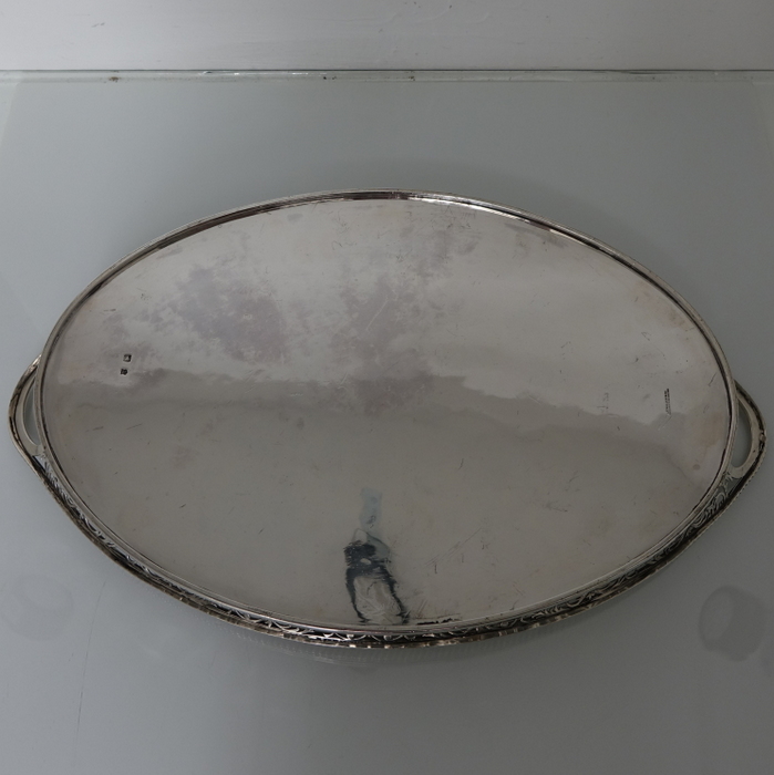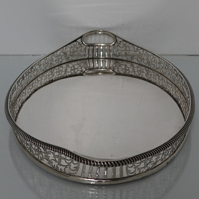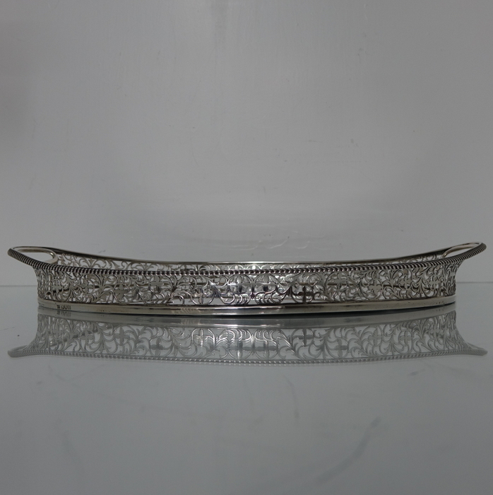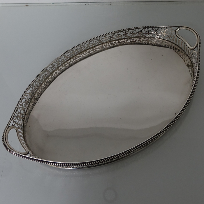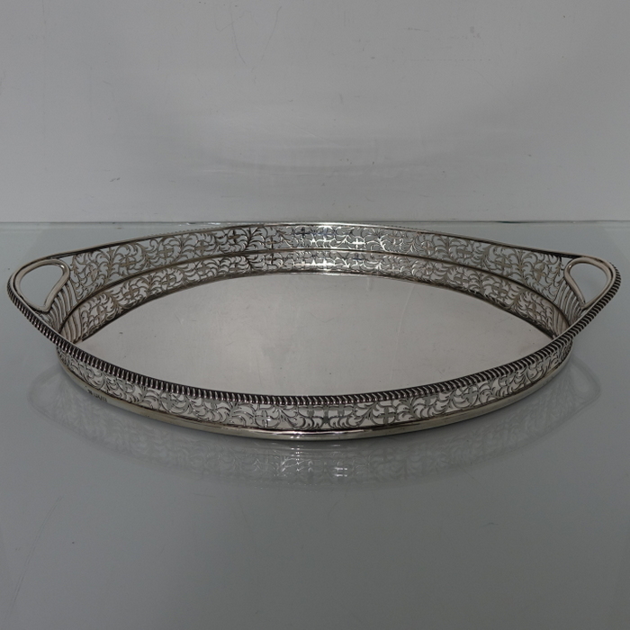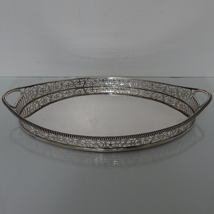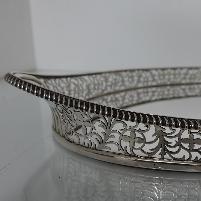 A stunningly beautiful oval tray with a elegant decorative hand pierced gallery which is crowned with a stylish gadroon border for highlights. Â The centre of the tray is plain formed with incuse handles at the ovals.