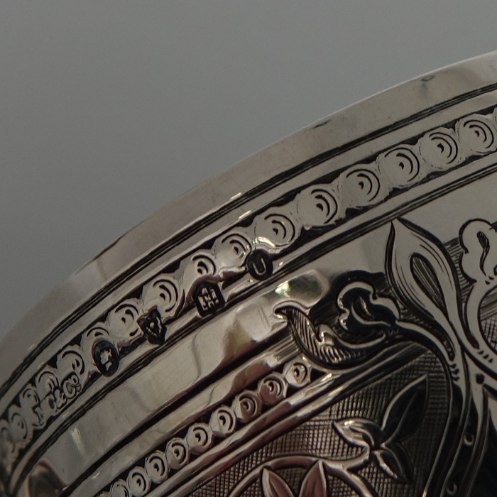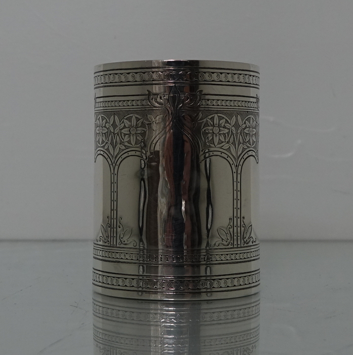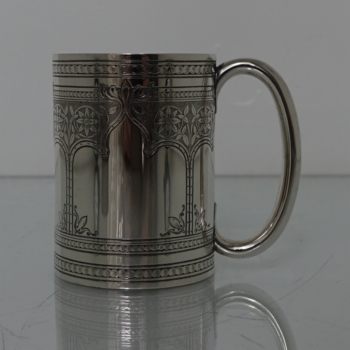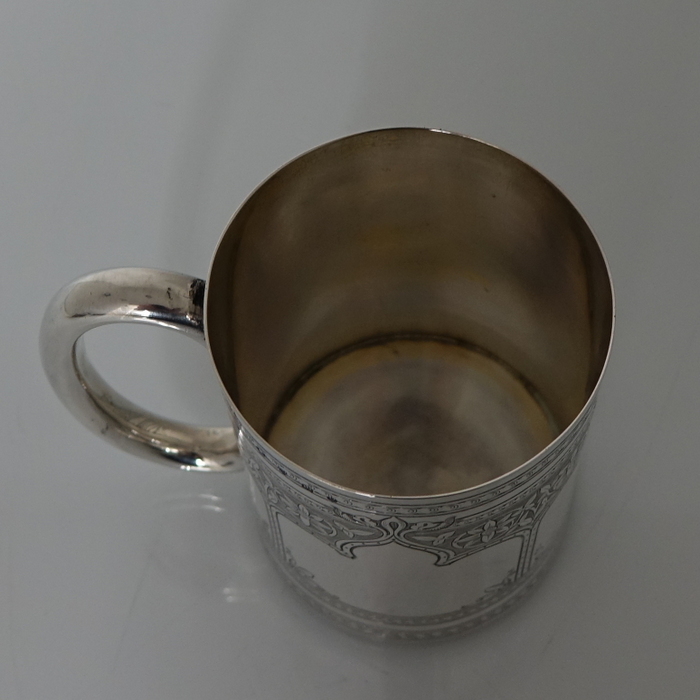 A beautiful intricately engraved 19th century Scottish circular christening mug with oval plain formed handle. Â The engraving is staggeringly beautiful with splashes of rosettes sitting on matt background.