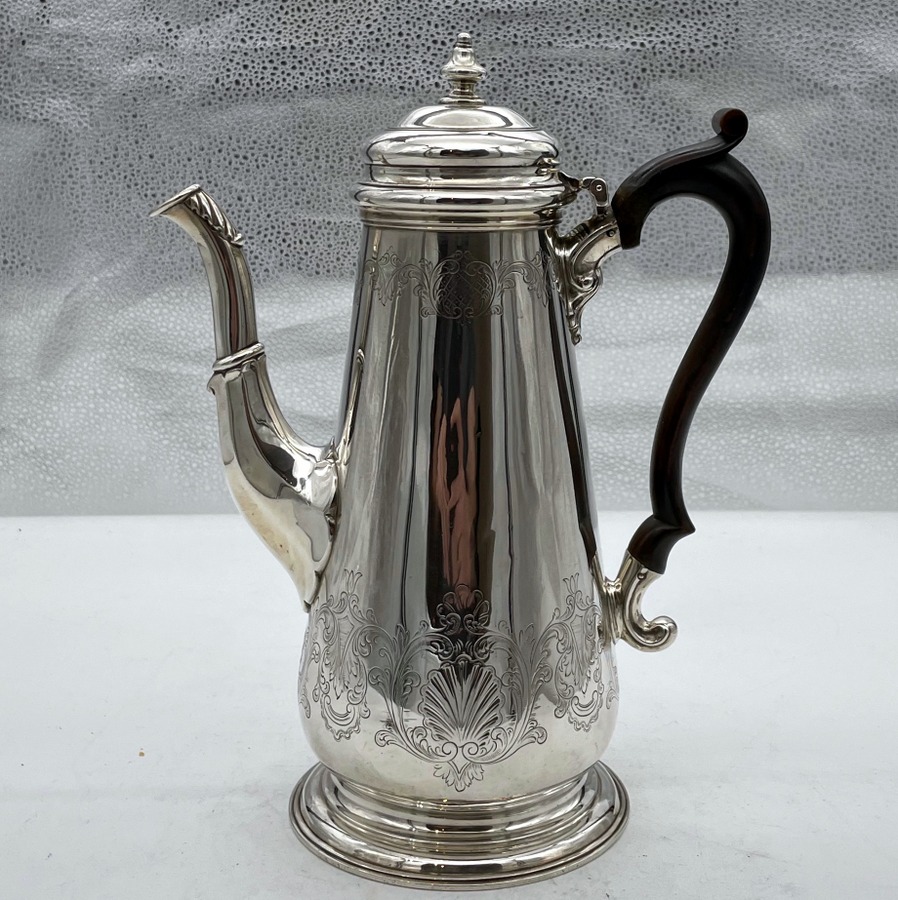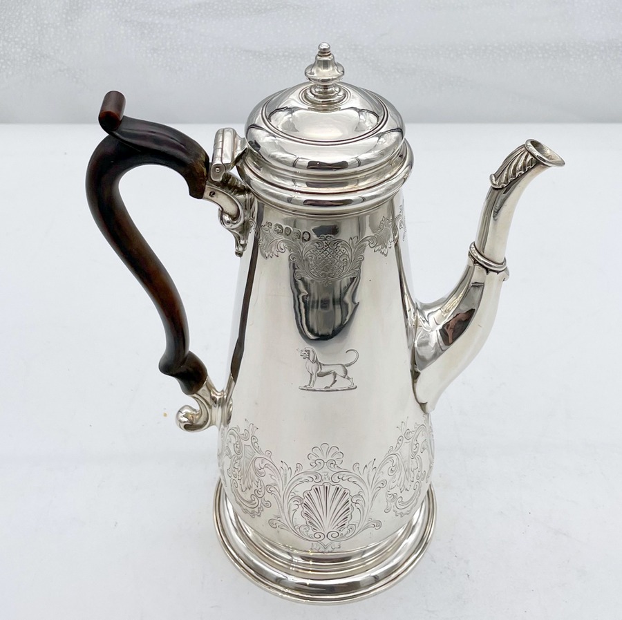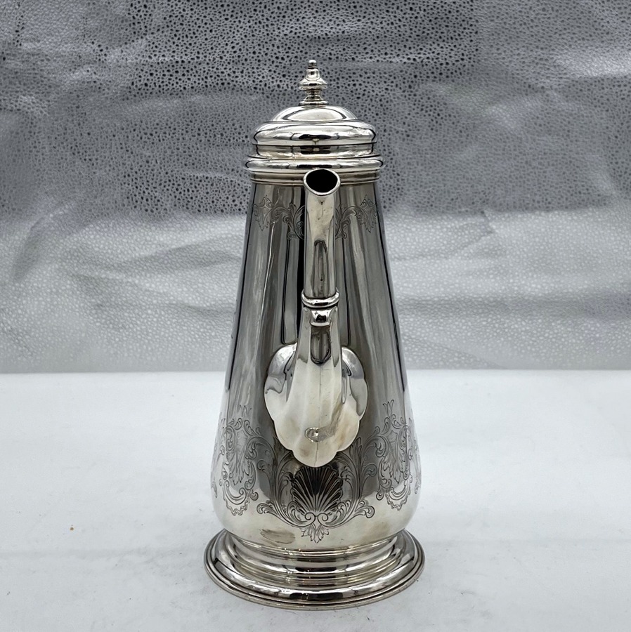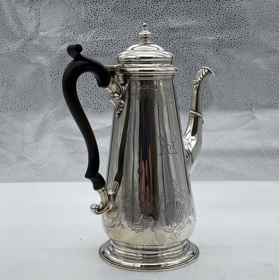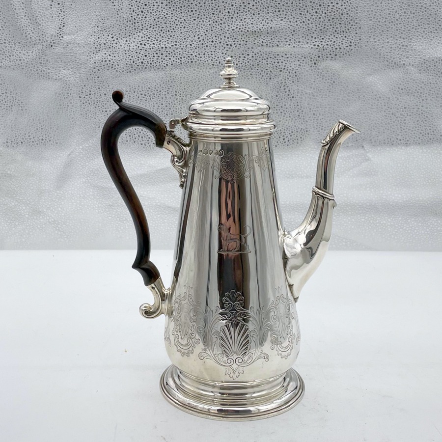A wonderful sterling silver coffee pot designed with an elegant tapering body and a handsome domed hinged lid. Â There are two bands of beautiful hand engraved shell and floral gallery bands for decoration and a contemporary hand engraved crest for importance.