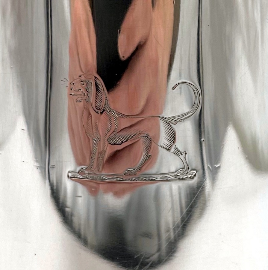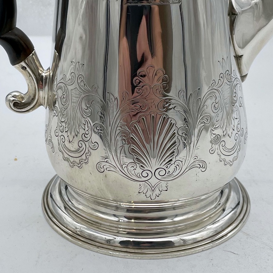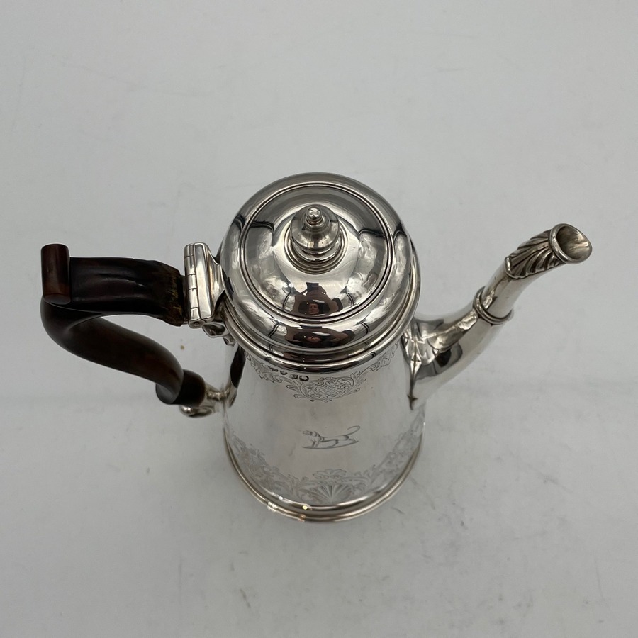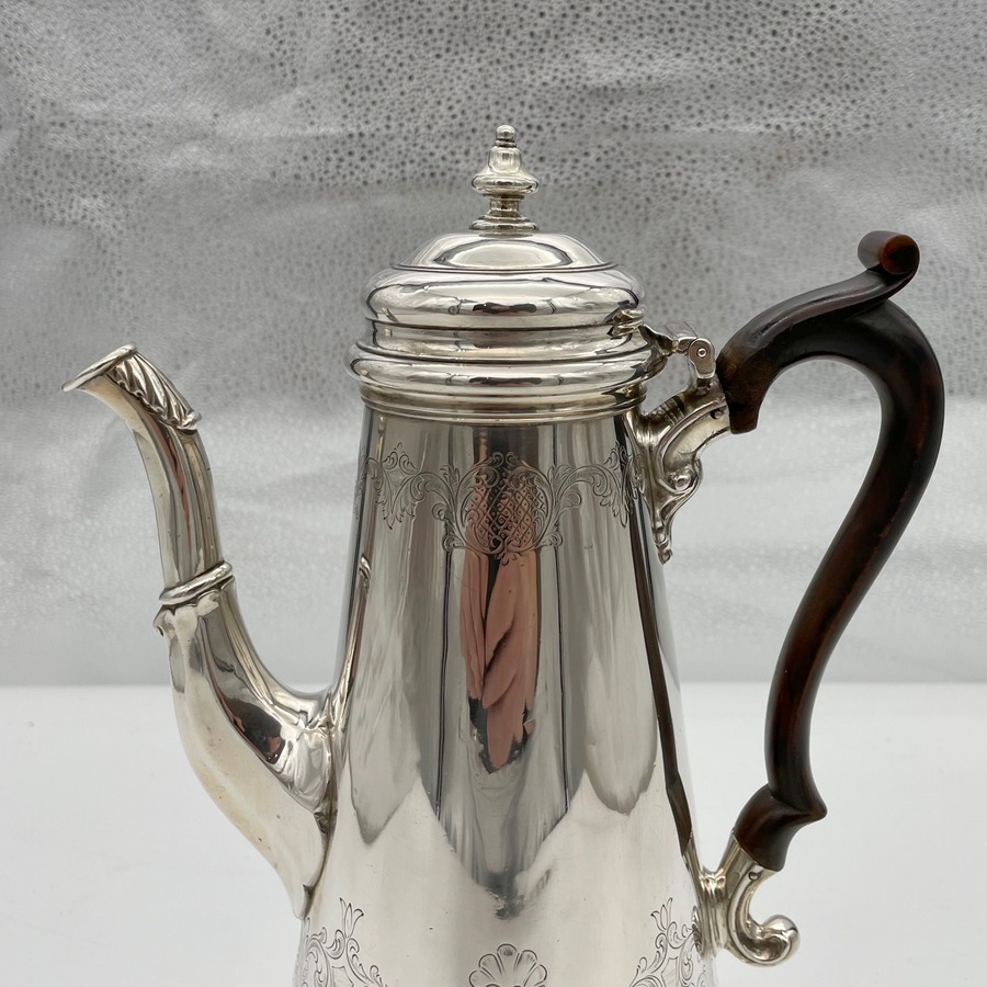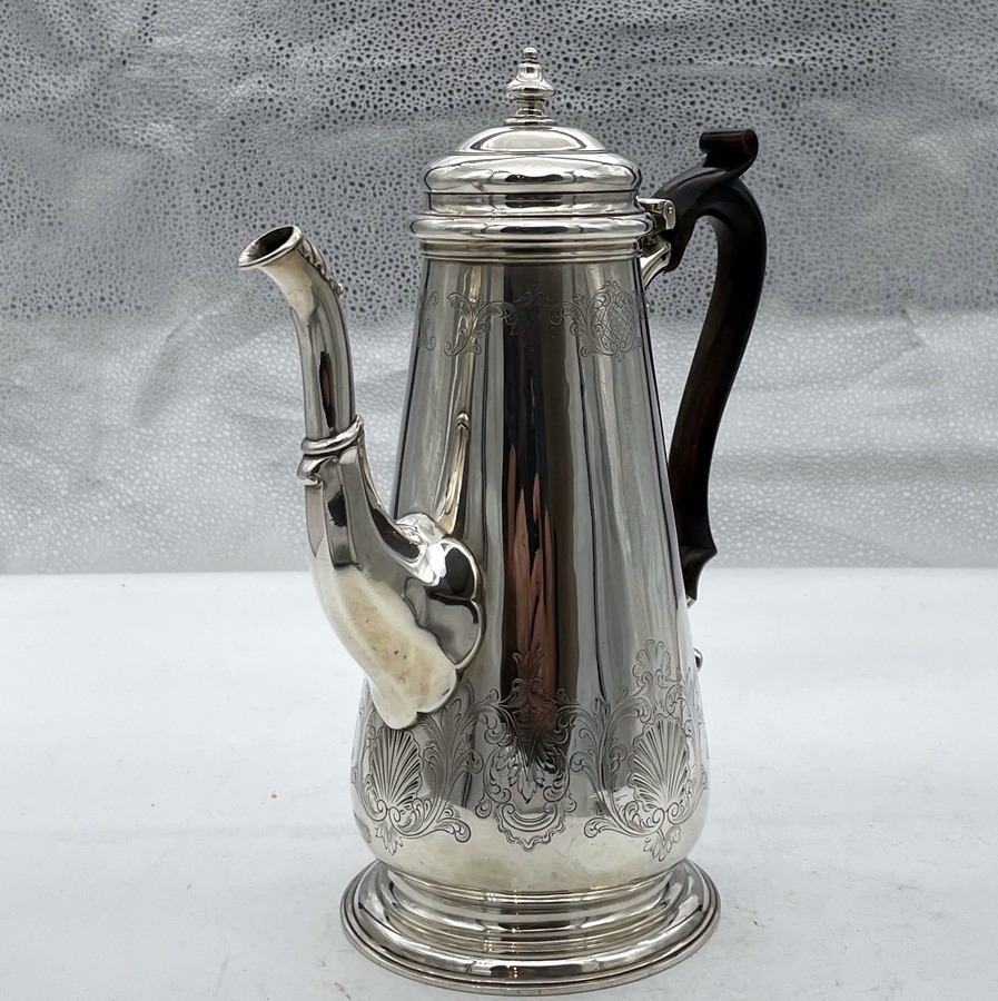 A wonderful sterling silver coffee pot designed with an elegant tapering body and a handsome domed hinged lid. Â There are two bands of beautiful hand engraved shell and floral gallery bands for decoration and a contemporary hand engraved crest for importance.