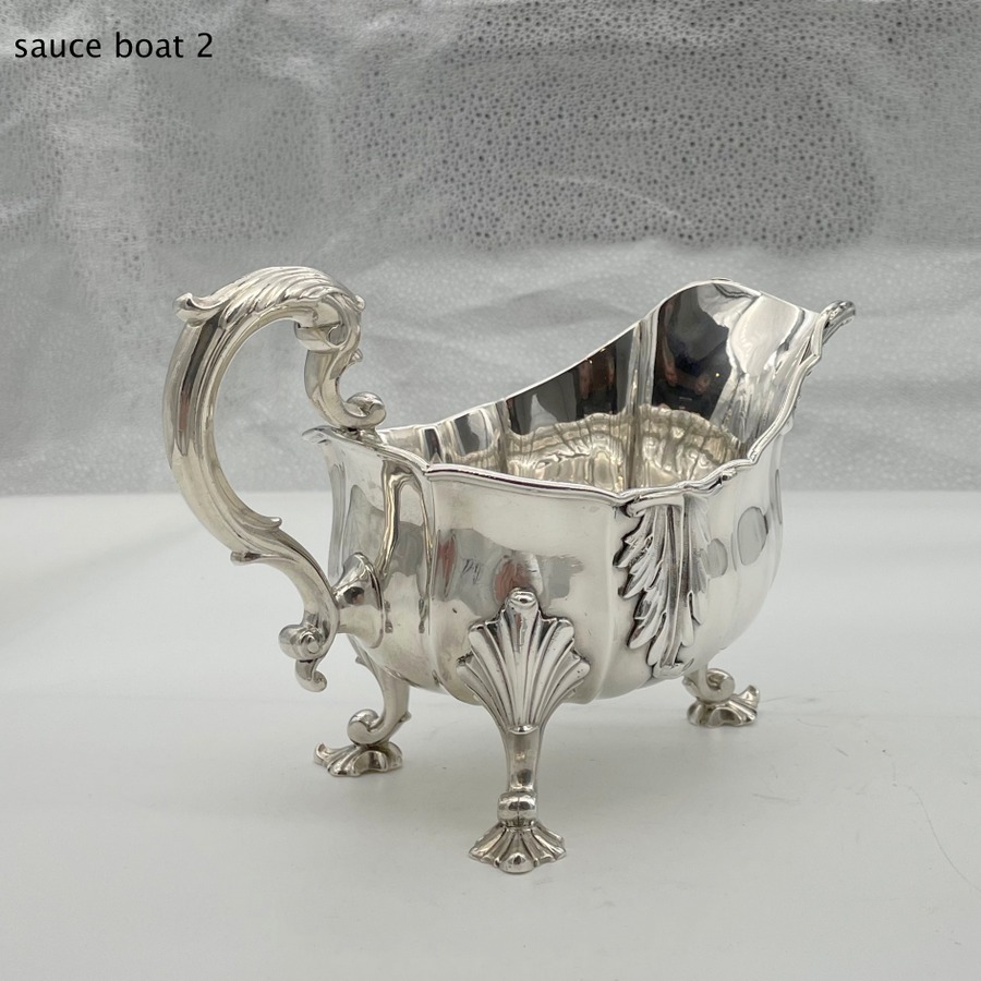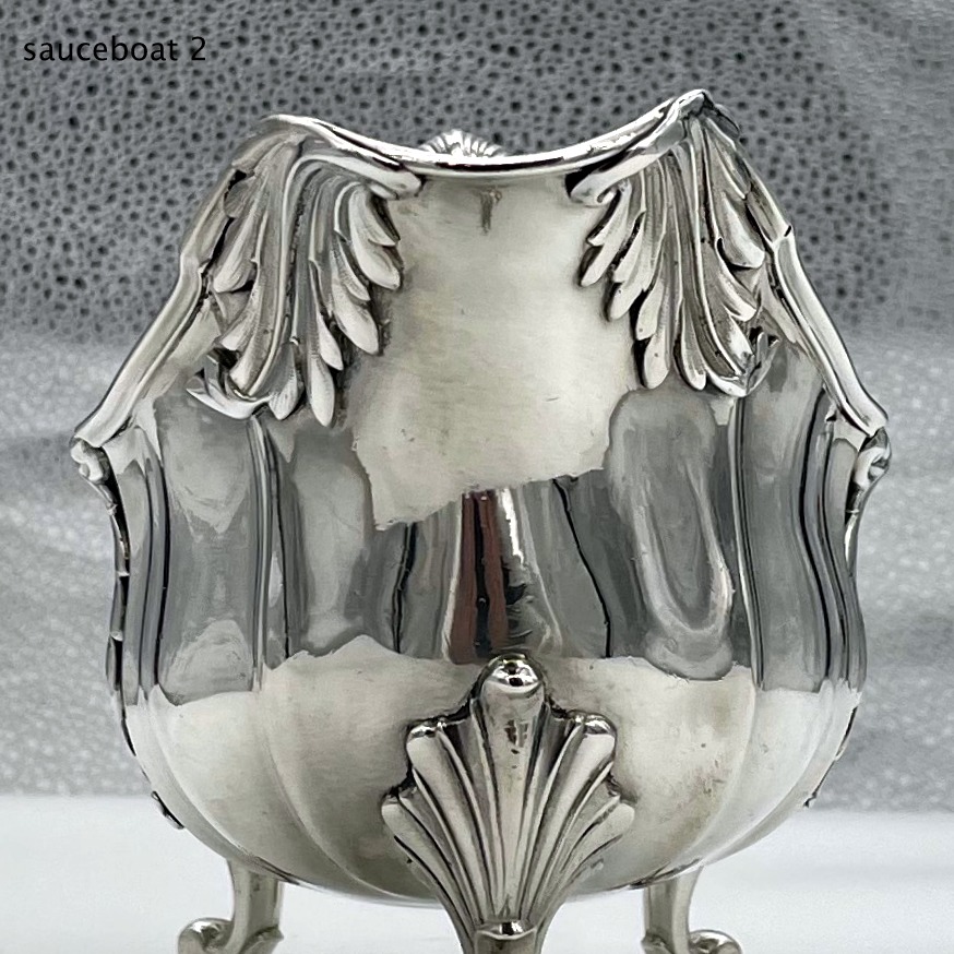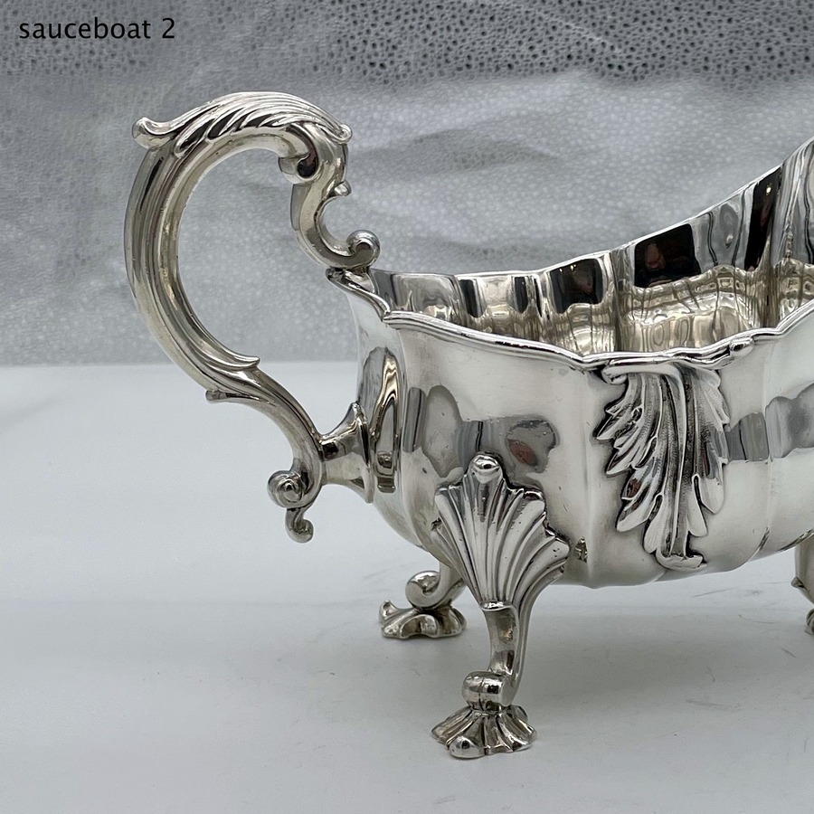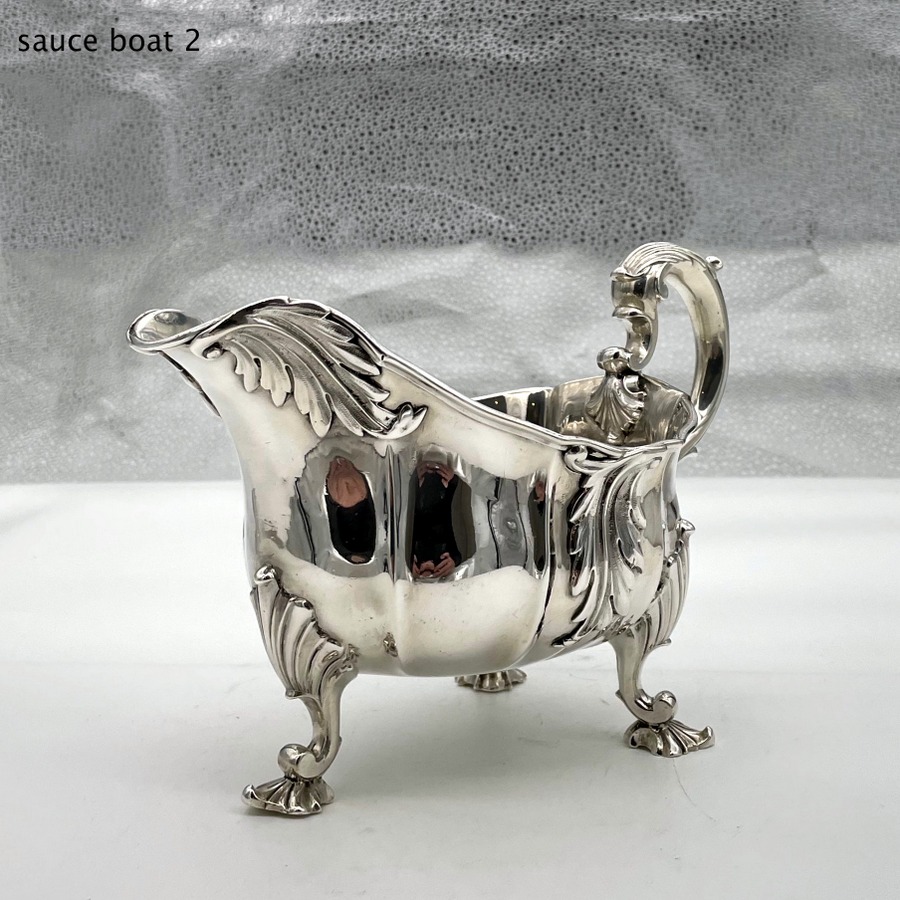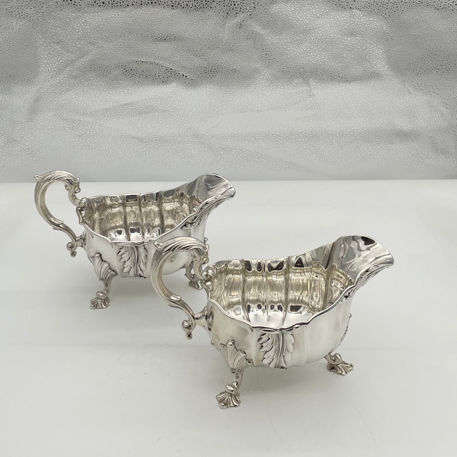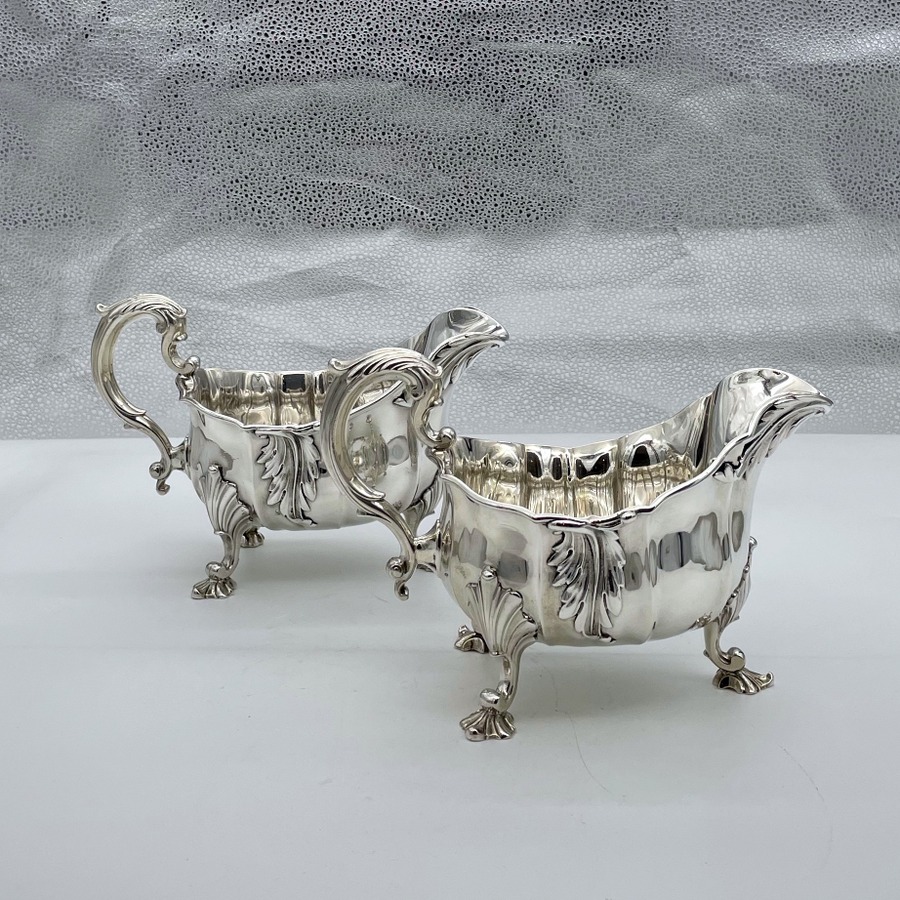 A spectacular pair of Victorian silver sauceboats decorated with sumptuous cast draping acanthus leaf motifs and designed with applied cast leaf capped scroll handles.