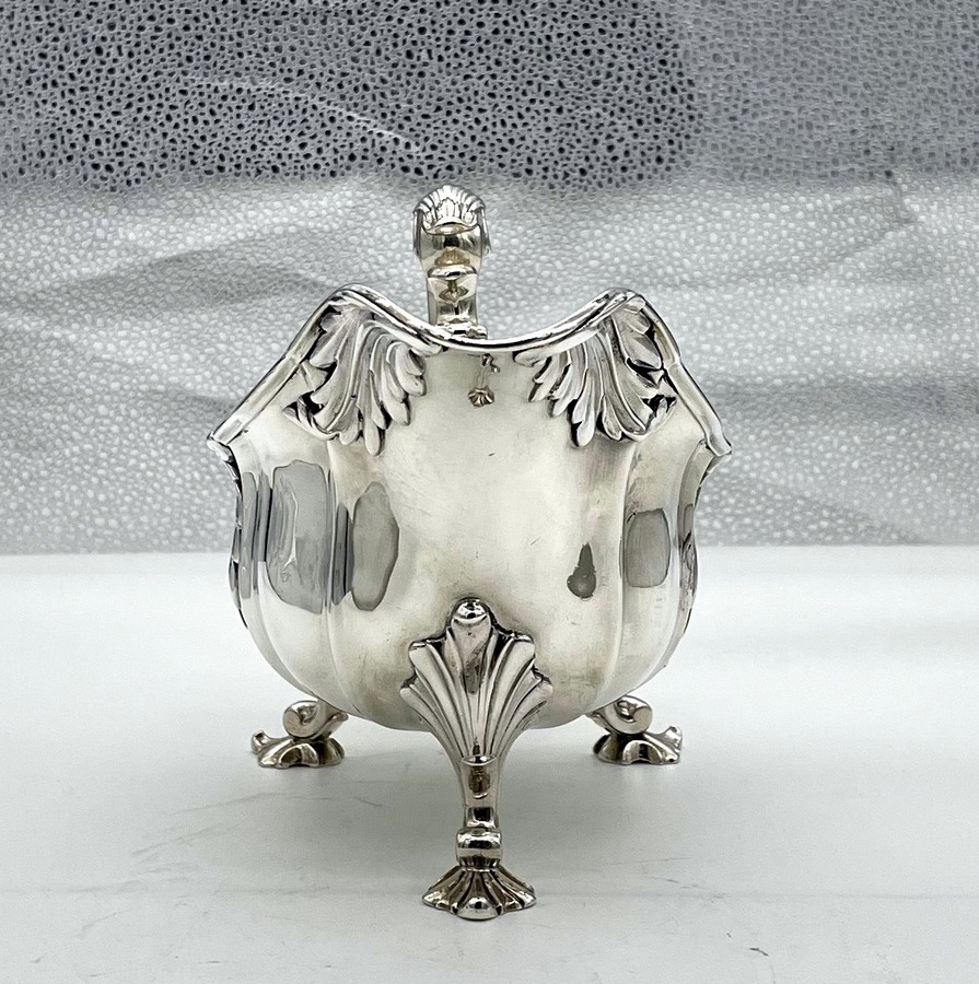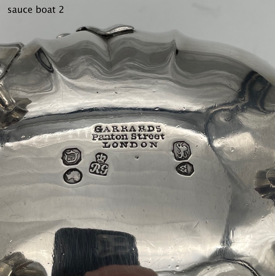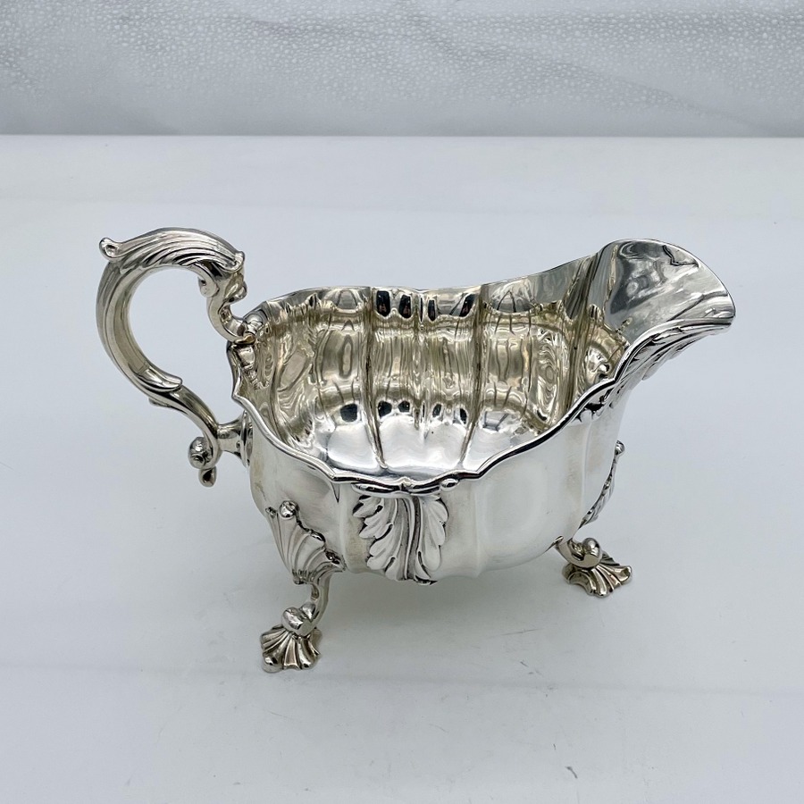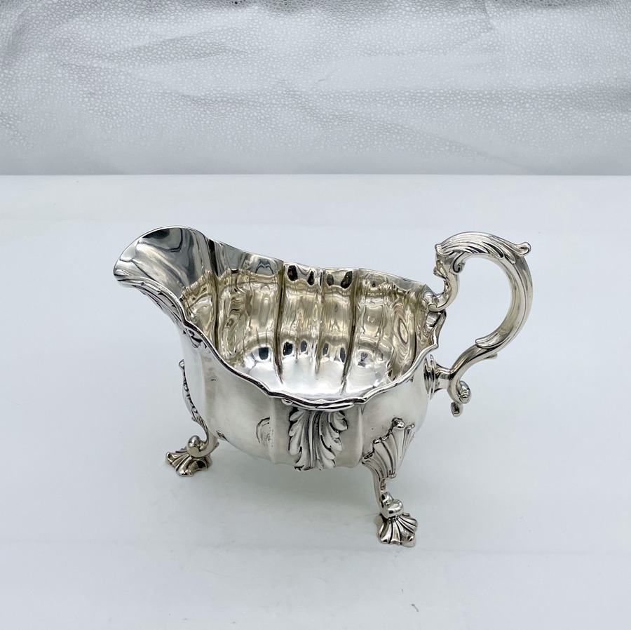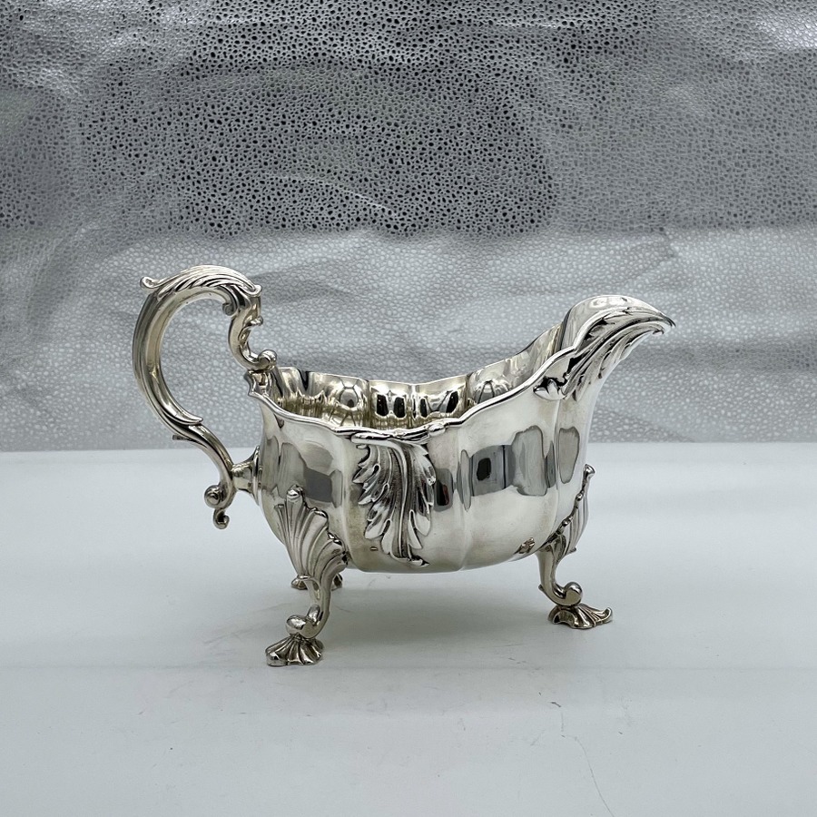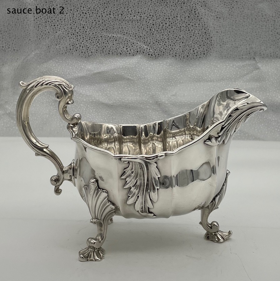A spectacular pair of Victorian silver sauceboats decorated with sumptuous cast draping acanthus leaf motifs and designed with applied cast leaf capped scroll handles.