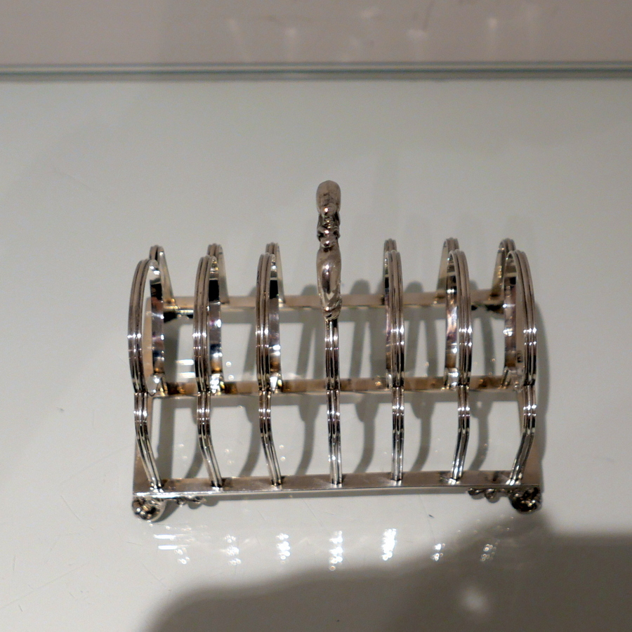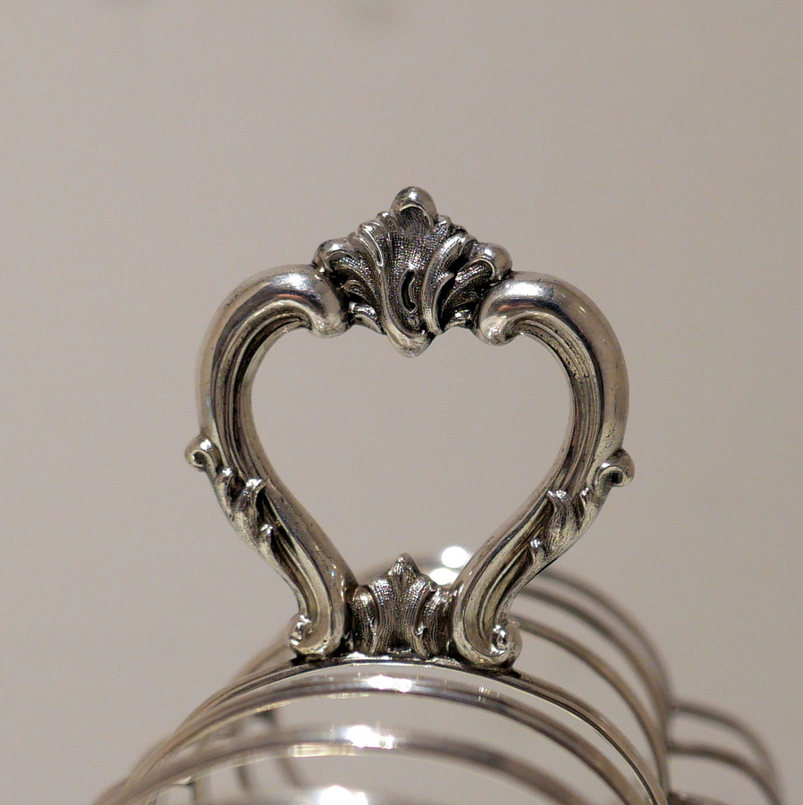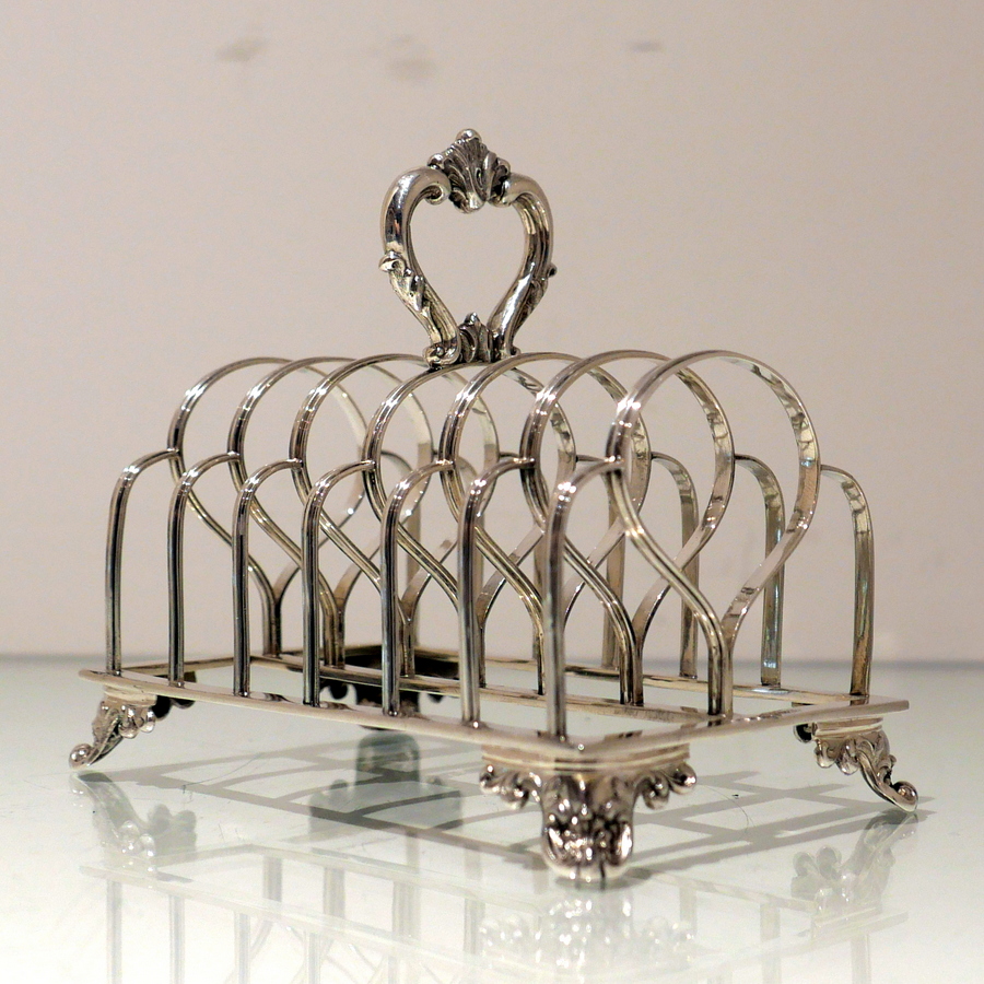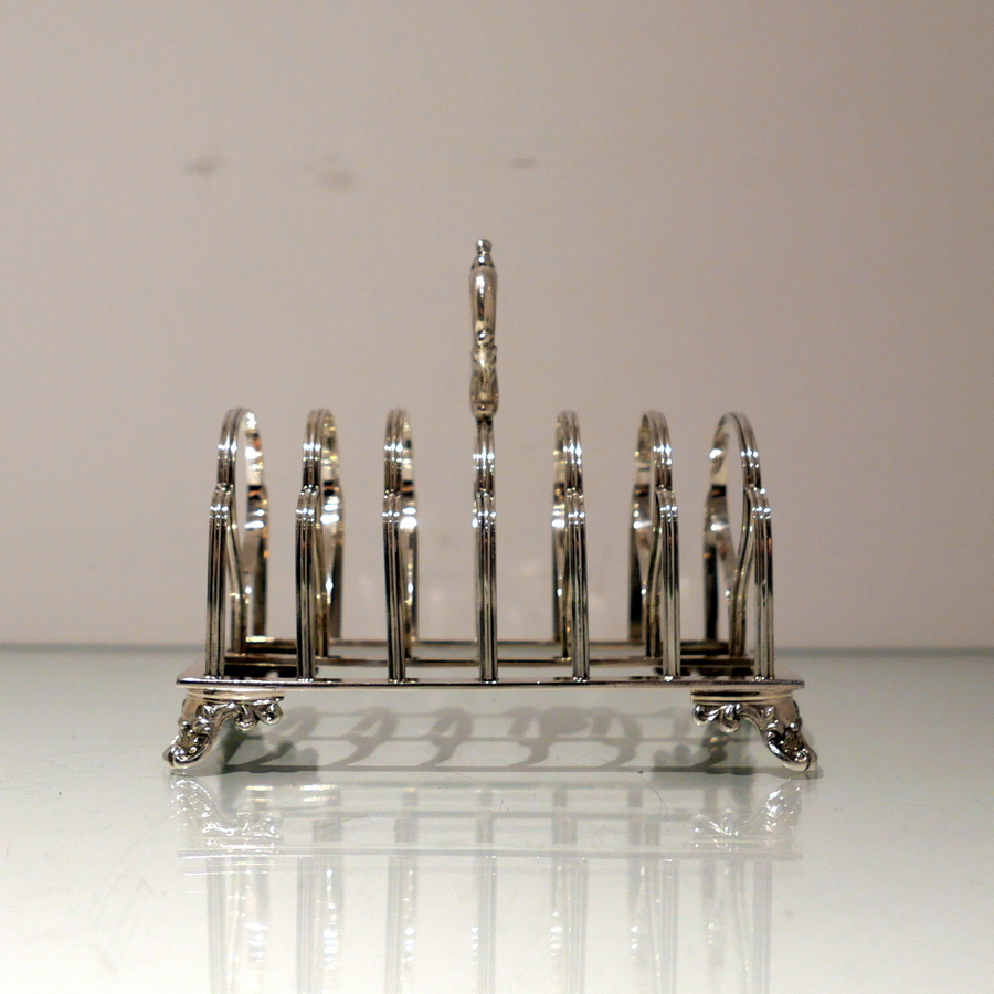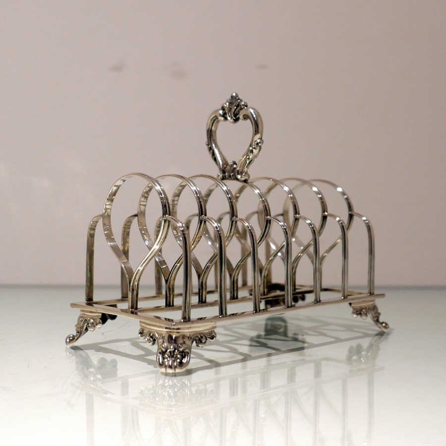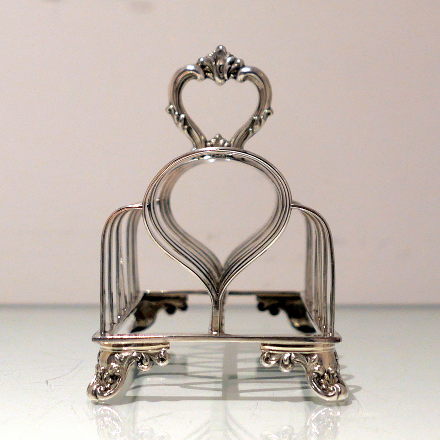 A fine and extremely beautiful Victorian silver toast rack designed with sumptuously shaped silver wires and a stylish centrally placed mast handle. Â The toast rack has six toast slots and stands on four delightful cast feet.