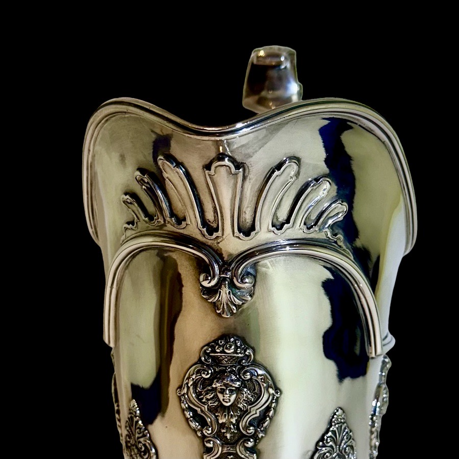A truly fabulous large pair of sterling silver serving jugs designed with decorative strap work bands and stunning acanthus capped floating handles.