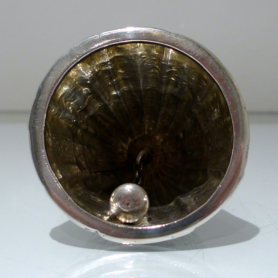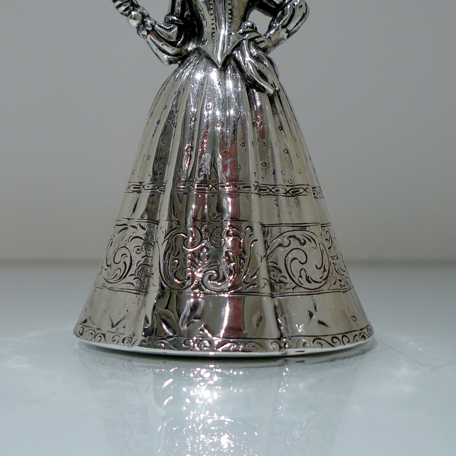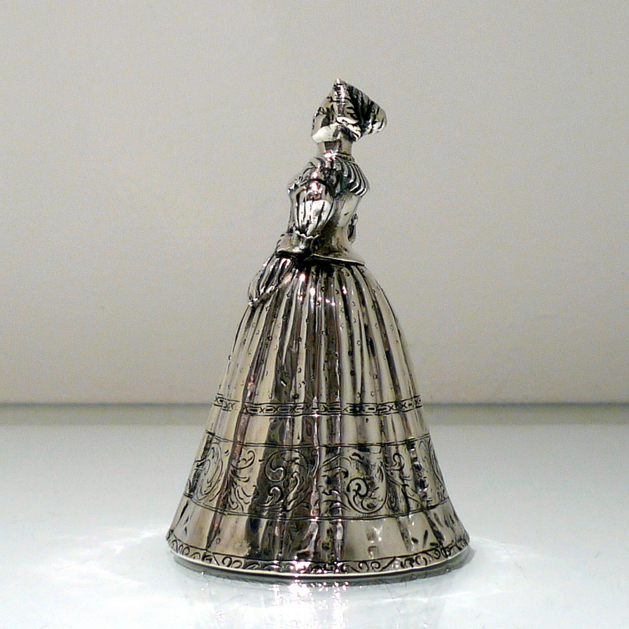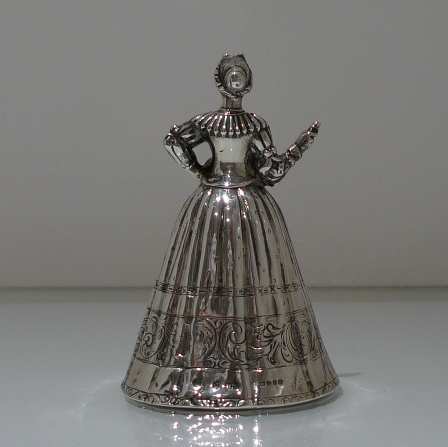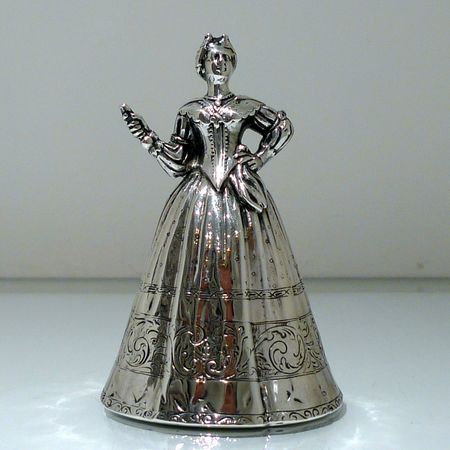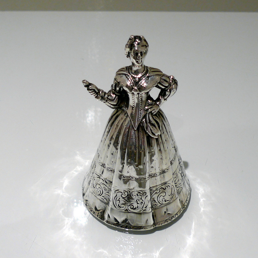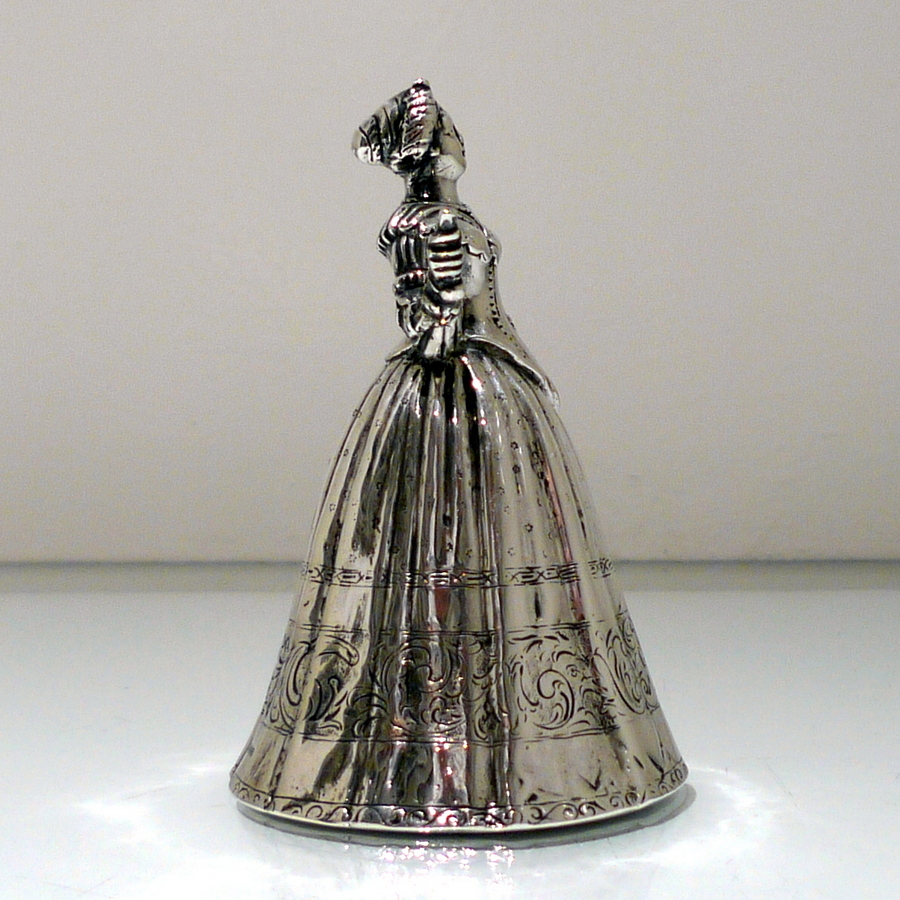 A beautiful import marked Victorian figural bell in the form of a “lady” wearing an impressive bell dress. Â The dress (bowl) is decorated with elegant engraving for lowlights.