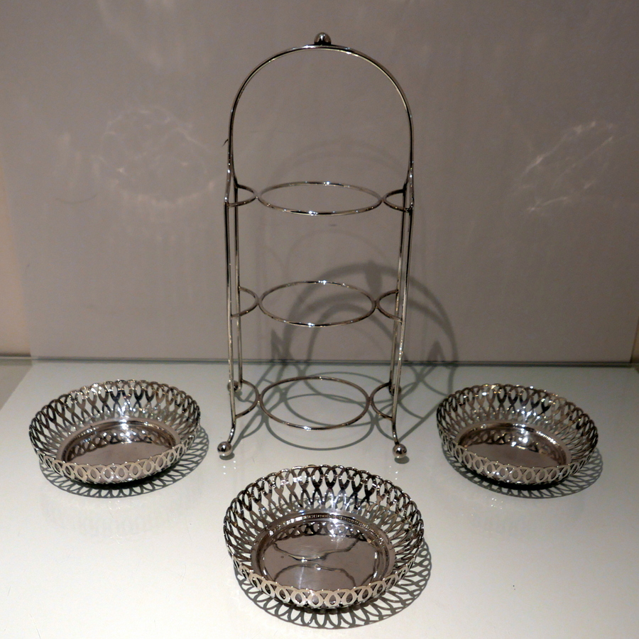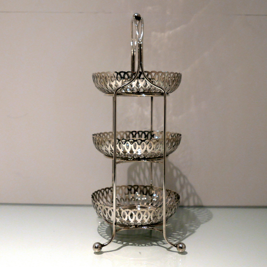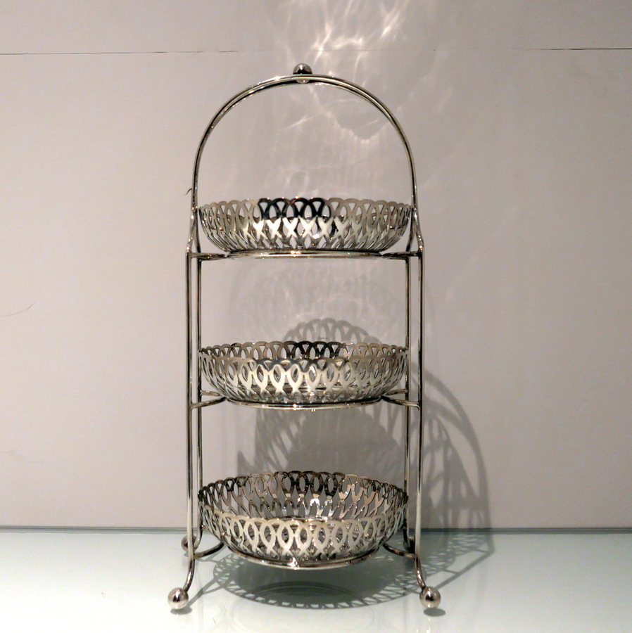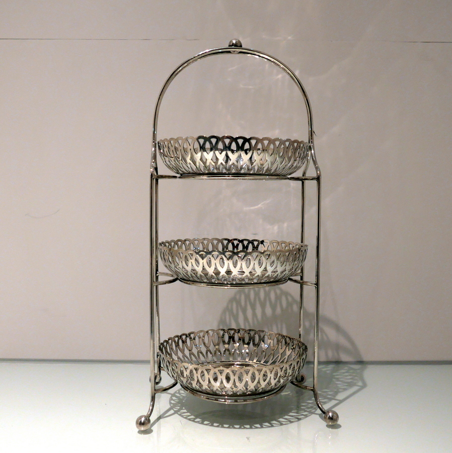 A beautiful Edwardian silverplate three tier cake stand designed with three stylish lattice work detachable circular dishes and an elegant wire work frame.