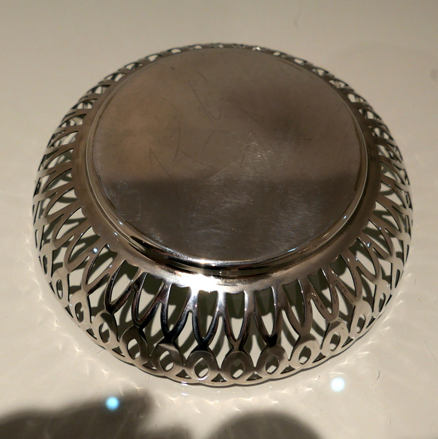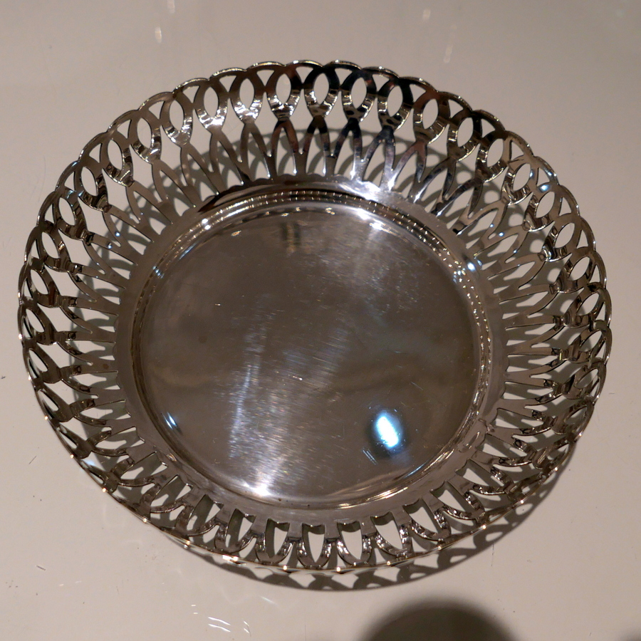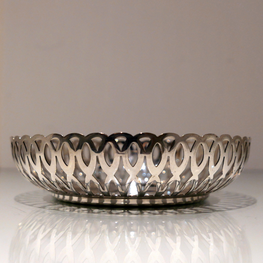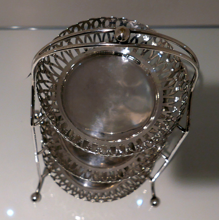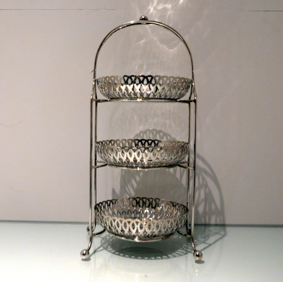 A beautiful Edwardian silverplate three tier cake stand designed with three stylish lattice work detachable circular dishes and an elegant wire work frame.