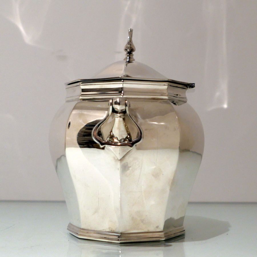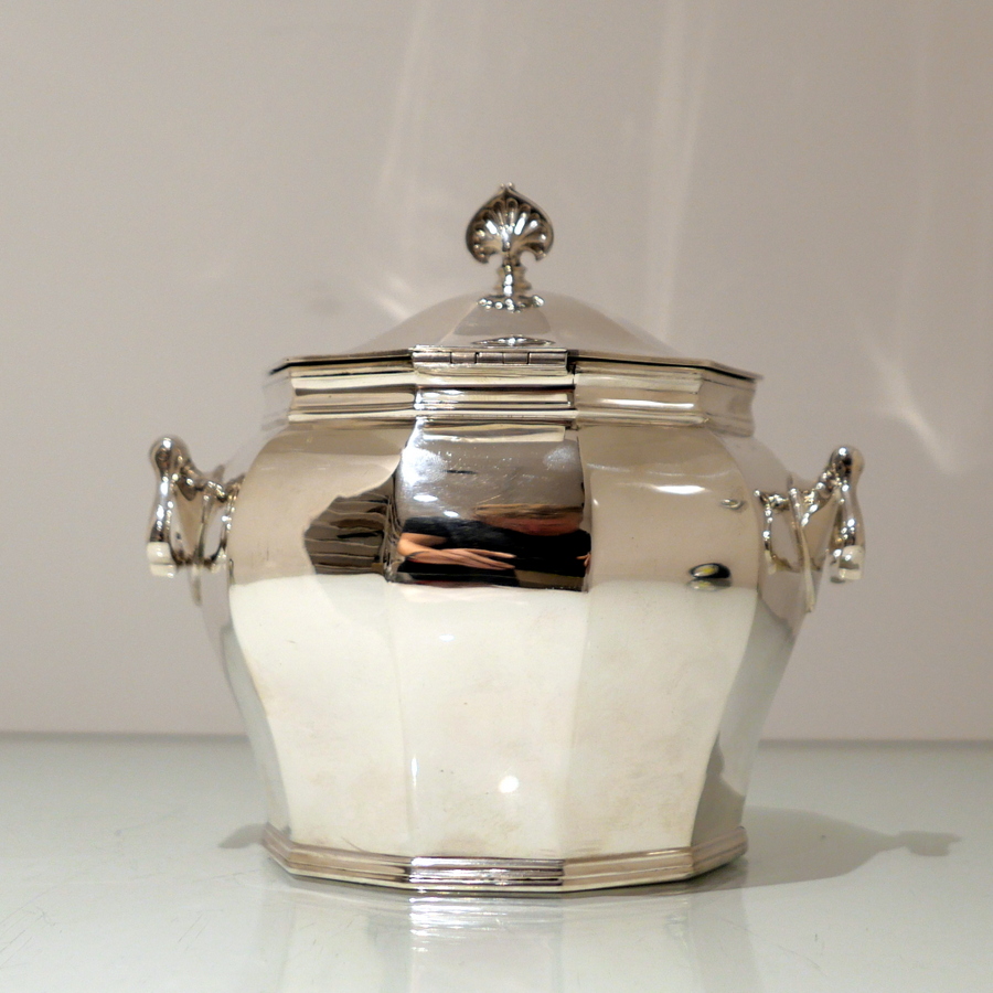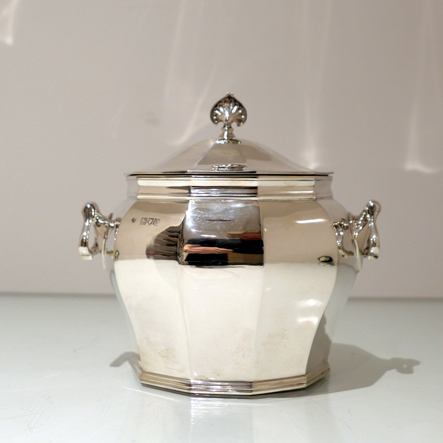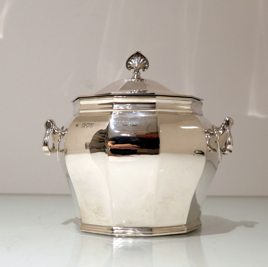 A truly fine late Victorian sterling silver shaped oval biscuit box elegantly plain formed in style and designed with a delightful ‘boxwaisted’ panelled body. Â The elegantly domed lid is hinged and crowned with a beautiful finial.