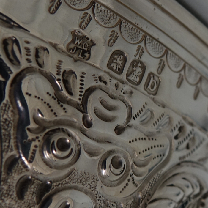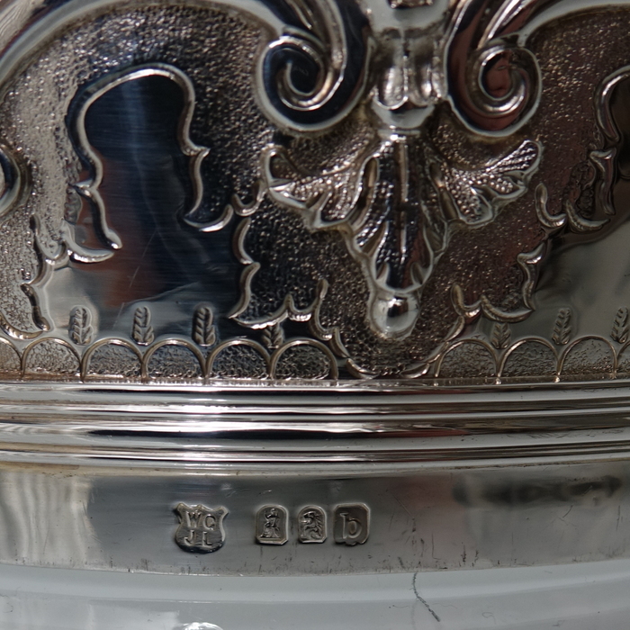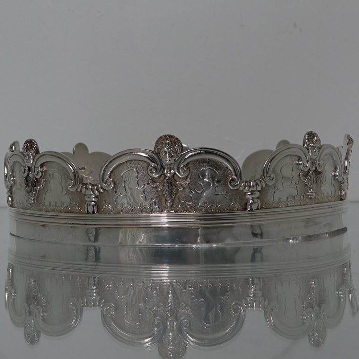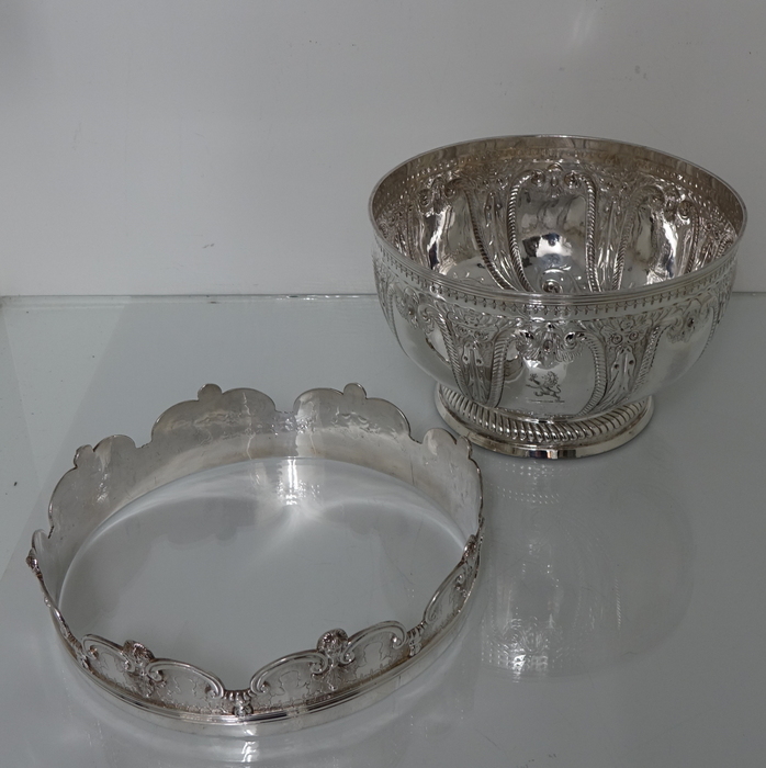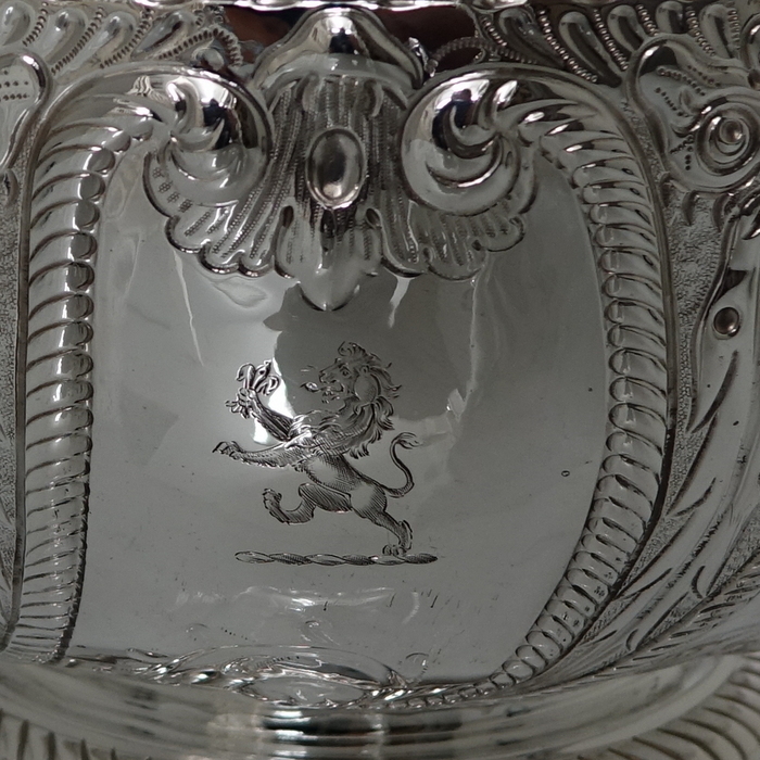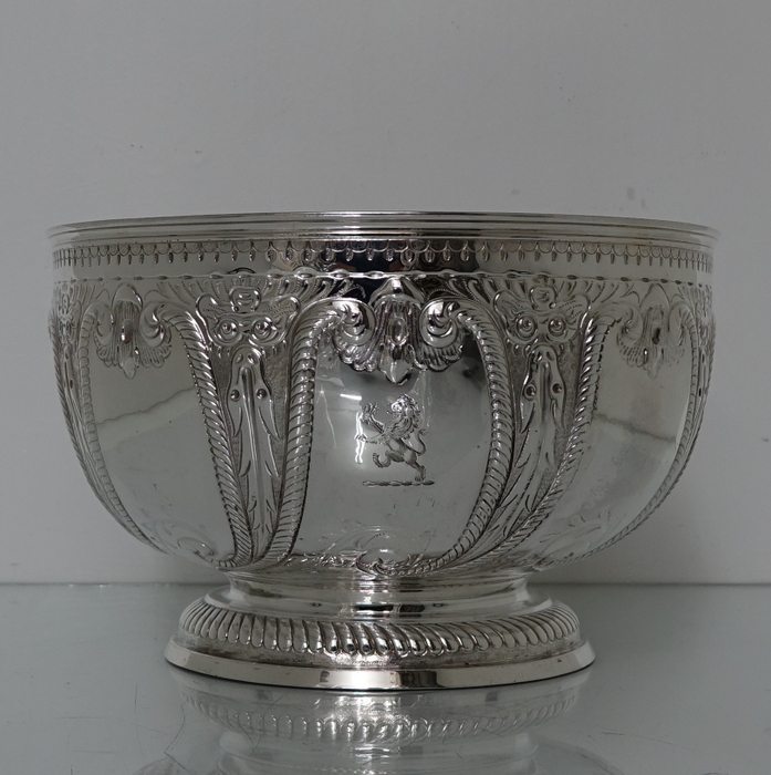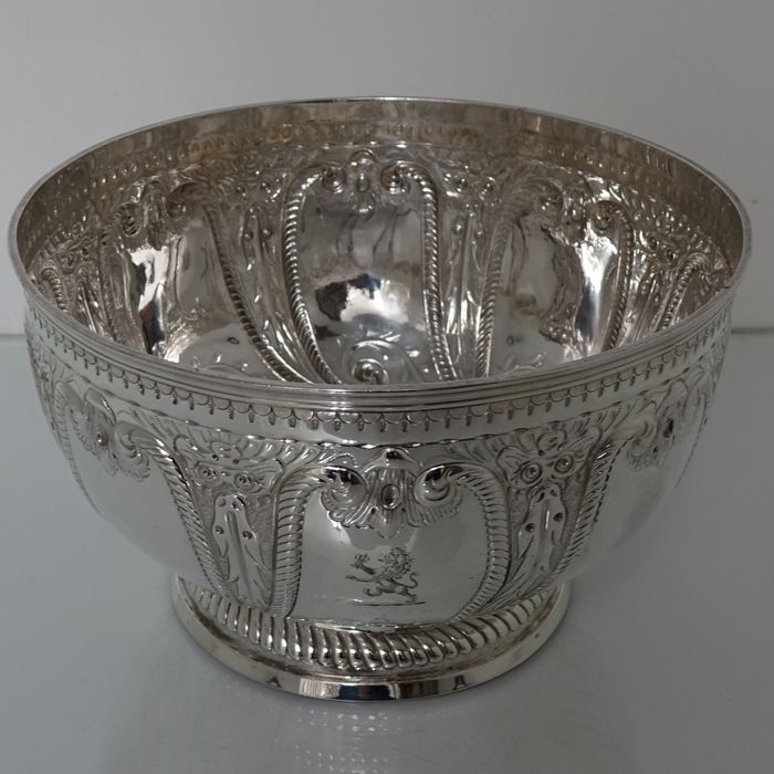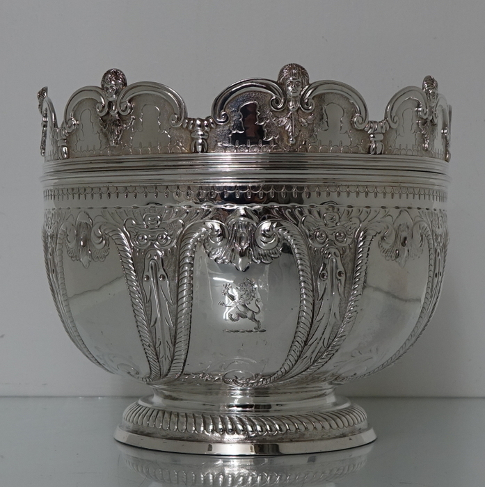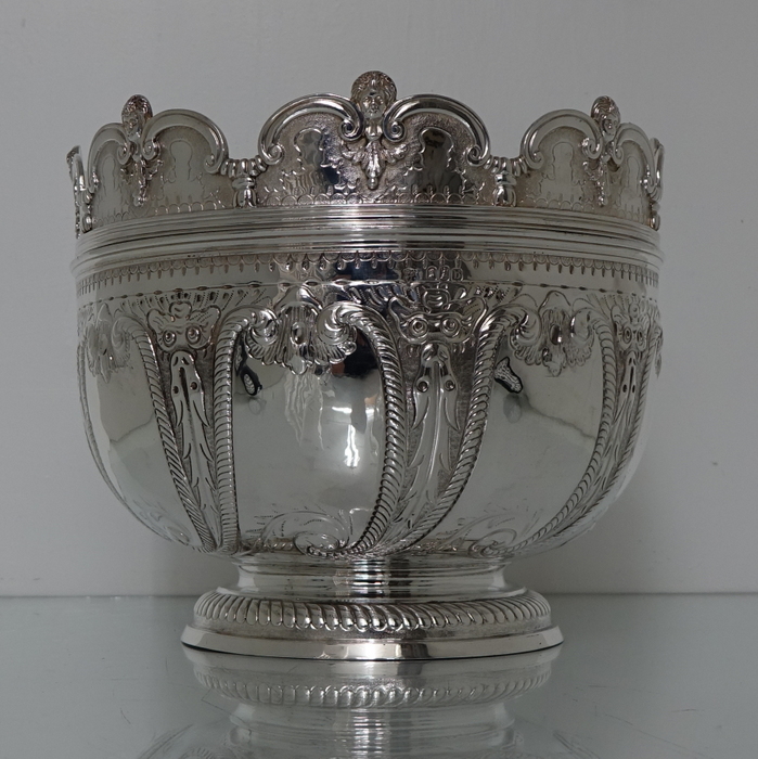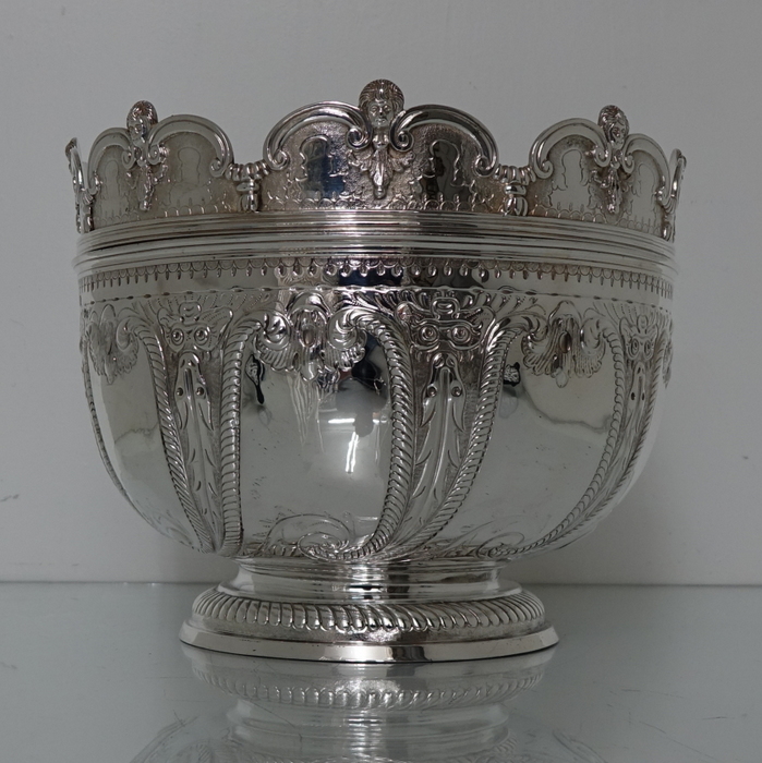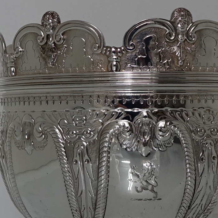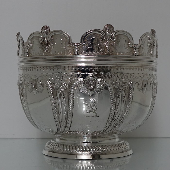 A very elegant large silver Monteith bowl, circular in design with floral embossing set on a matt background entwined around plain formed panels for decoration. Â The bowl sits on a gadroon pedestal foot and the cape is detachable with acanthus leaf and cherub faces for highlights. Â The center front of the bowl has a elegant contemporary crest for importance.
