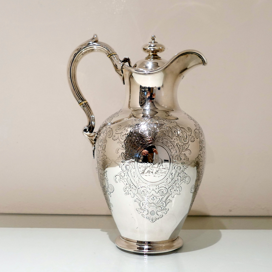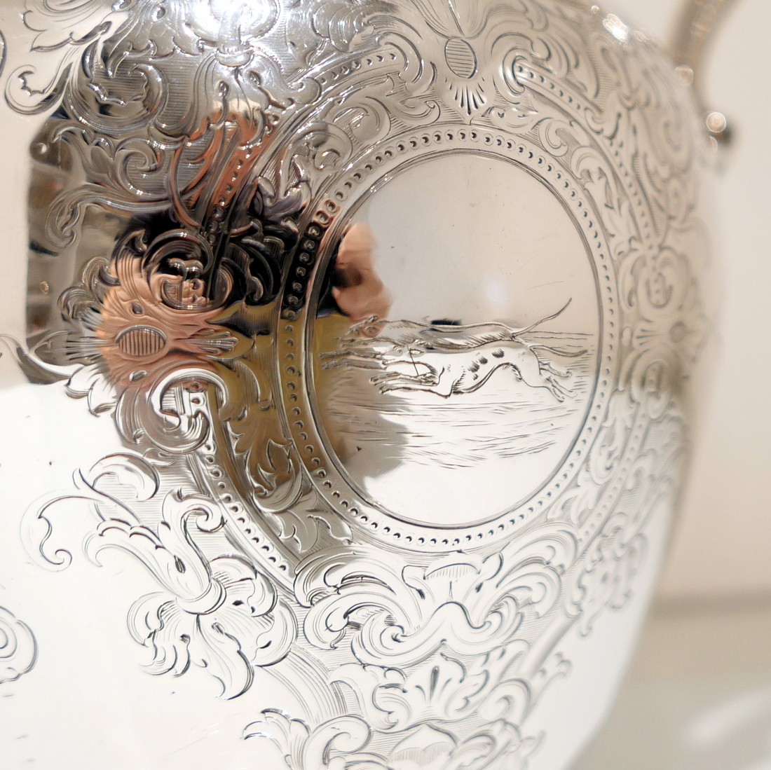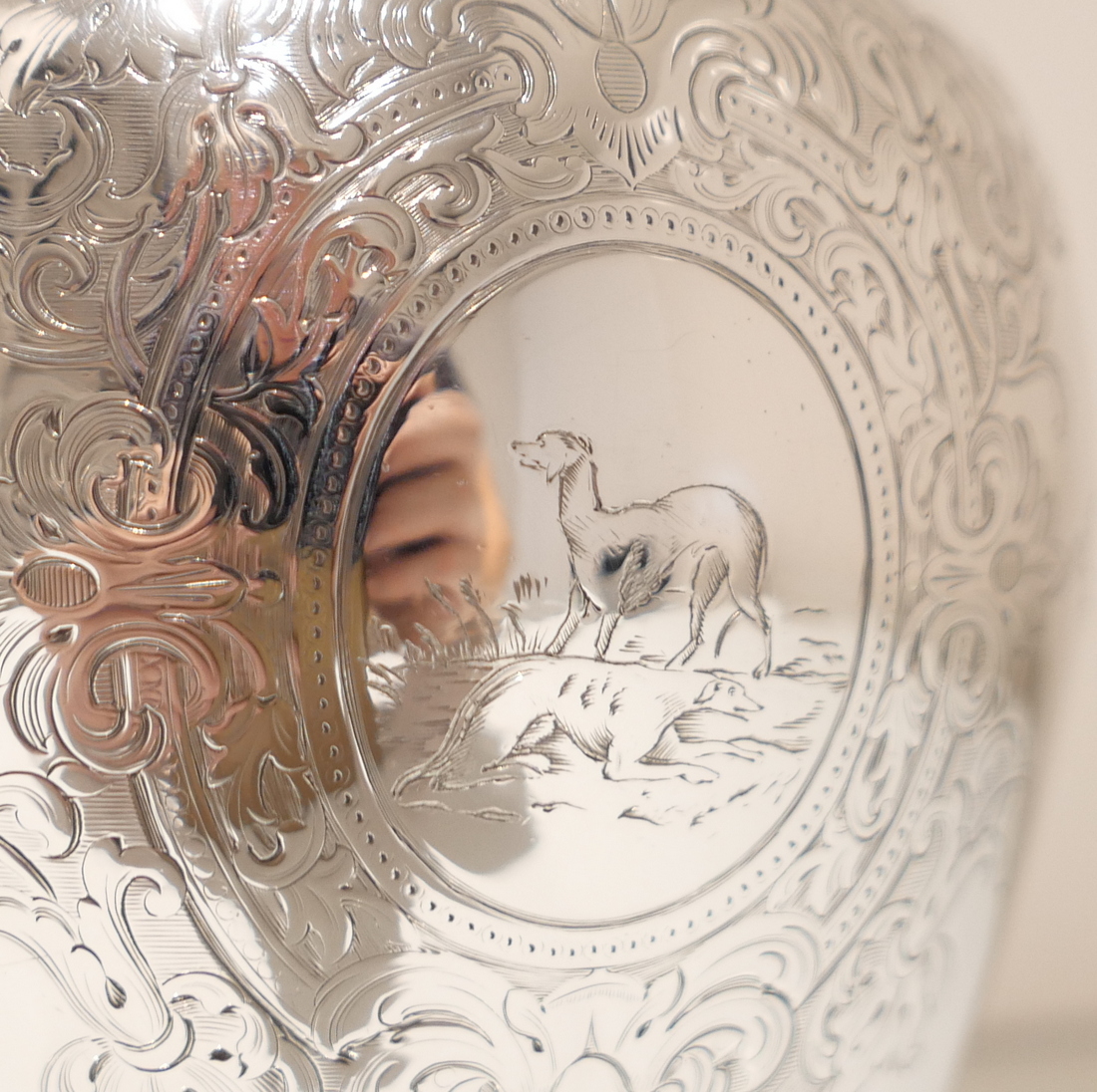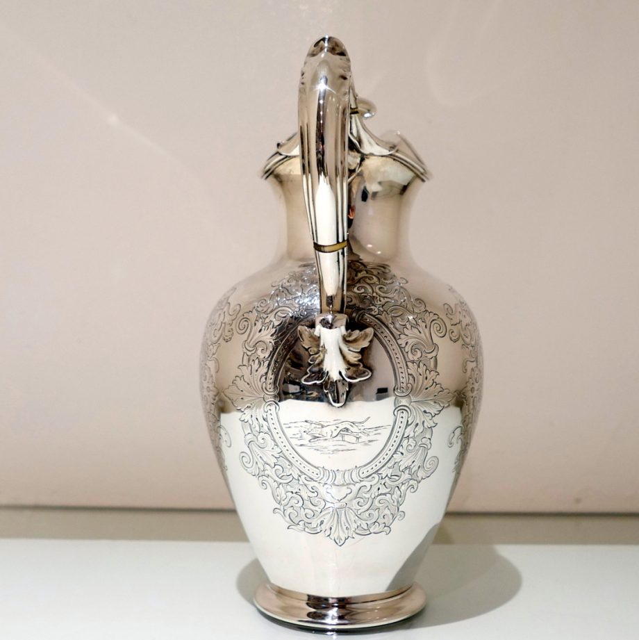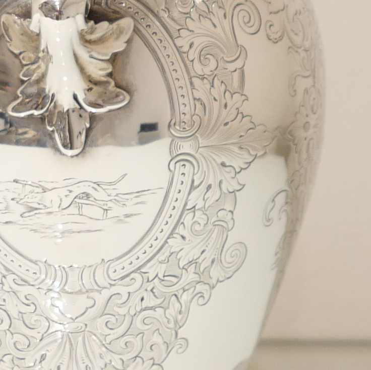 A delightful mid 19th century sterling silver hot water jug, bulbous in design and decorated with elegant “framed” engraved cartouches which sprout elegant foliate decoration. Â The inner cartouches are engraved with stylish scenes of random dog behaviour set on a rural back drop.