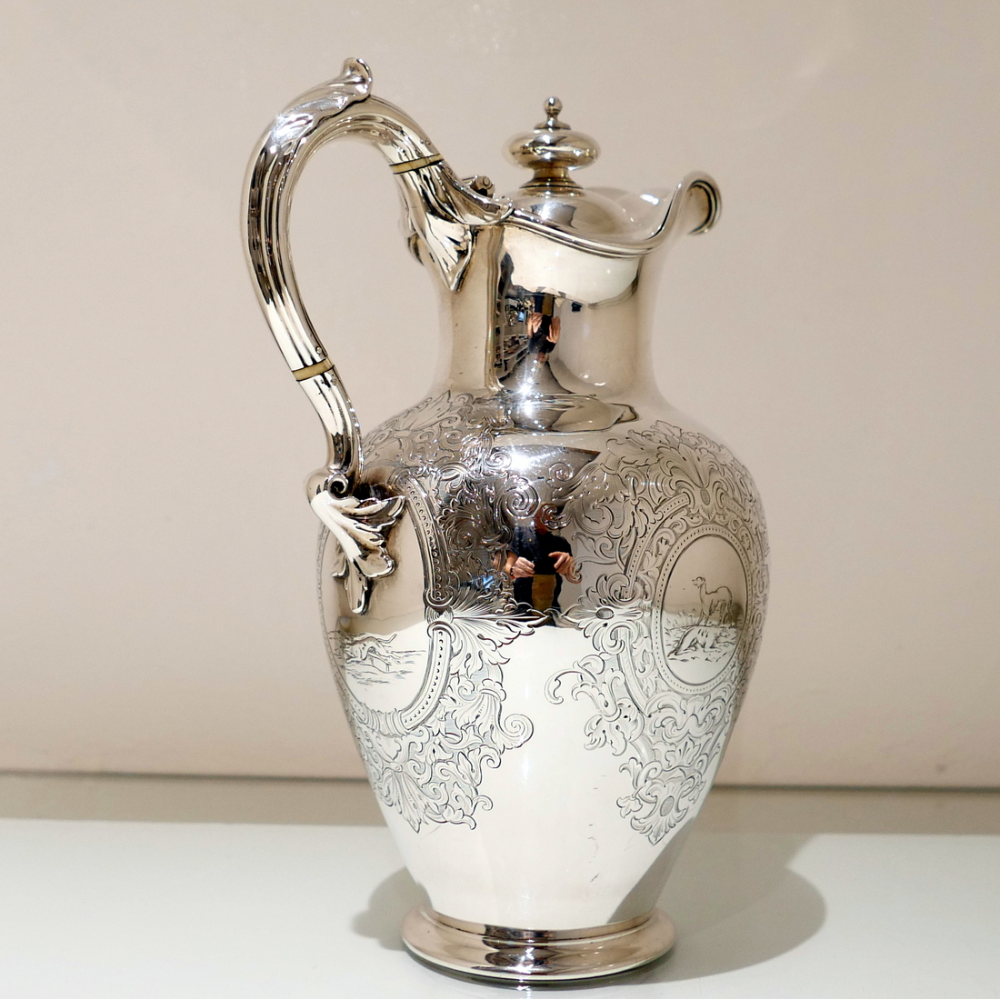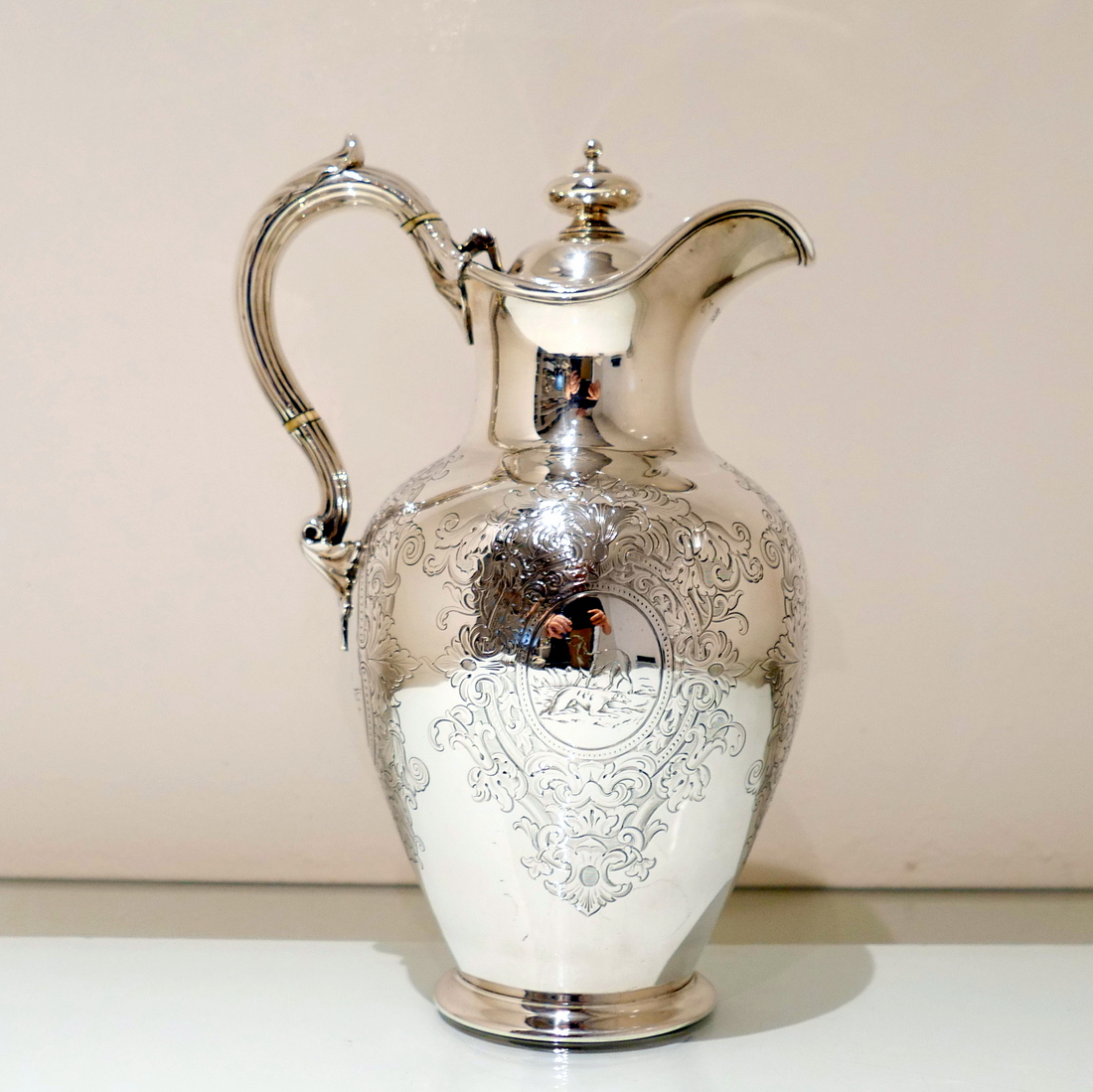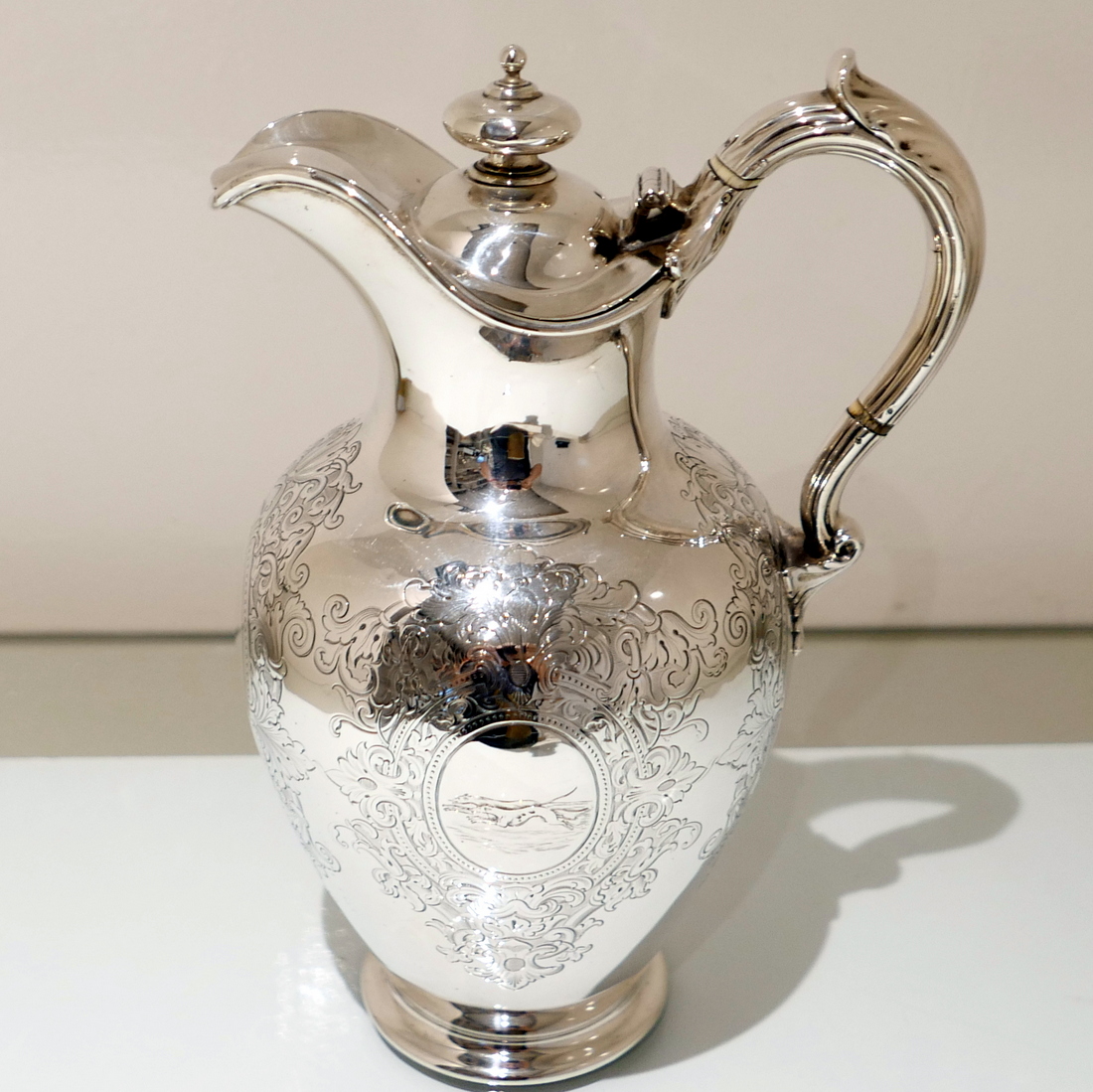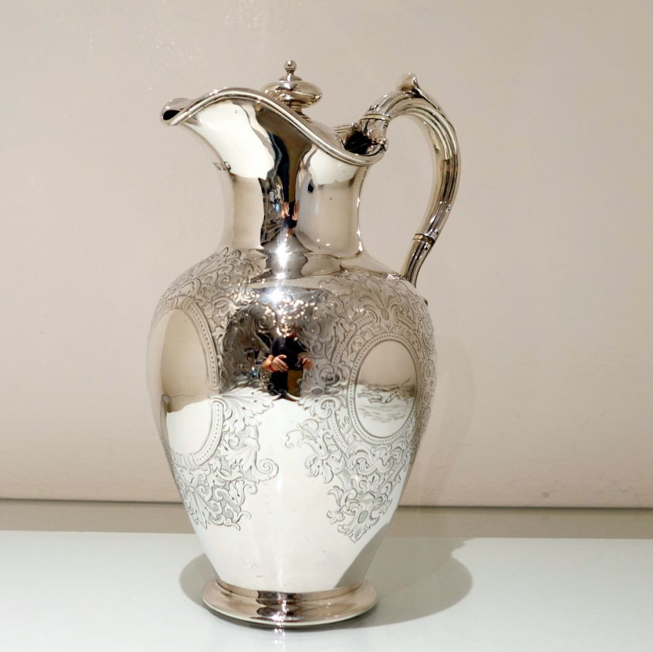 A delightful mid 19th century sterling silver hot water jug, bulbous in design and decorated with elegant “framed” engraved cartouches which sprout elegant foliate decoration. Â The inner cartouches are engraved with stylish scenes of random dog behaviour set on a rural back drop.