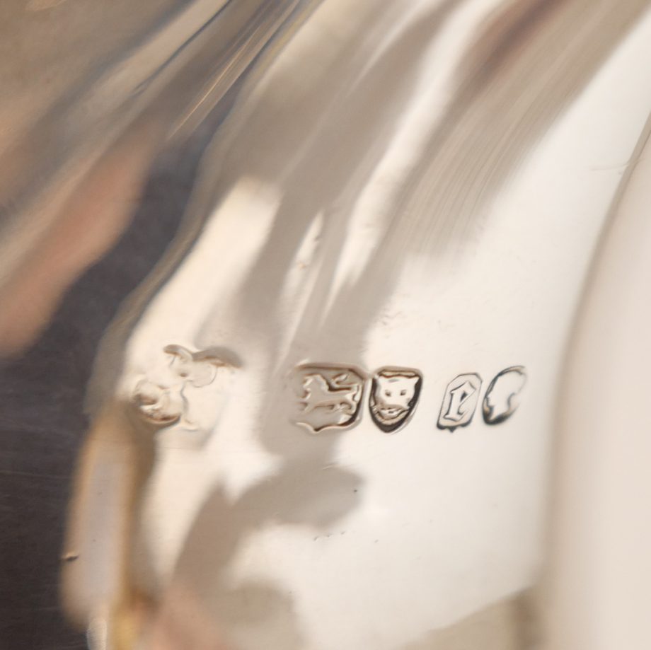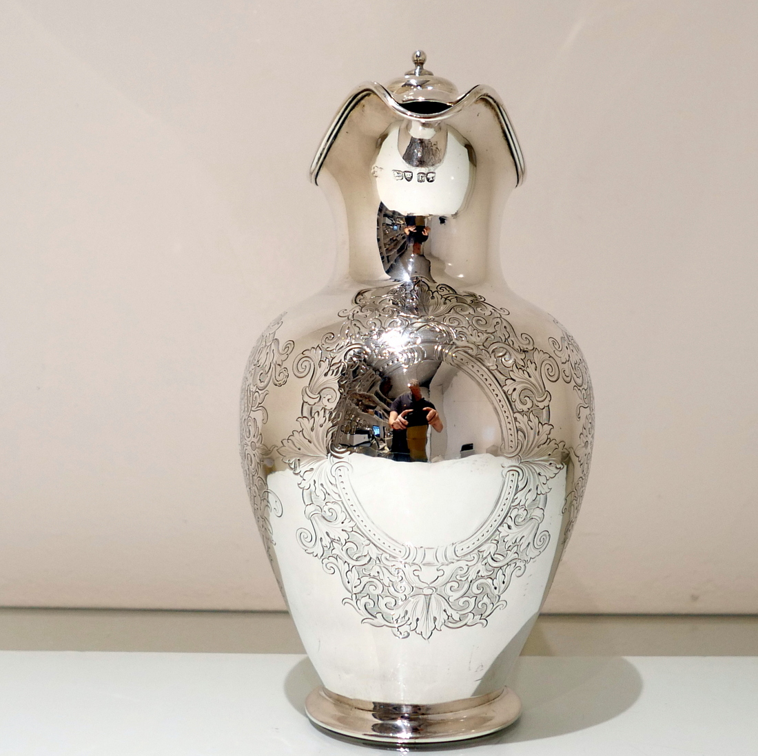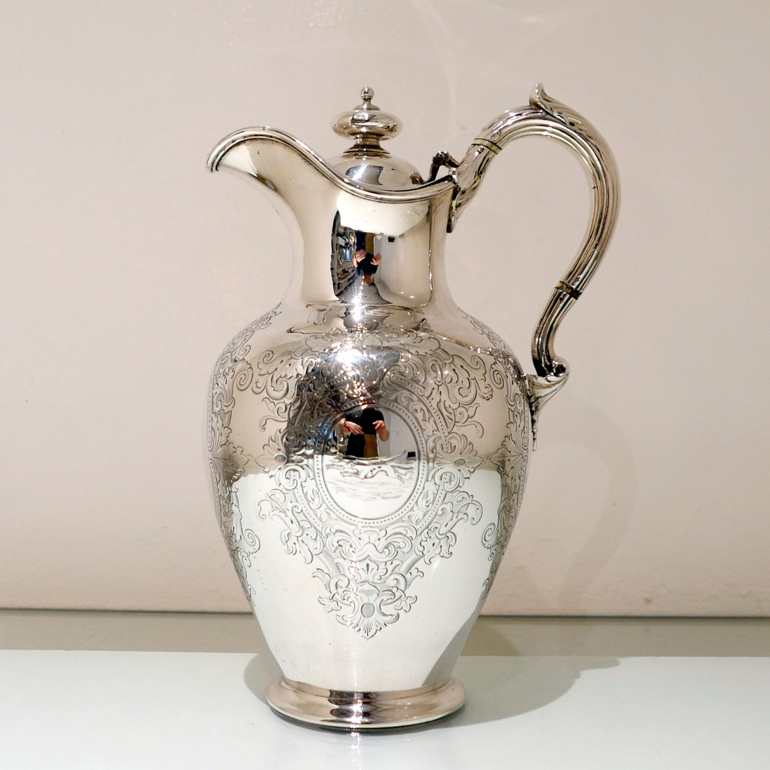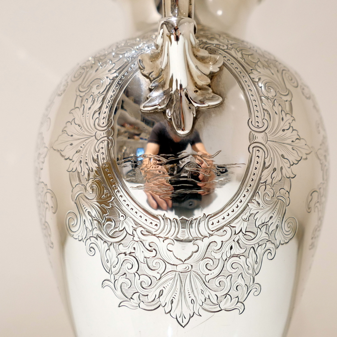 A delightful mid 19th century sterling silver hot water jug, bulbous in design and decorated with elegant “framed” engraved cartouches which sprout elegant foliate decoration. Â The inner cartouches are engraved with stylish scenes of random dog behaviour set on a rural back drop.
