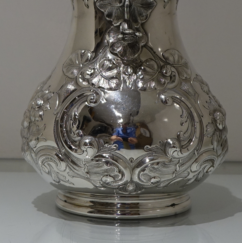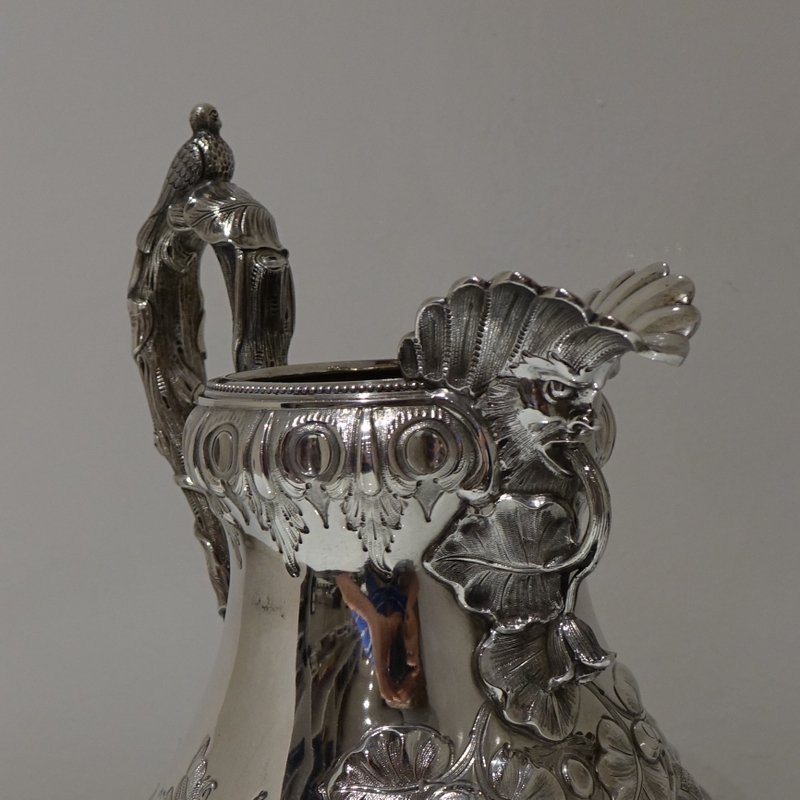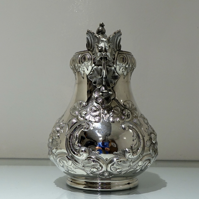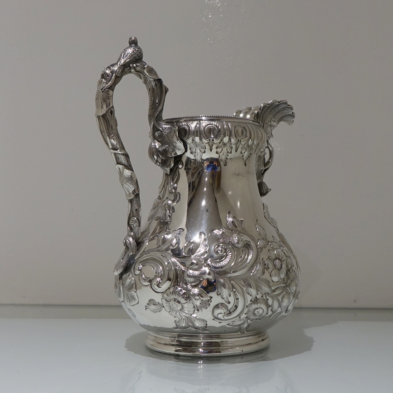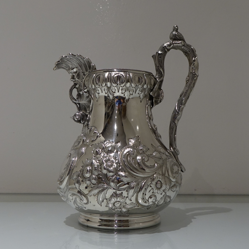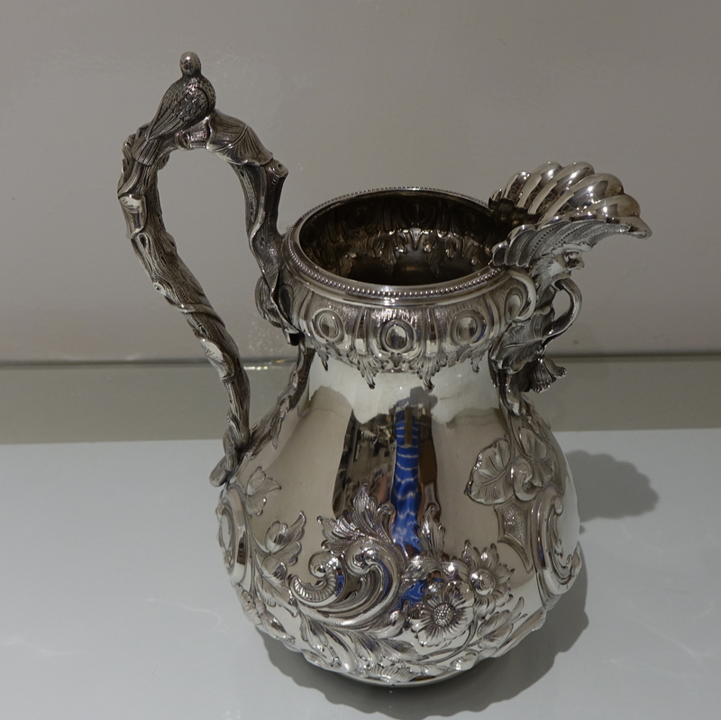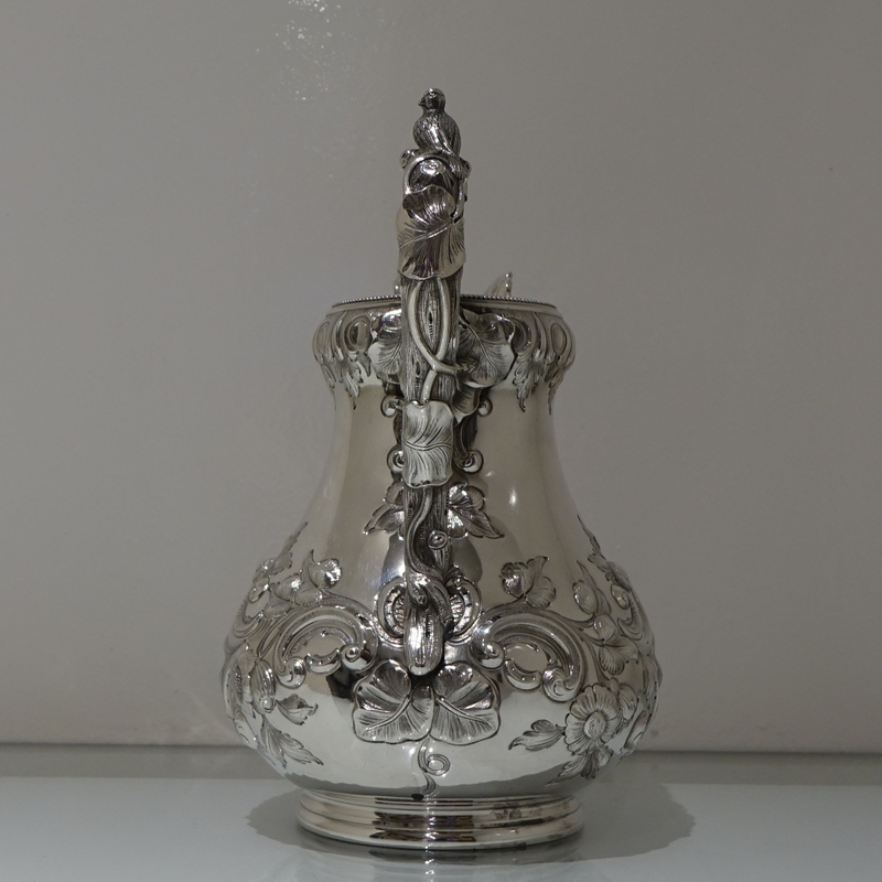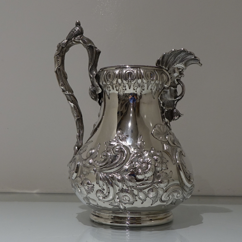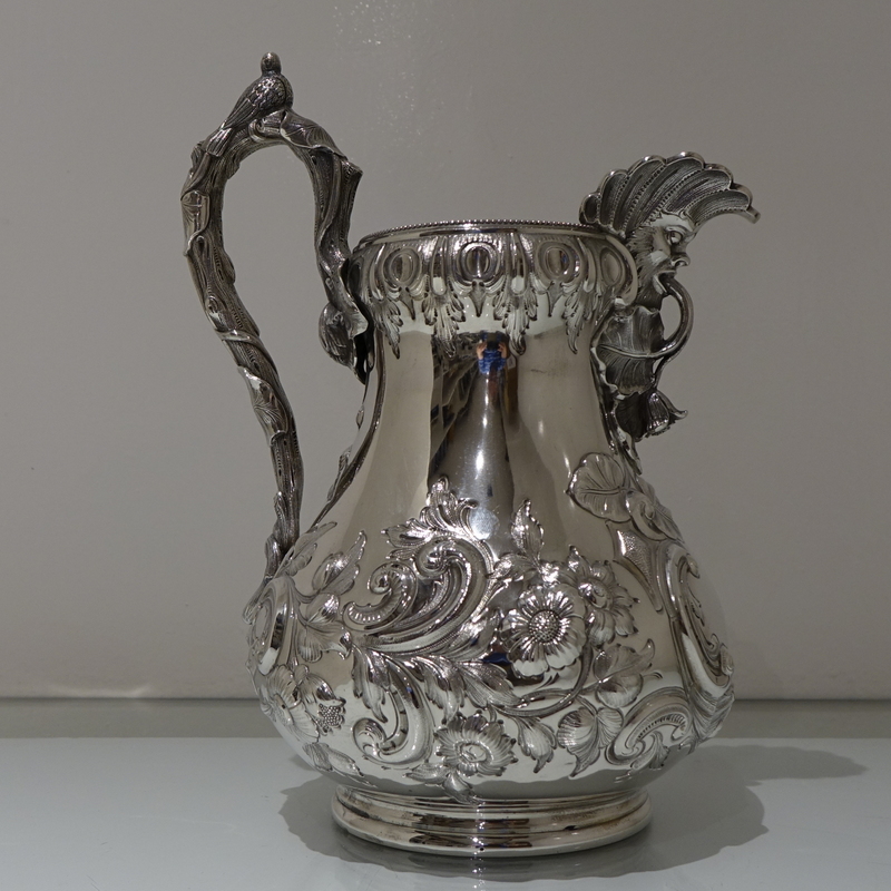 A large and stunning quality mid 19th century bead bordered baluster wine jug decorated with superb floral embossing throughout. Â The naturalistic scroll handle is exceptionally designed and has a “bird” mounted thumb piece.