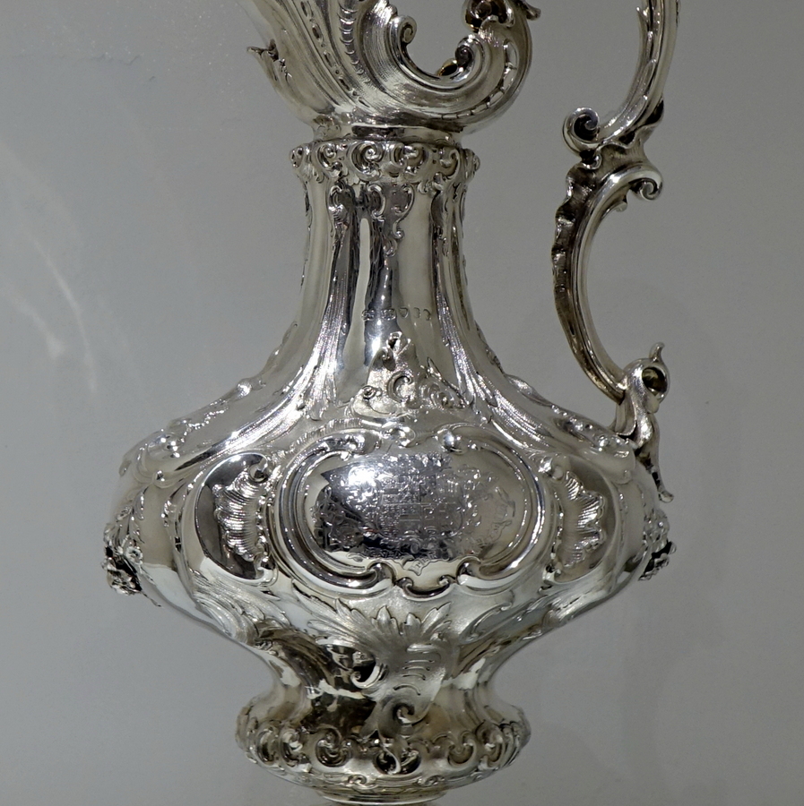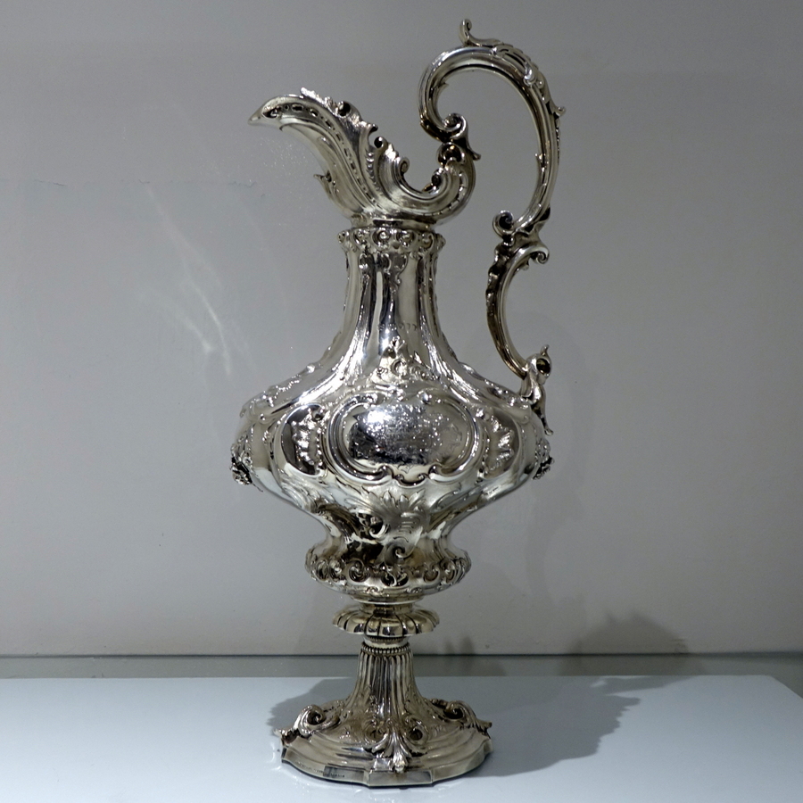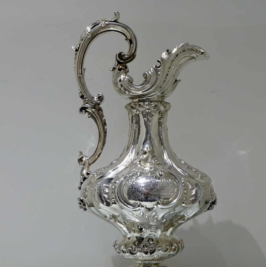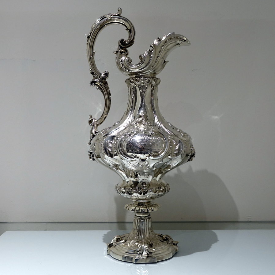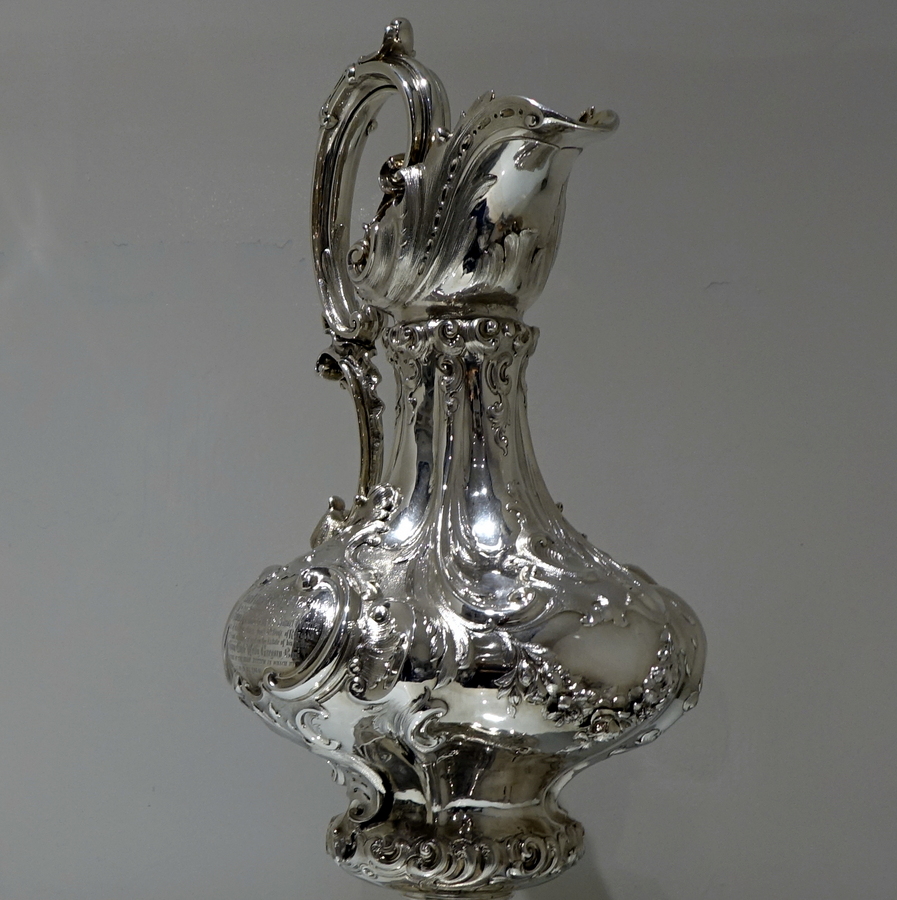 A truly magnificent and incredibly large wine ewer displaying inspired use of the scroll designs. Â The splendidly decorative bulbous body has a double cartouche in which sits a contemporary presentation inscription and a stylish contemporary armorial. Â The shaped circular raised pedestal foot is decorated with flowing fluted cascades and applied cast motifs for lowlights.