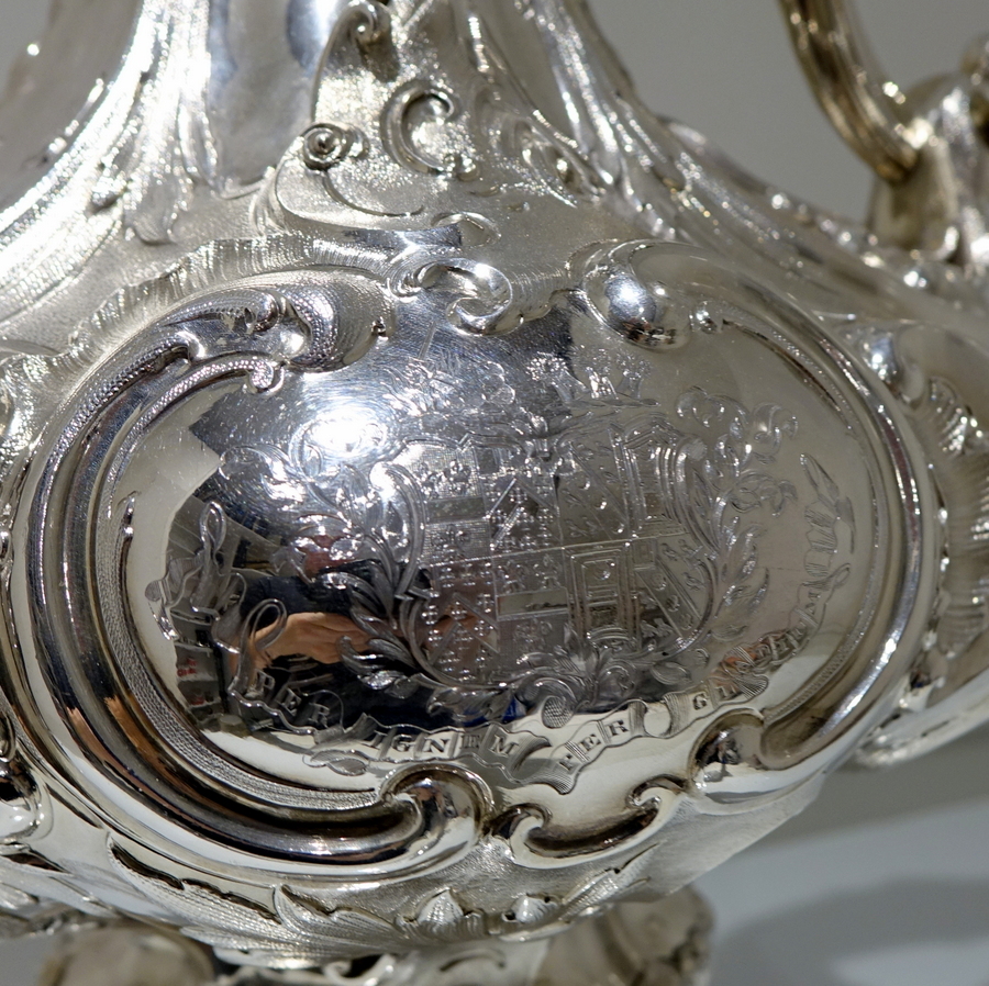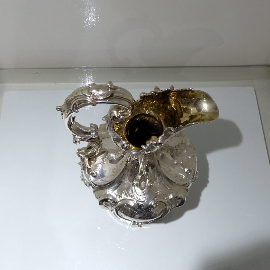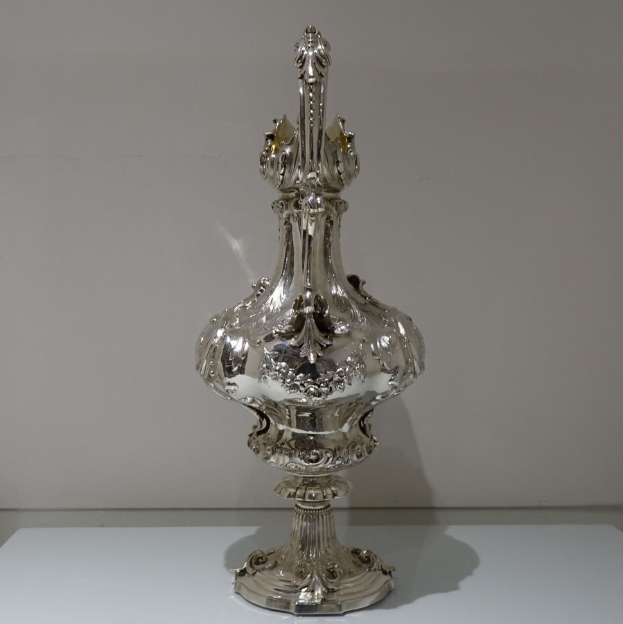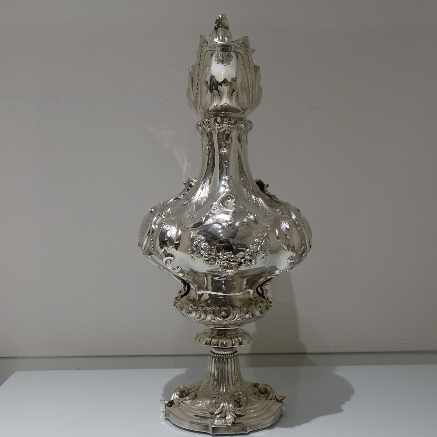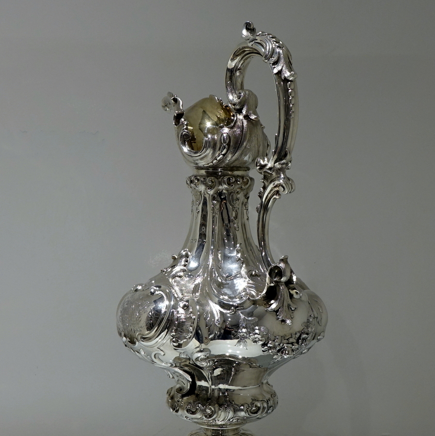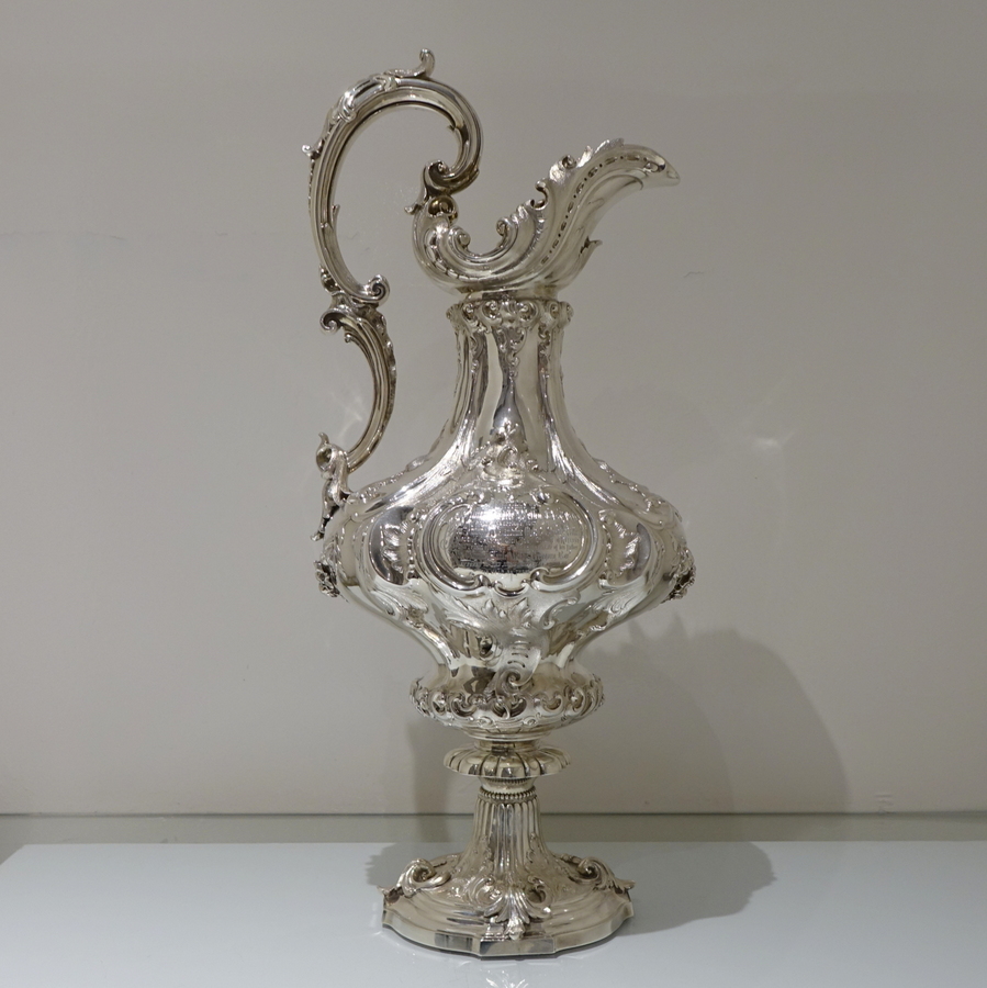 A truly magnificent and incredibly large wine ewer displaying inspired use of the scroll designs. Â The splendidly decorative bulbous body has a double cartouche in which sits a contemporary presentation inscription and a stylish contemporary armorial. Â The shaped circular raised pedestal foot is decorated with flowing fluted cascades and applied cast motifs for lowlights.
