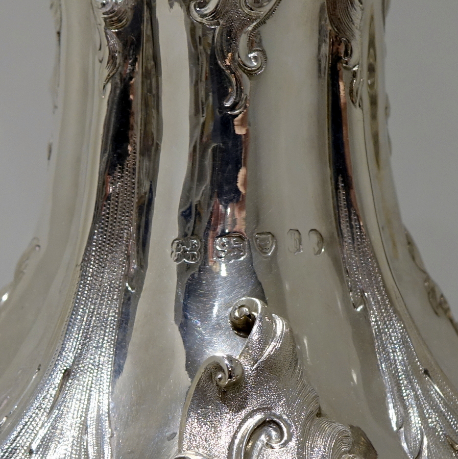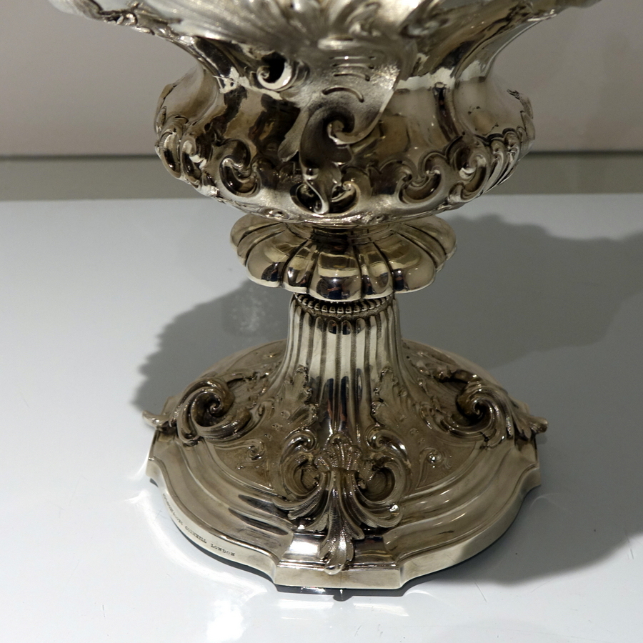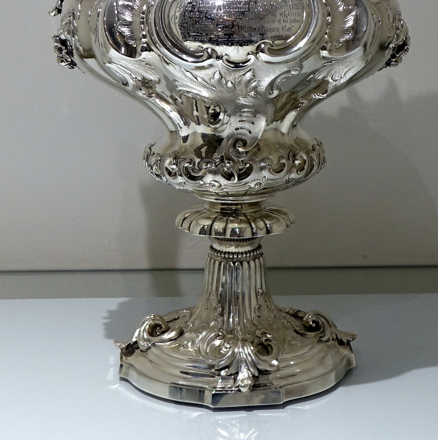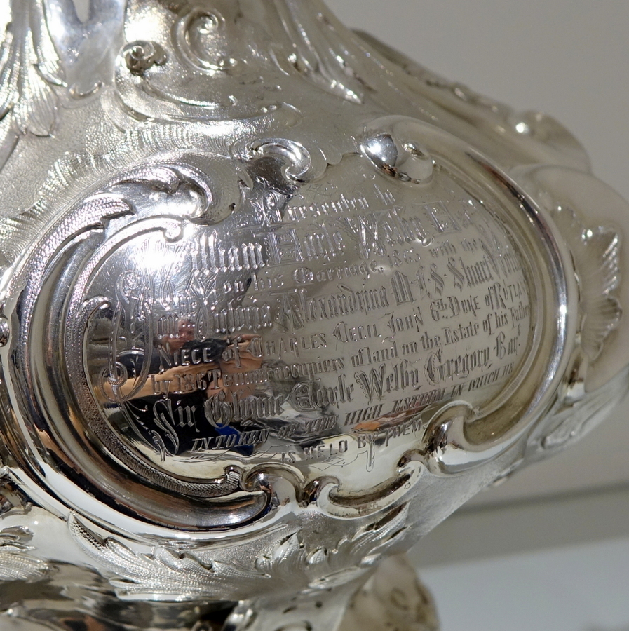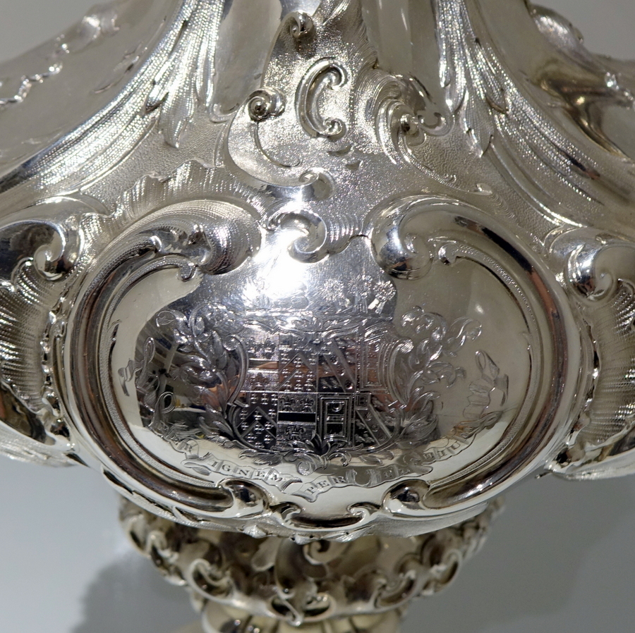 A truly magnificent and incredibly large wine ewer displaying inspired use of the scroll designs. Â The splendidly decorative bulbous body has a double cartouche in which sits a contemporary presentation inscription and a stylish contemporary armorial. Â The shaped circular raised pedestal foot is decorated with flowing fluted cascades and applied cast motifs for lowlights.