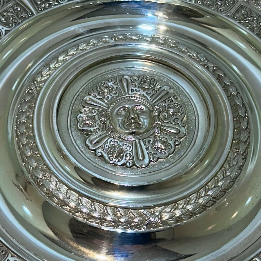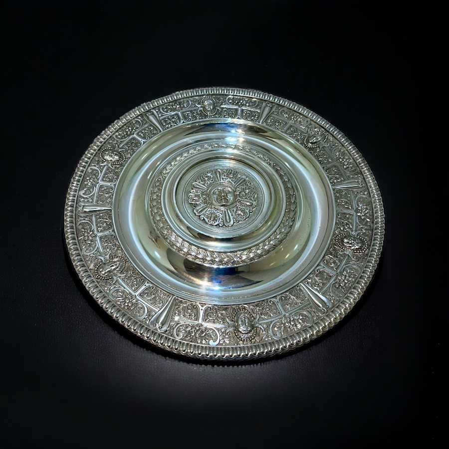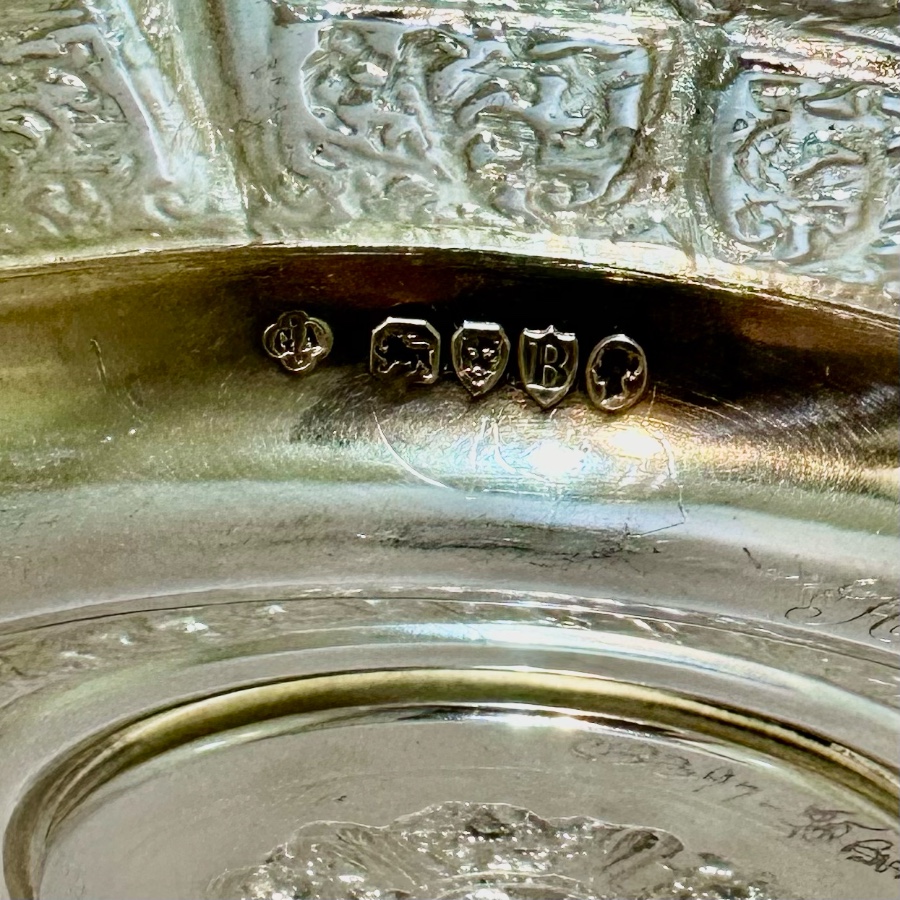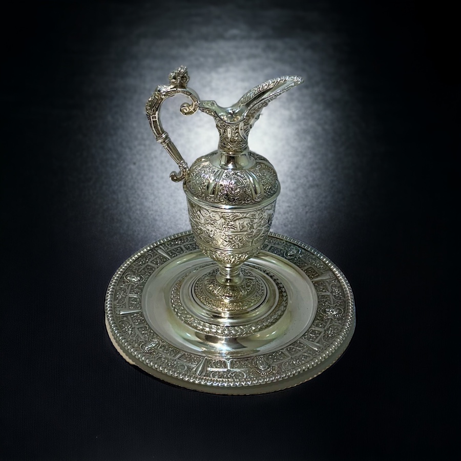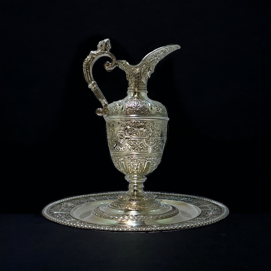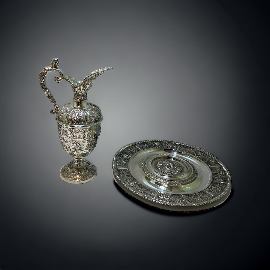 Note:Â Wine ewer London 1863 and the charger is London 1877 both made by George Angell.
