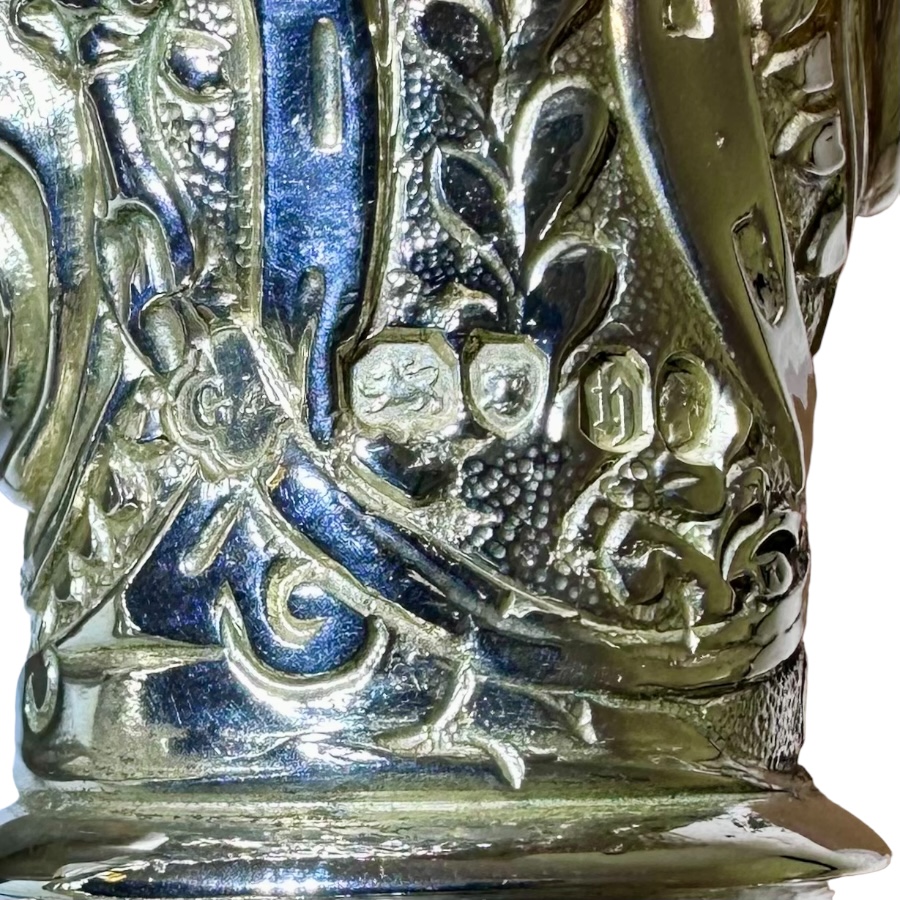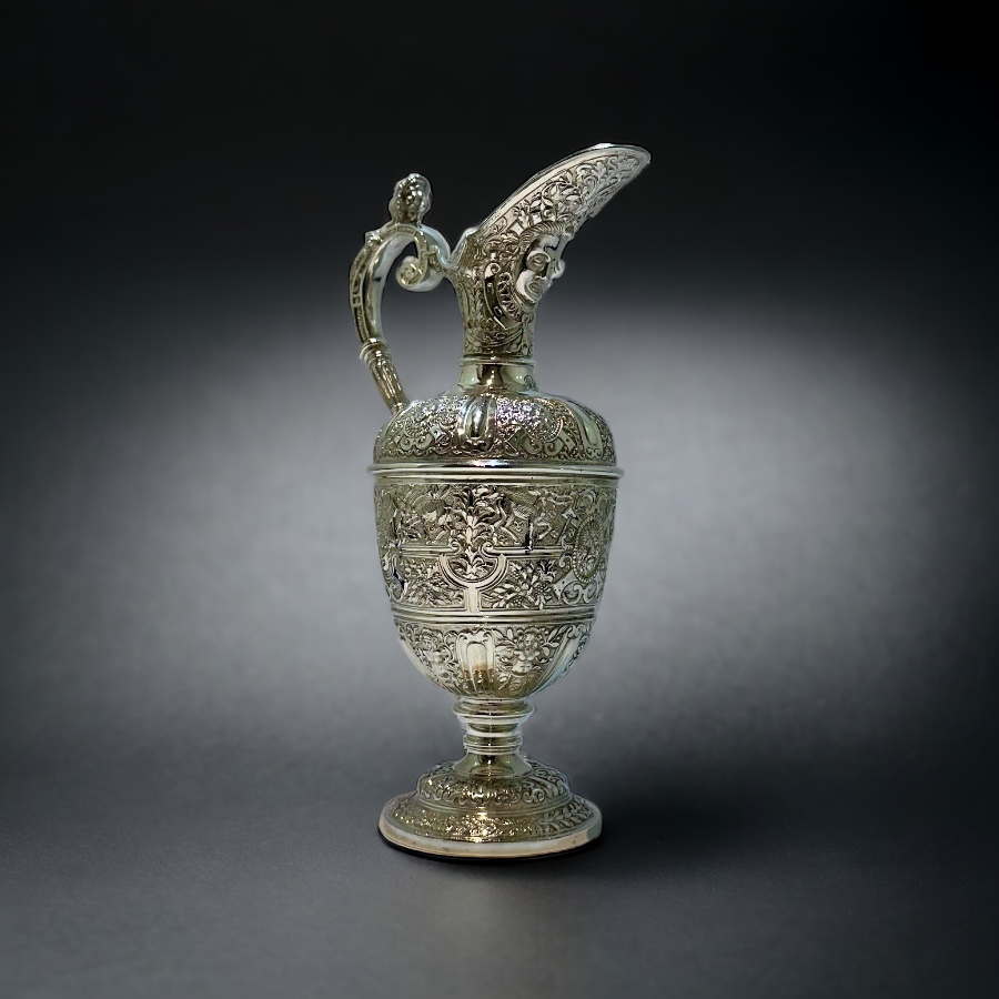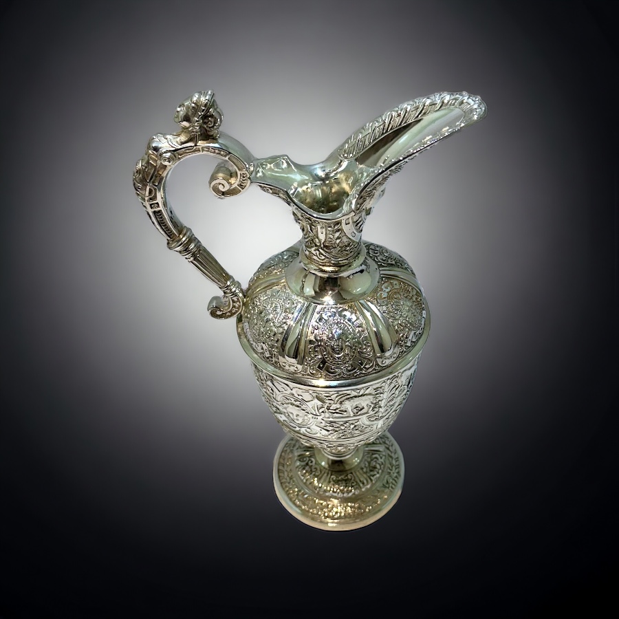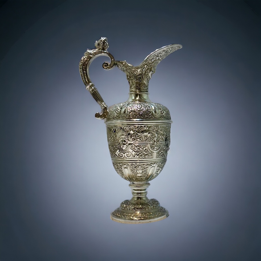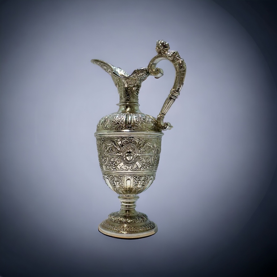 An incredibly rare and Cellini patterned Victorian silver wine ewer on stand inspired by the highly significant Renaissance orginals. The overall decorative detailing is typical (Cellini) with elegant designs of scrolling foliage, fruit, faces and animals.