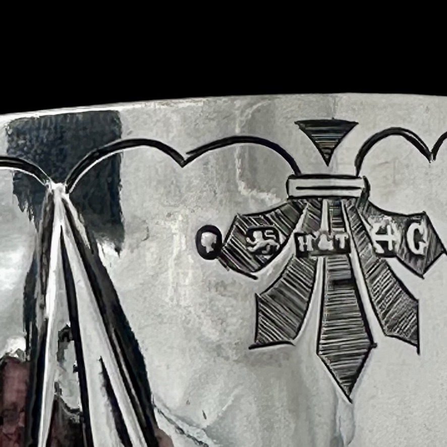 Rare silver christenig mug decorated with classic Gothic architectural asymmetry beautifully portrayed with hand raised pointed arches and elegant hand etched pointing arrows.
