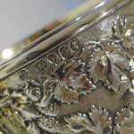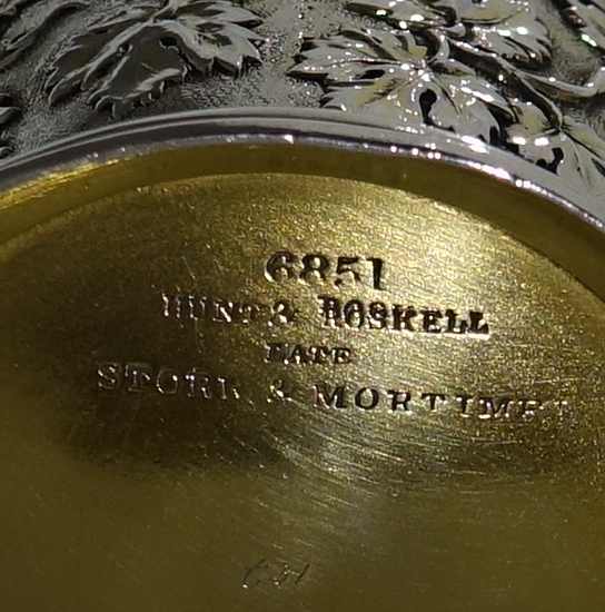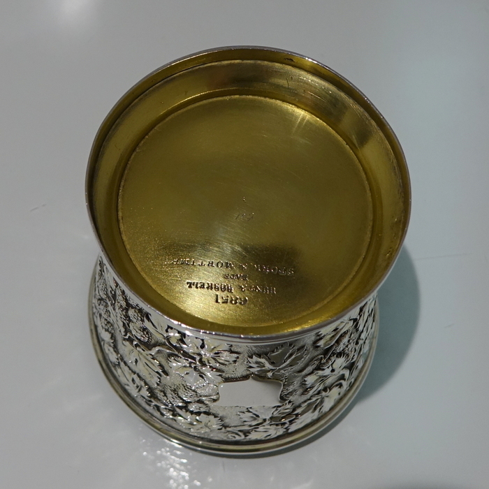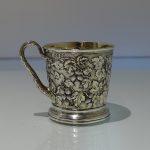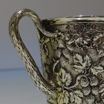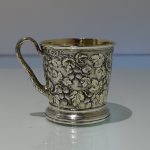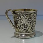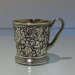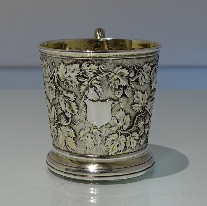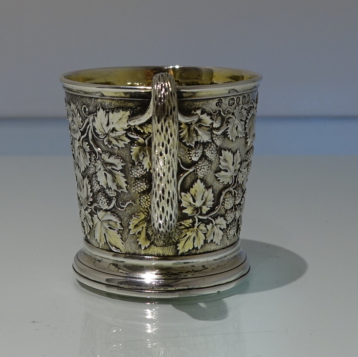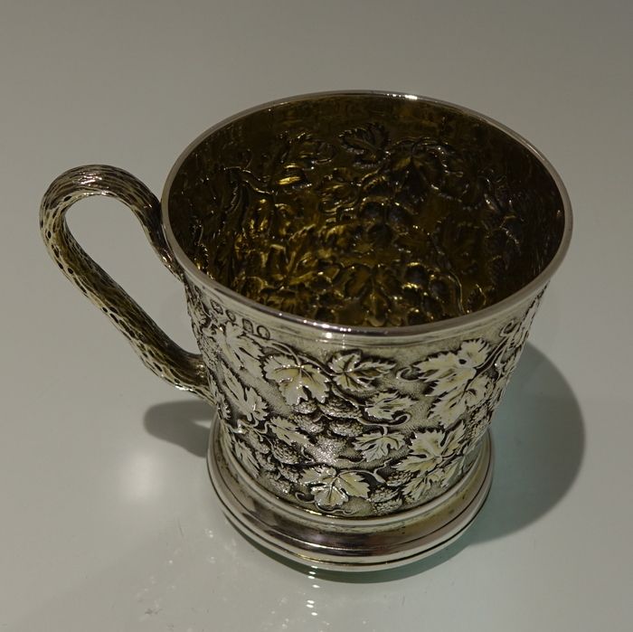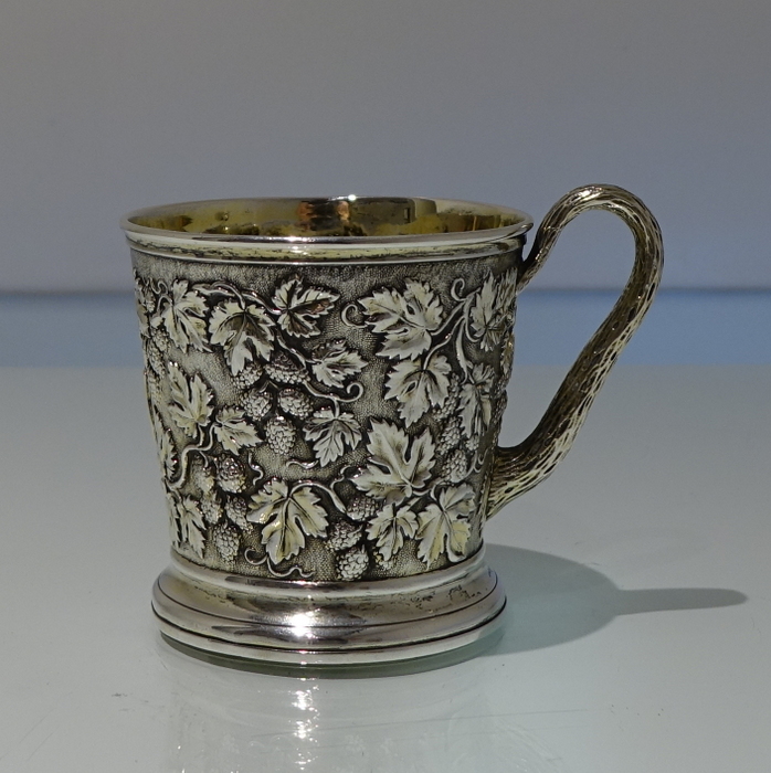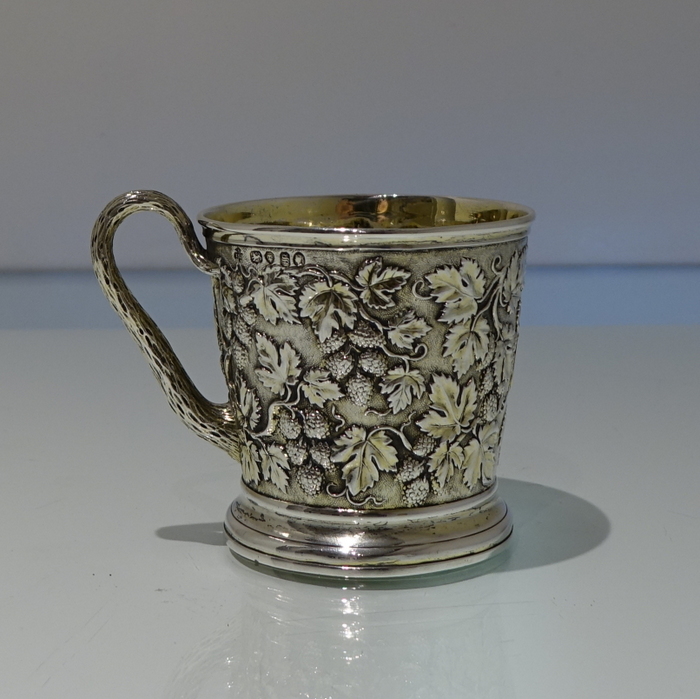 A rare and extremely collectable naturalistic designed christening mug retailed for Hunt & Roskell late Storr & Mortimer. Â The mug has elegant applied grape and vine decoration set on a matt background for contrast. Â The centre front has a silver shield cartouche.