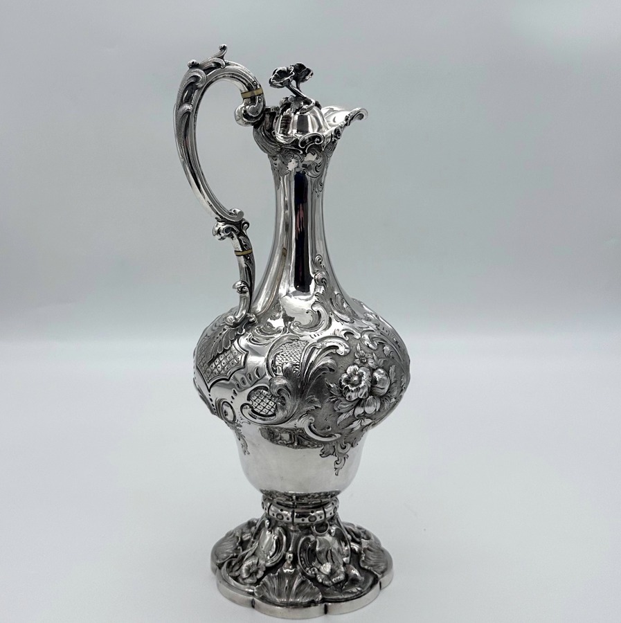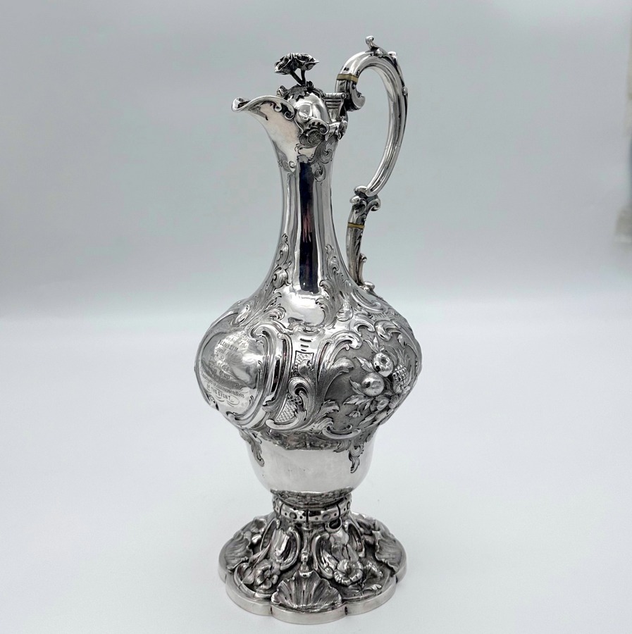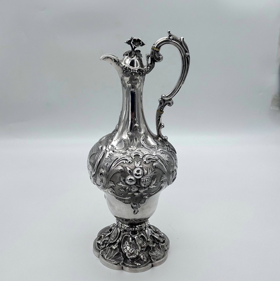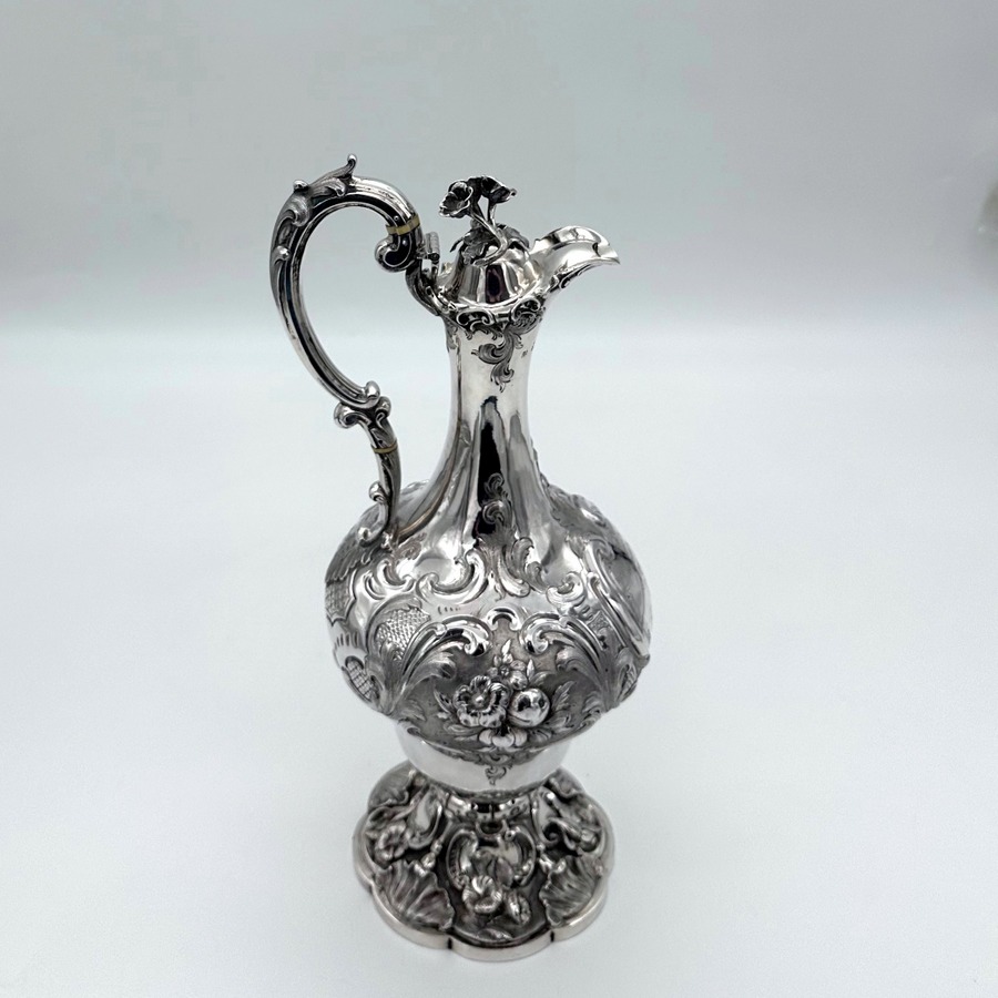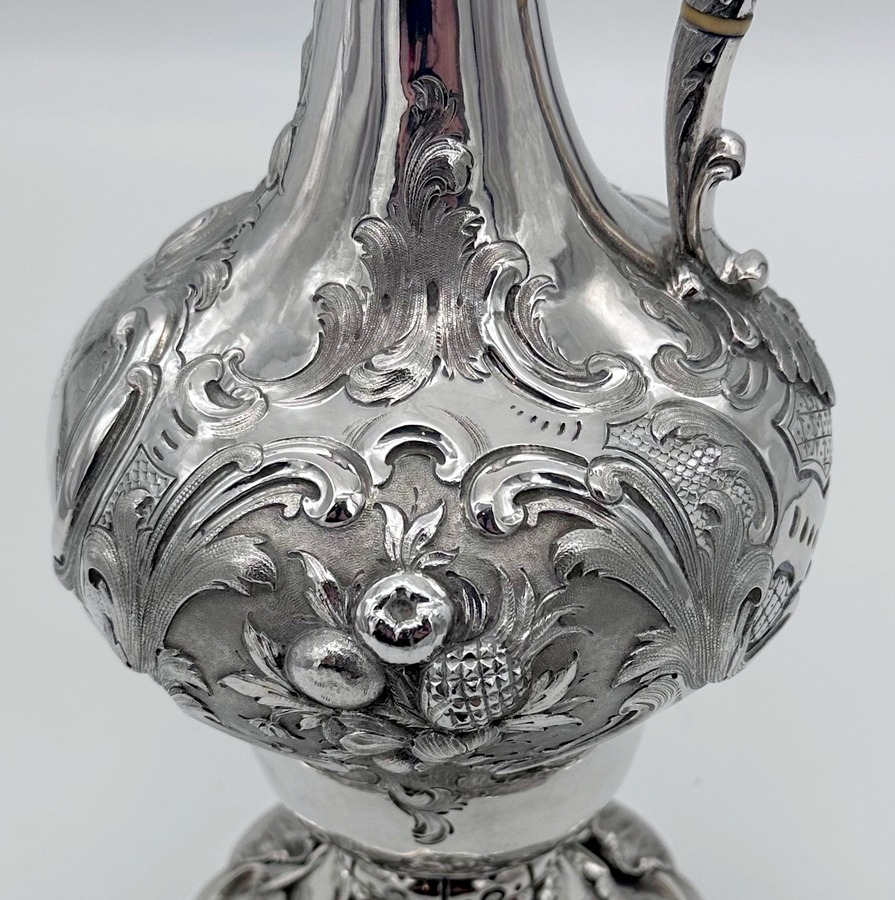 Gorgeously shaped mid 19th century silver wine jug decorated with exquisite fruit and vine embellishing elegantly set on a matt background for decorative contrast. The jug sits on a delightful embossed shaped circular shell and floral themed foot.