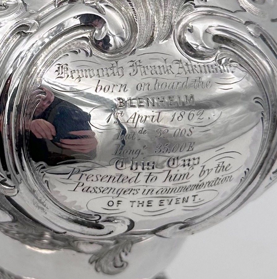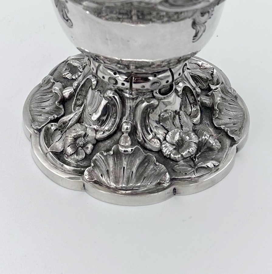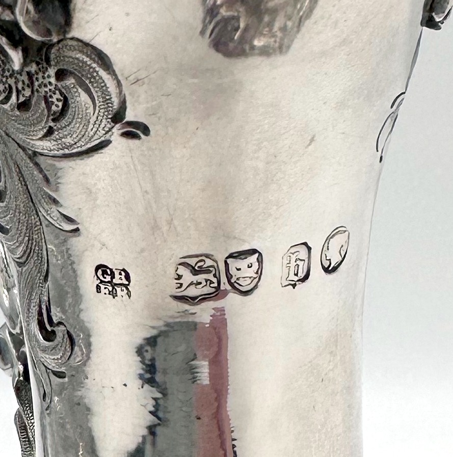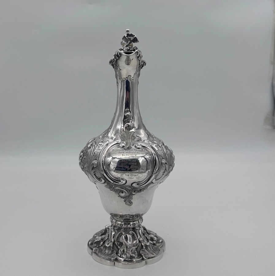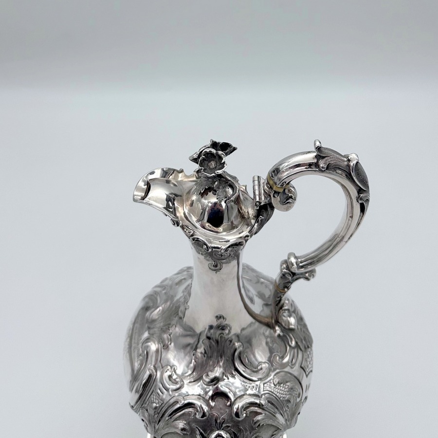 Gorgeously shaped mid 19th century silver wine jug decorated with exquisite fruit and vine embellishing elegantly set on a matt background for decorative contrast. The jug sits on a delightful embossed shaped circular shell and floral themed foot.