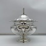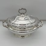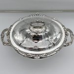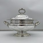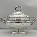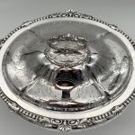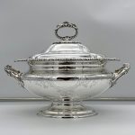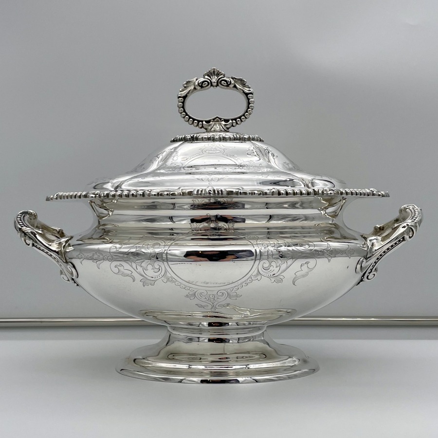 A superb quality large silverplated oval nickel soup tureen decorated with beautiful floral bright cut engraving and designed with ornate bead highlights. The tureen sits on an oval raised pedestal foot and the lid is mounted with an ornate handle.