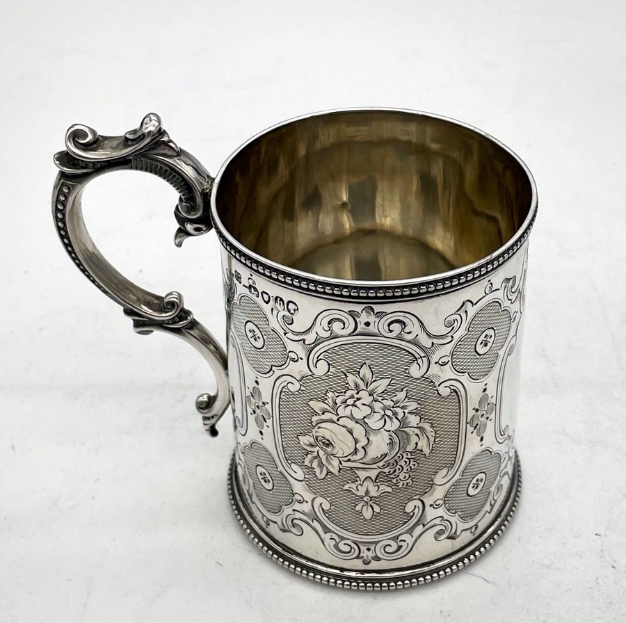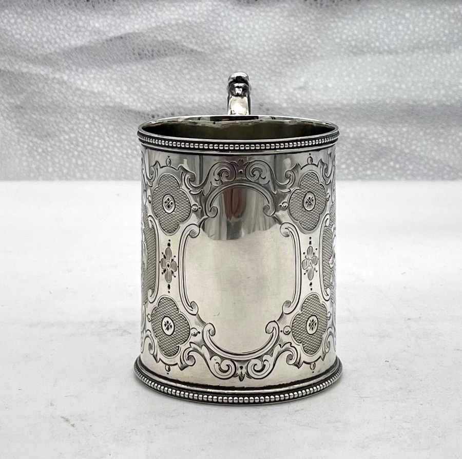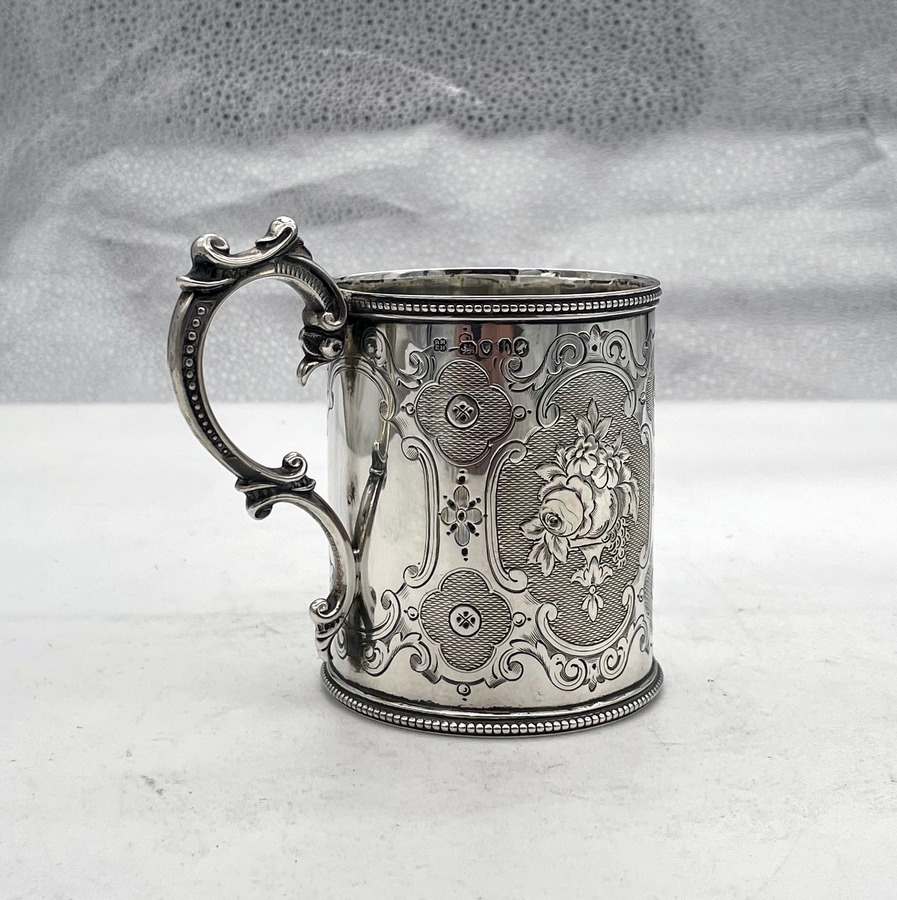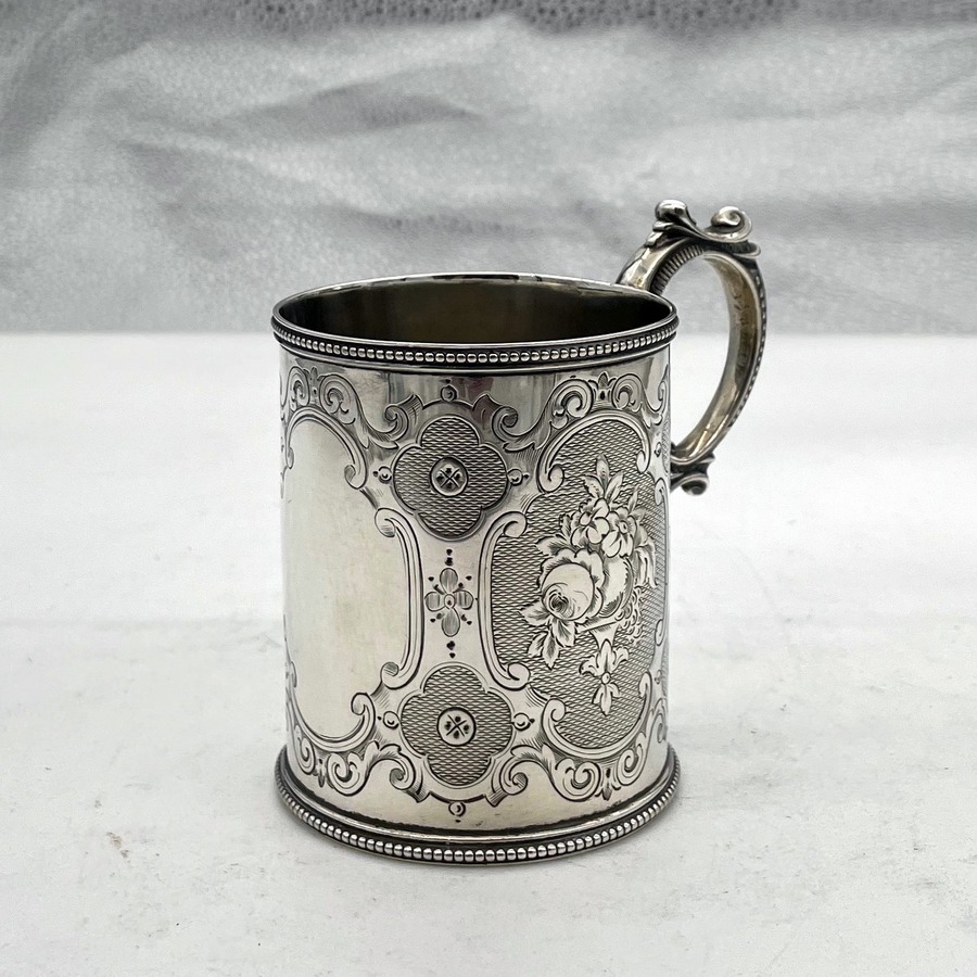 A truly fine mid 19th century sterling silver bead bordered christening mug decorated with exquisite floral hand engraving which is set on a lattice background for decorative contrast and framed within a stylish surround.