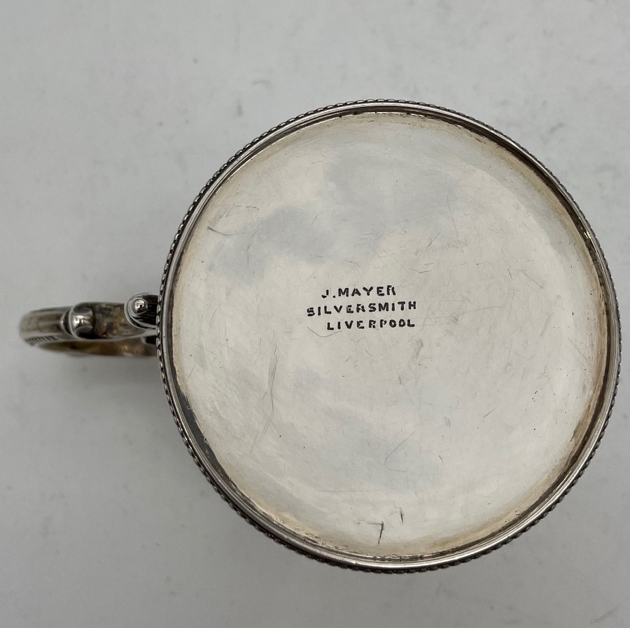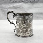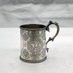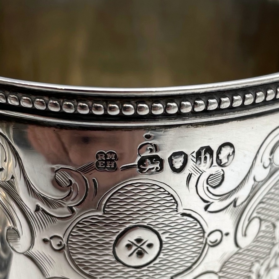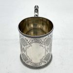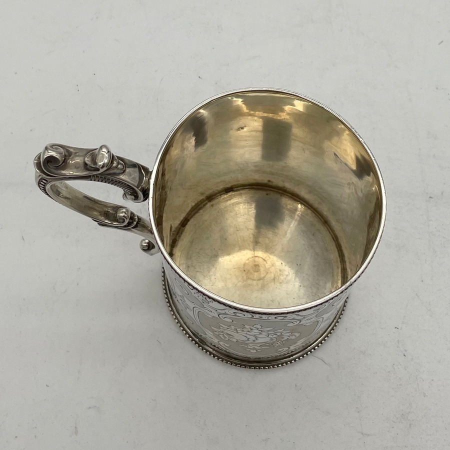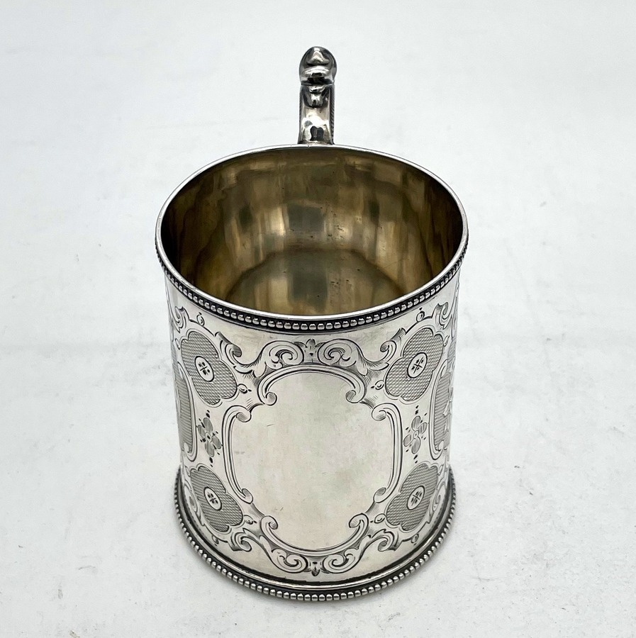 A truly fine mid 19th century sterling silver bead bordered christening mug decorated with exquisite floral hand engraving which is set on a lattice background for decorative contrast and framed within a stylish surround.