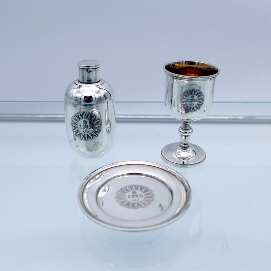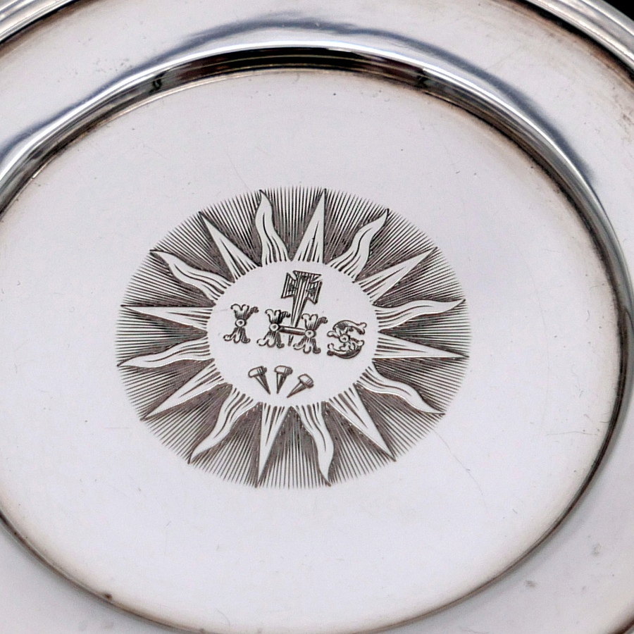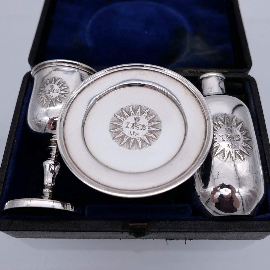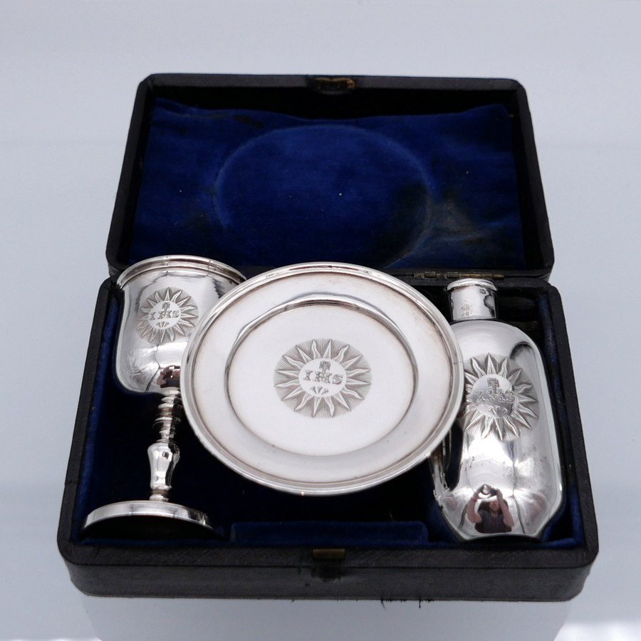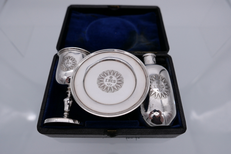 A rare mid 19th century silver communion set decorated with sumptuous central themed sunburst hand engraved cartouches all of which have stylish contemporary initials.
