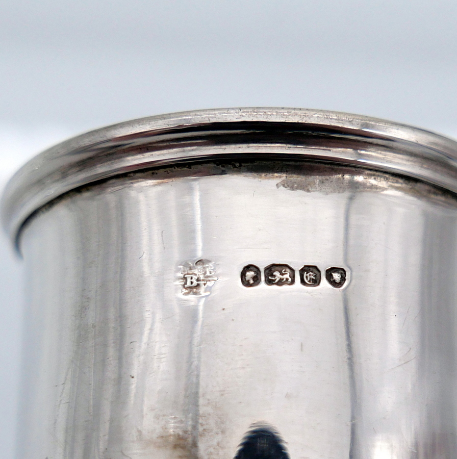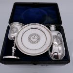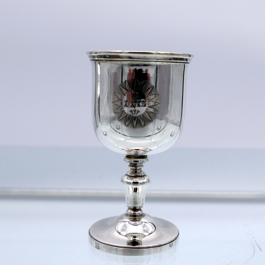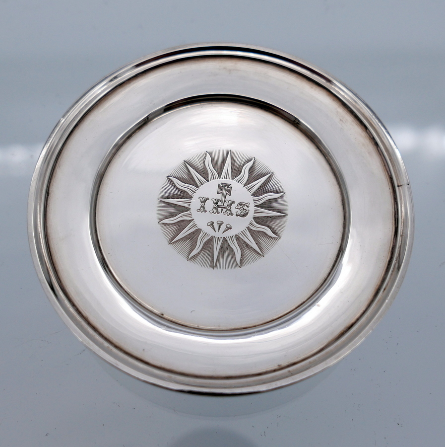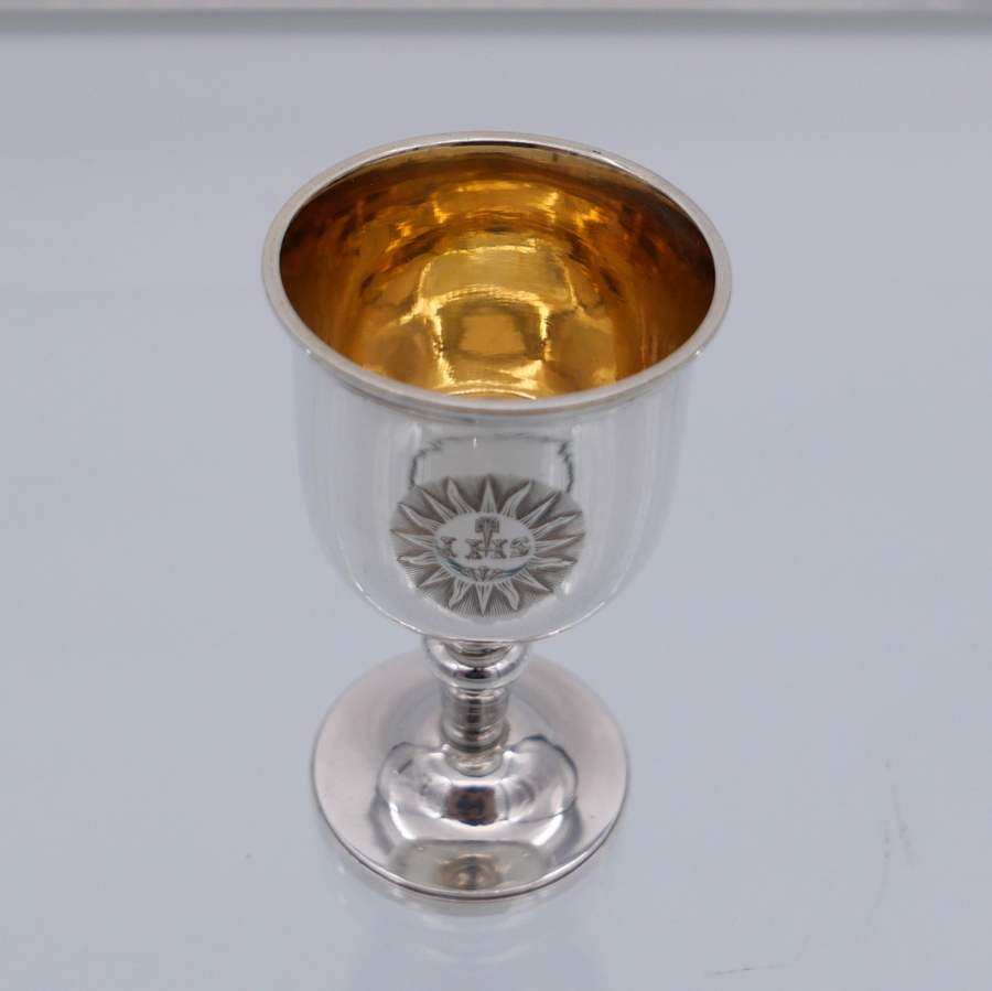 A rare mid 19th century silver communion set decorated with sumptuous central themed sunburst hand engraved cartouches all of which have stylish contemporary initials.
