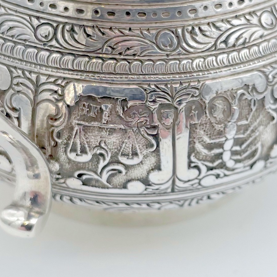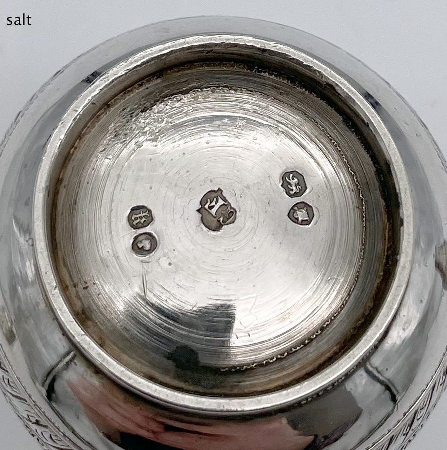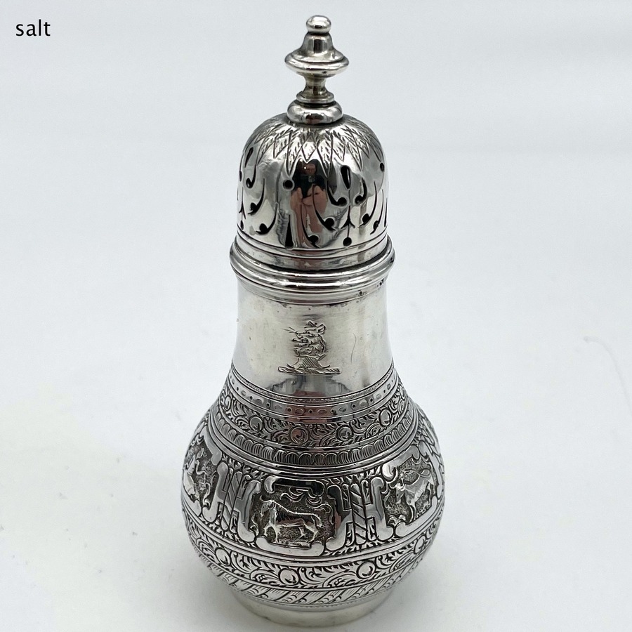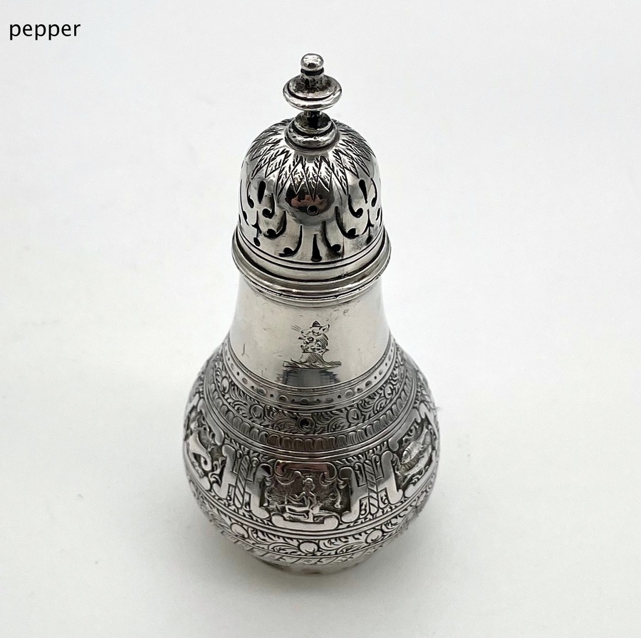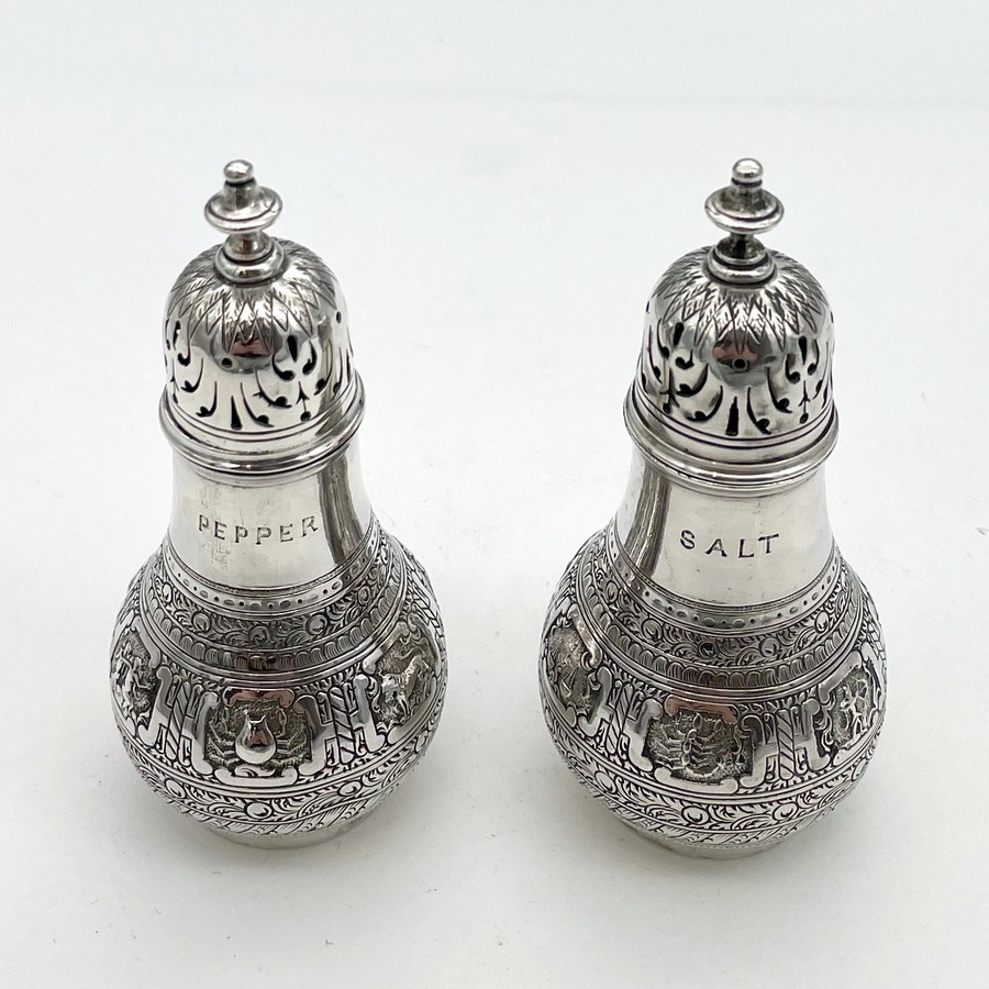 An extremely rare three piece Victorian silver condiment set designed with truly beautiful embossing depicting the cycles of the zodiac. Â The pair of pots have stylish salt and pepper engraved on them for artistic convenience and all pieces have contemporary crests for importance.