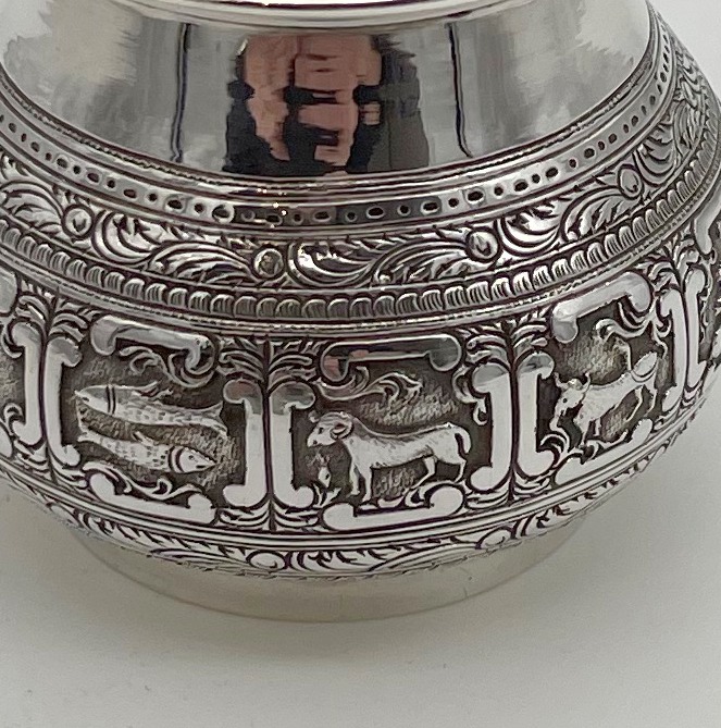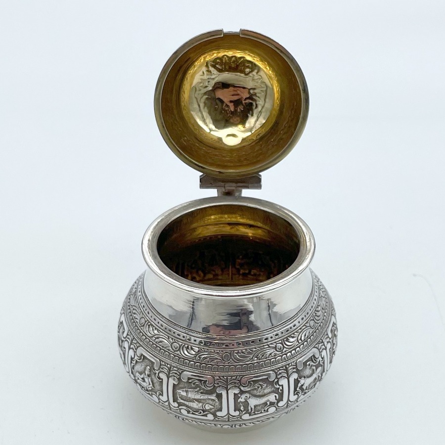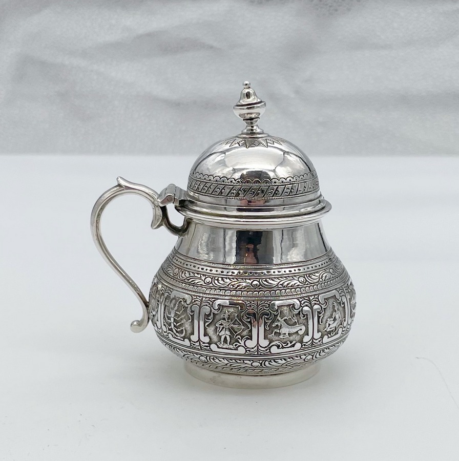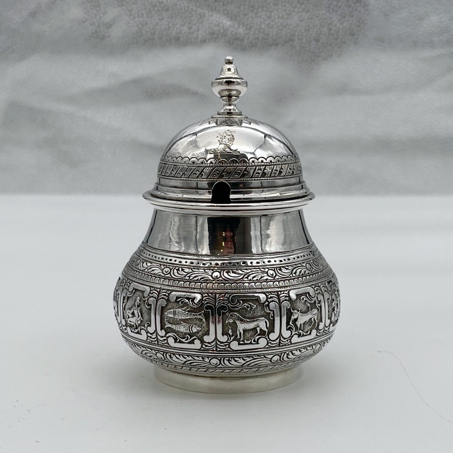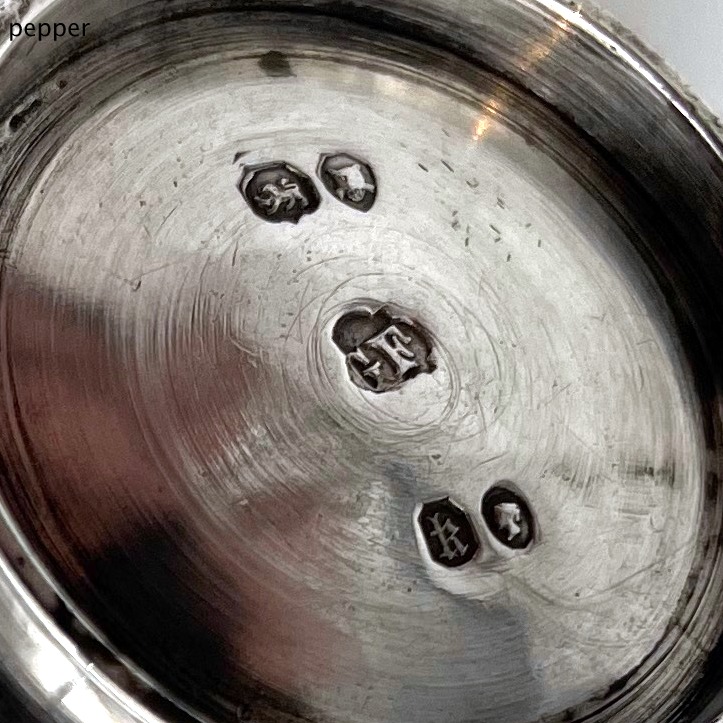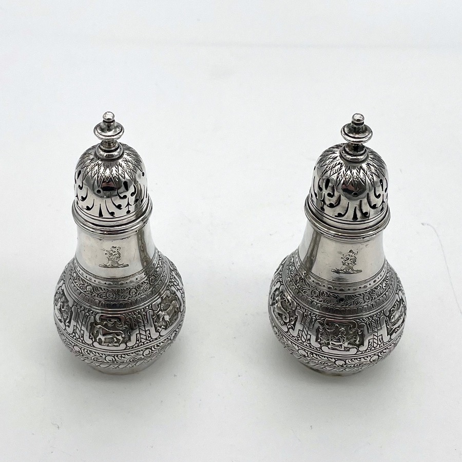An extremely rare three piece Victorian silver condiment set designed with truly beautiful embossing depicting the cycles of the zodiac. Â The pair of pots have stylish salt and pepper engraved on them for artistic convenience and all pieces have contemporary crests for importance.