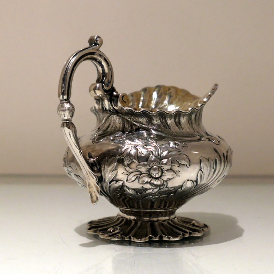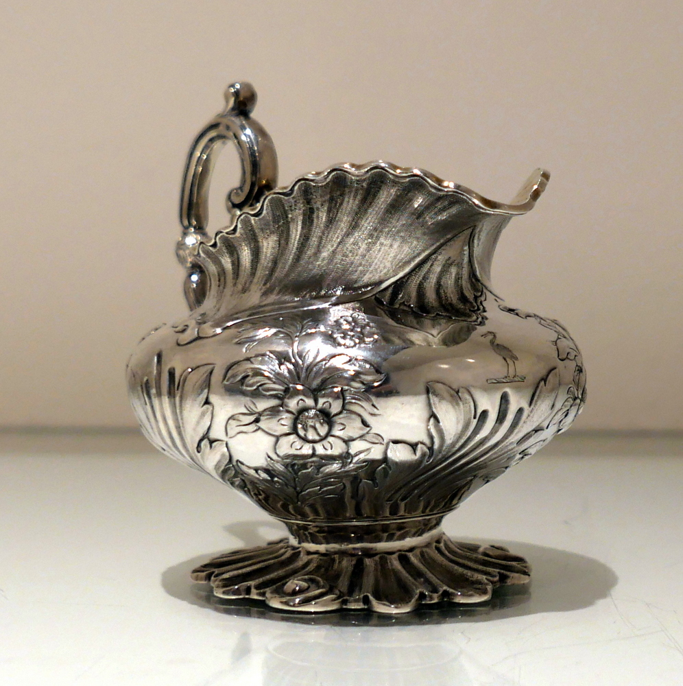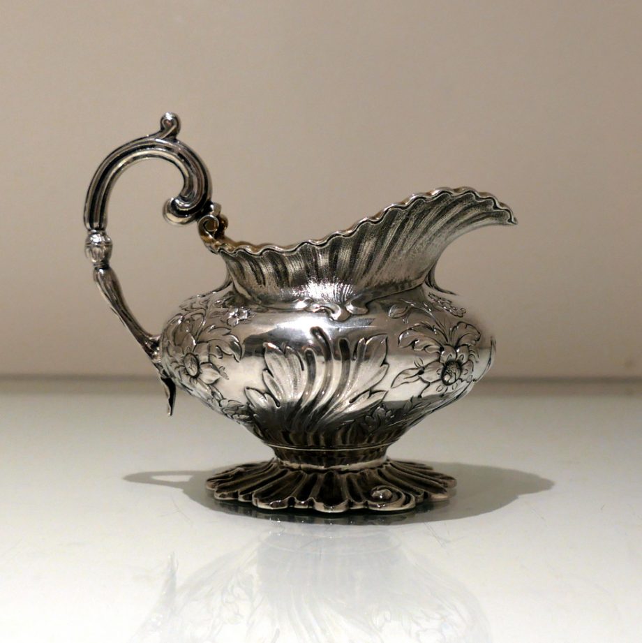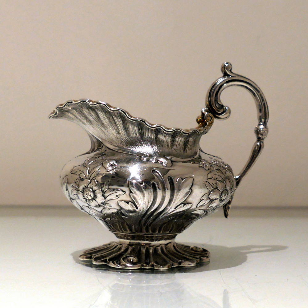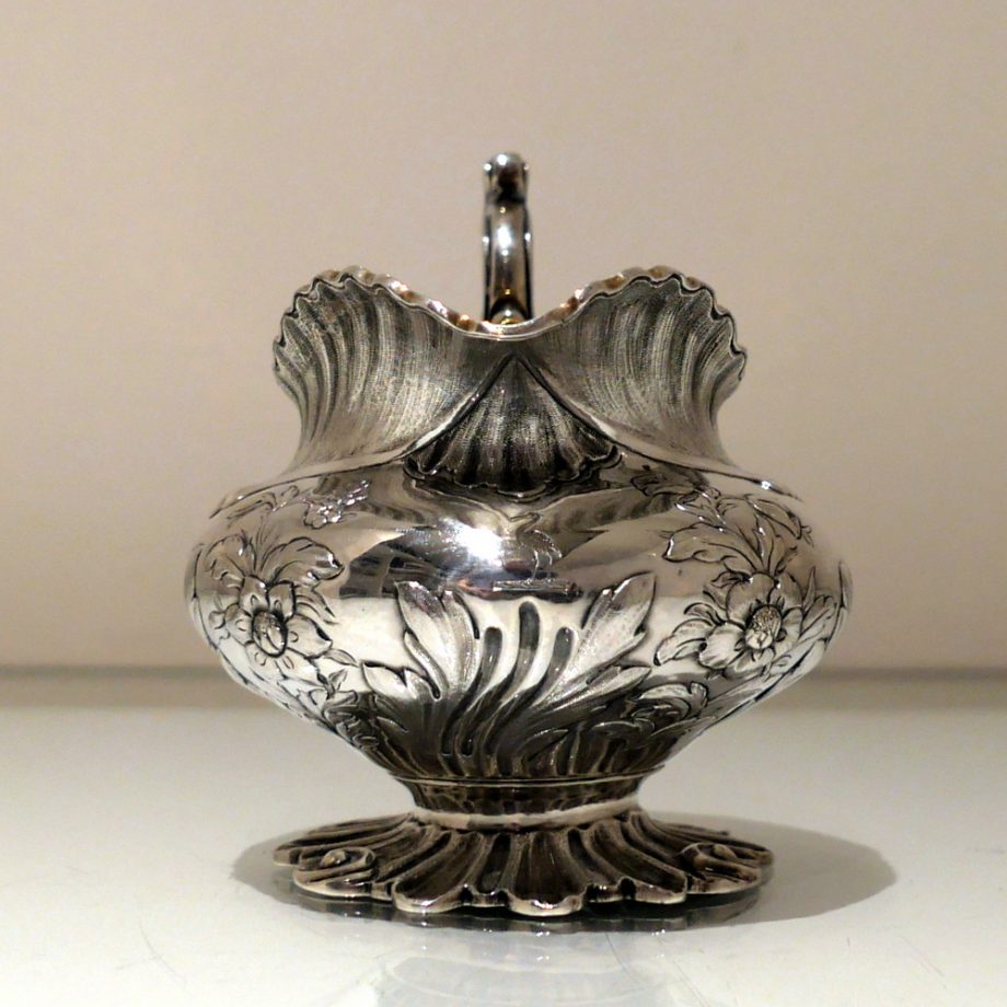 A truly fine sterling silver cream jug decorated with a stunning naturalistic ‘scalloped’ spout rim and elegant floral chasing to the baluster bowl. Â The inside is gilt and the jug sits on a sumptuous shaped circular cast foot.