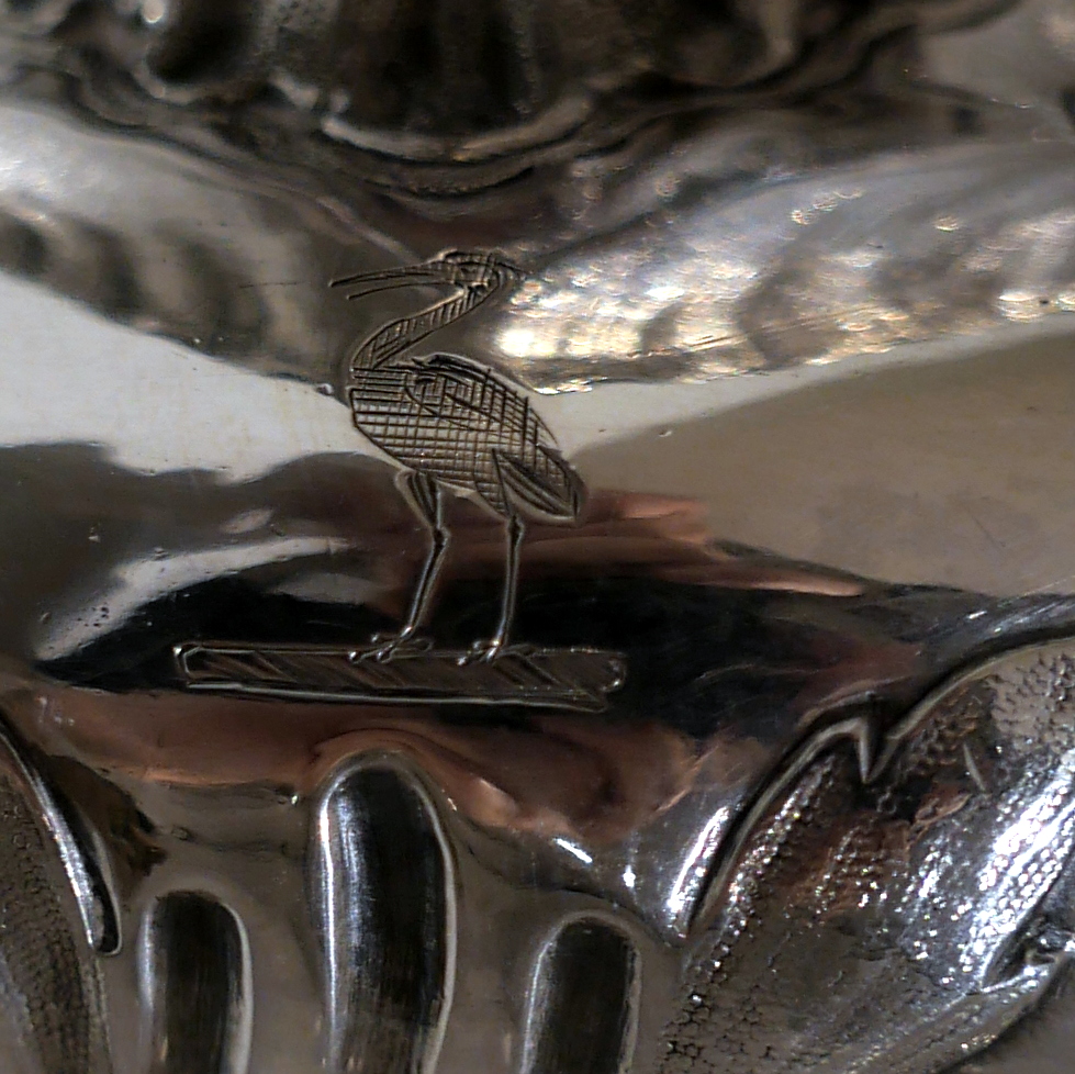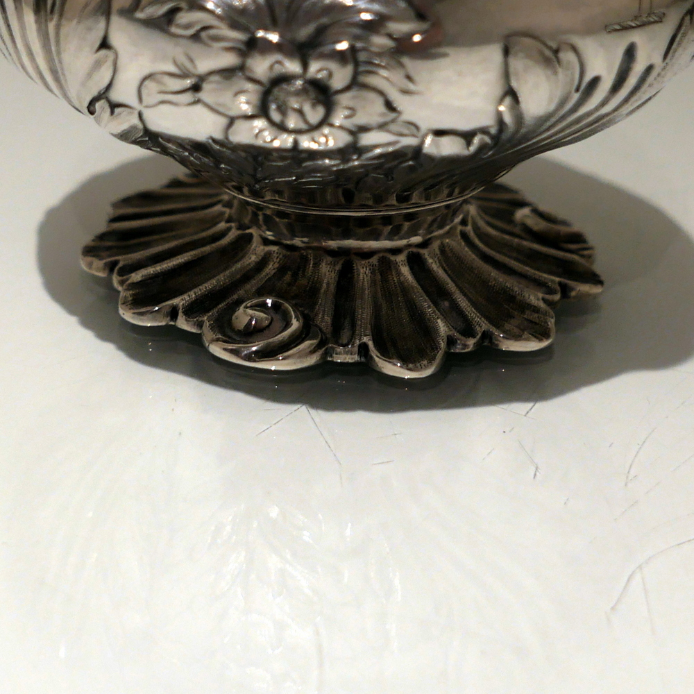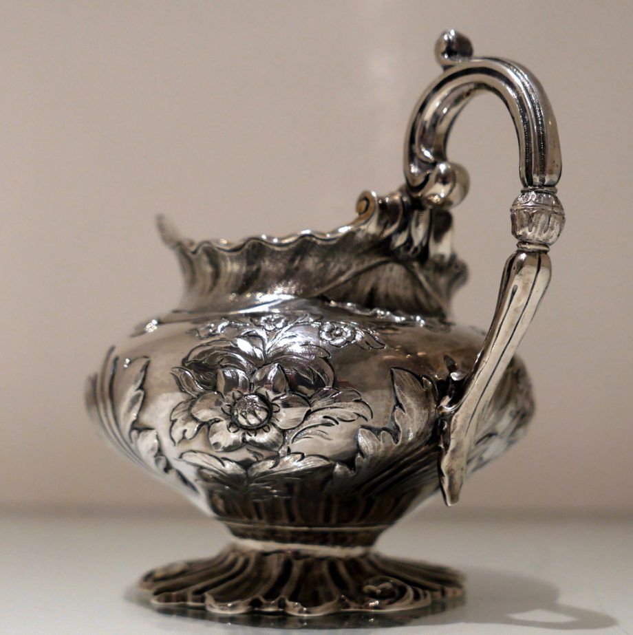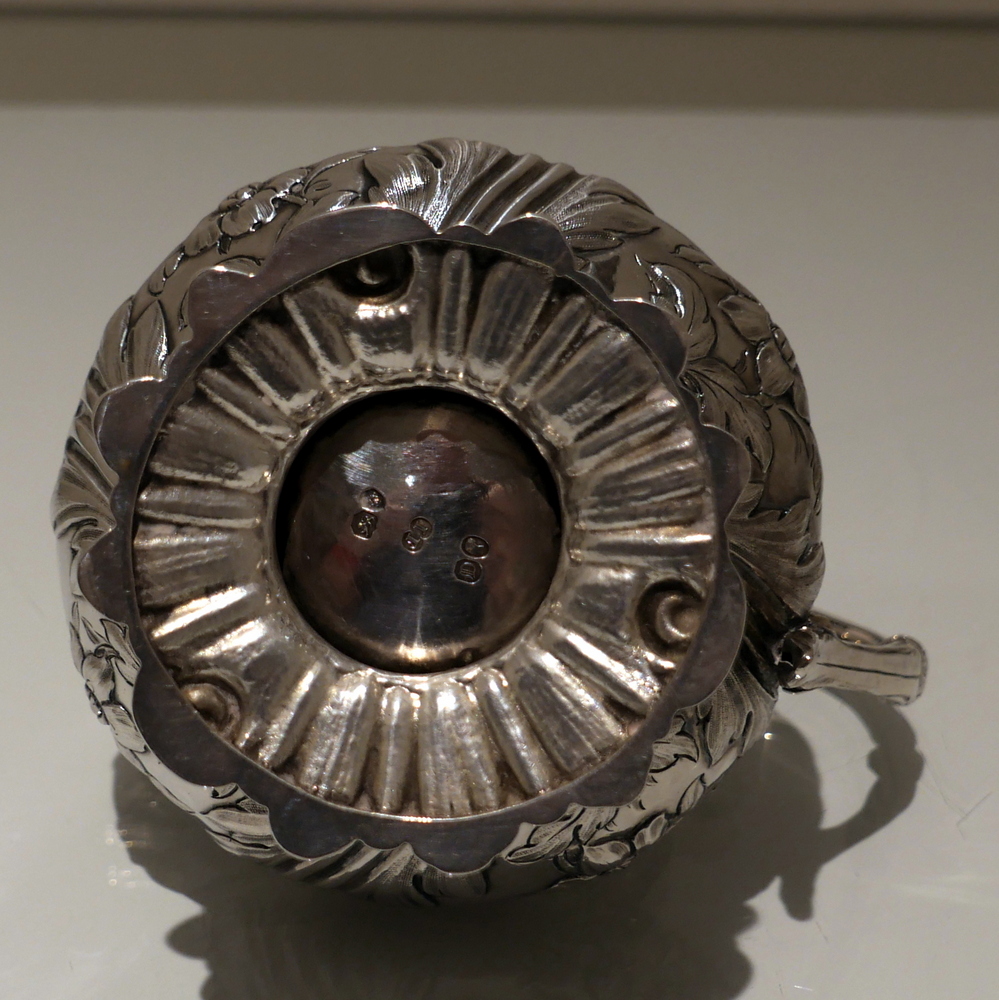 A truly fine sterling silver cream jug decorated with a stunning naturalistic ‘scalloped’ spout rim and elegant floral chasing to the baluster bowl. Â The inside is gilt and the jug sits on a sumptuous shaped circular cast foot.