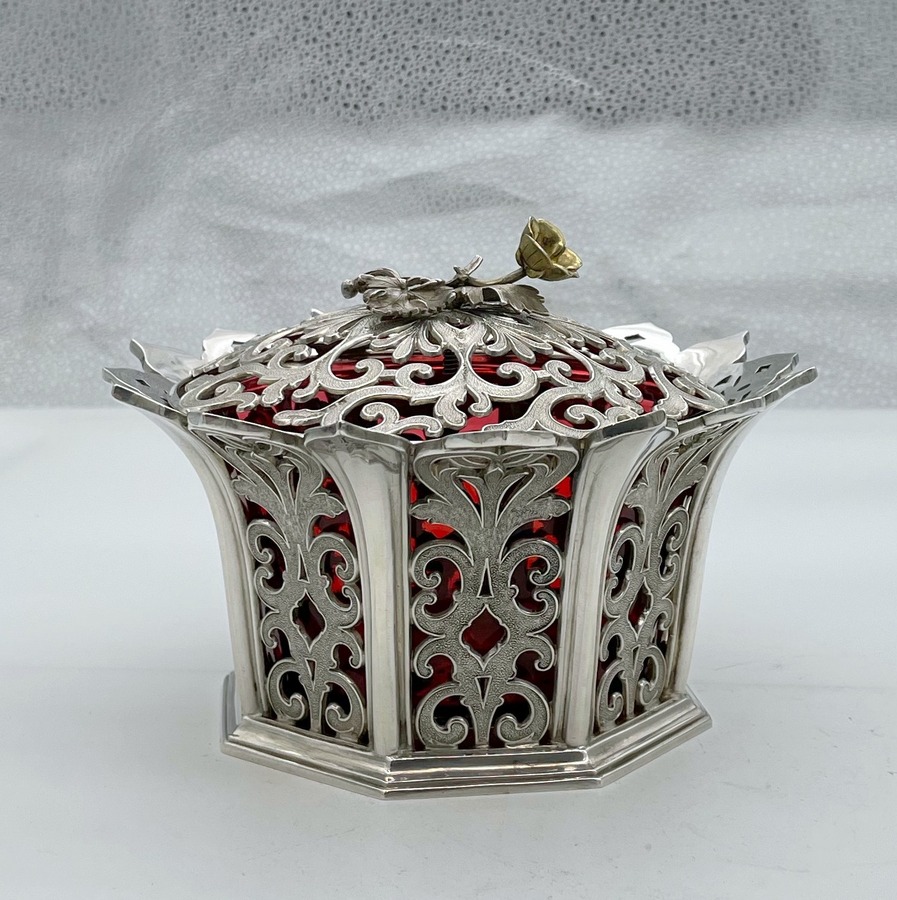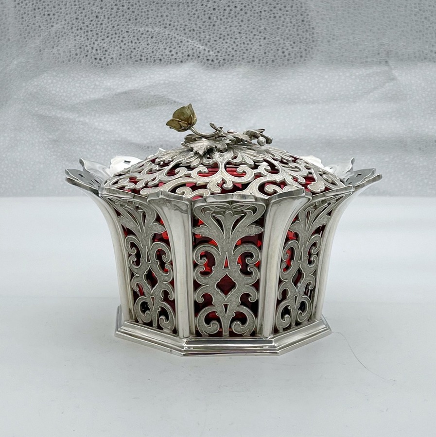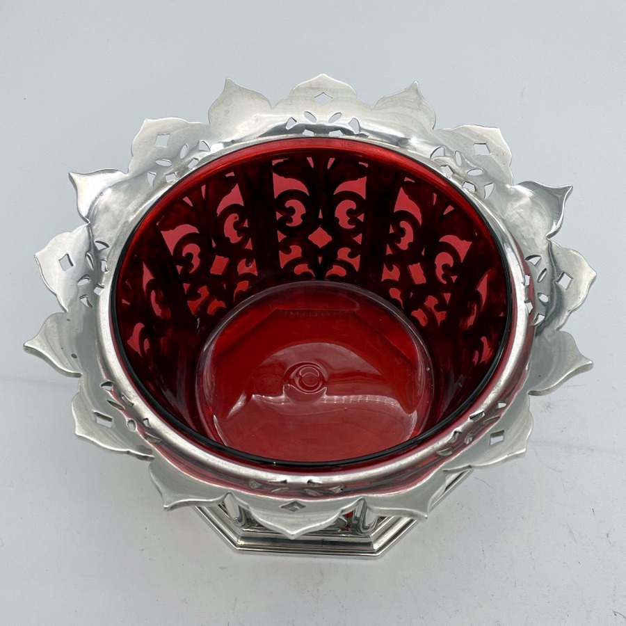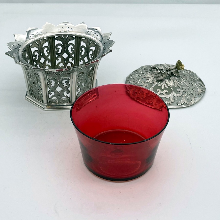 UA delightful and incredibly rare silver bon bon dish designed with elegant cast matt scrolling pierced panels and a beautiful cranberry liner insert. Â The upper rim is styled on a blossoming flower in which sits a delightful decorative matching lid mounted with a beautiful floral themed finial.