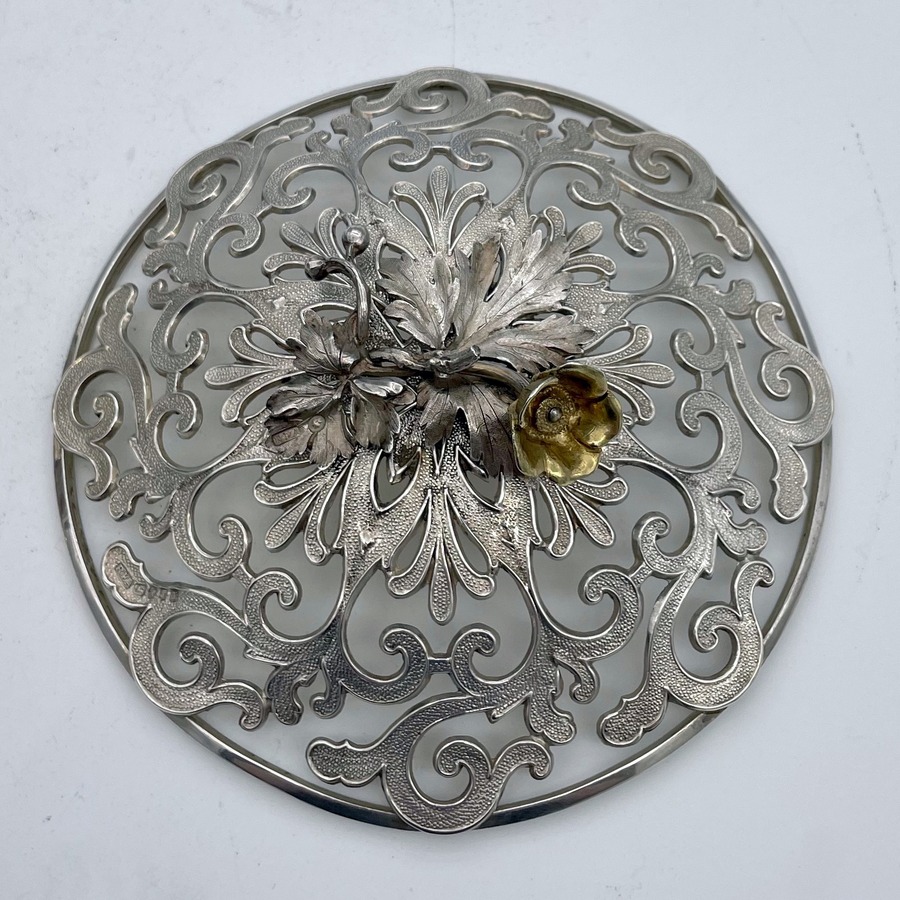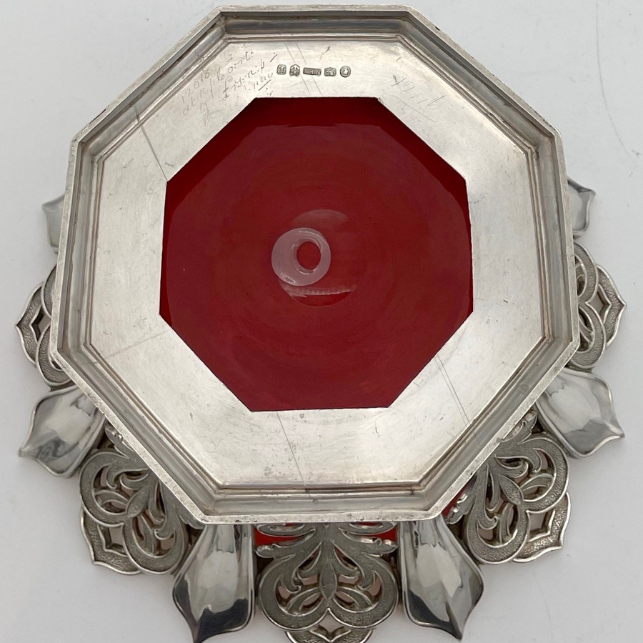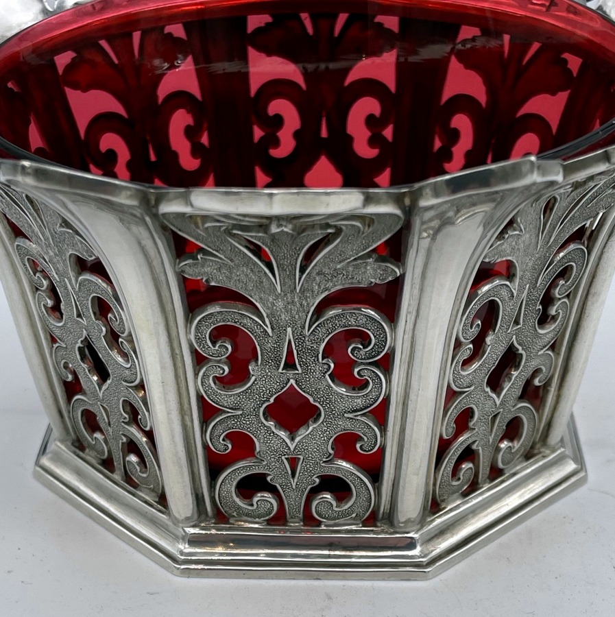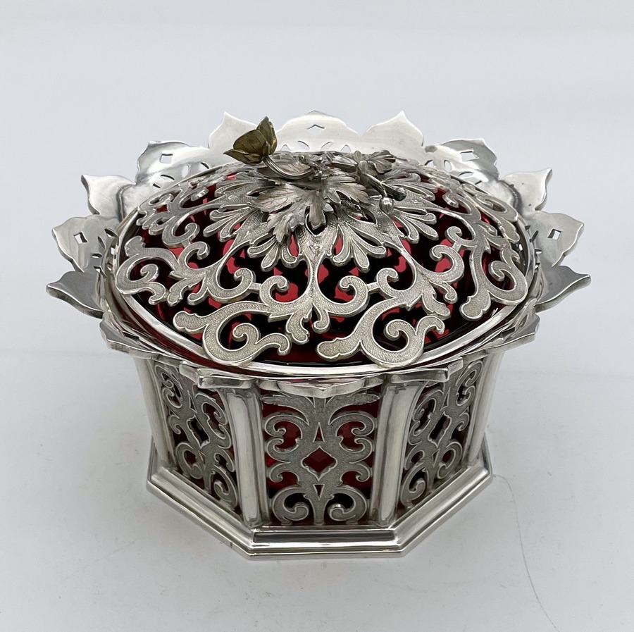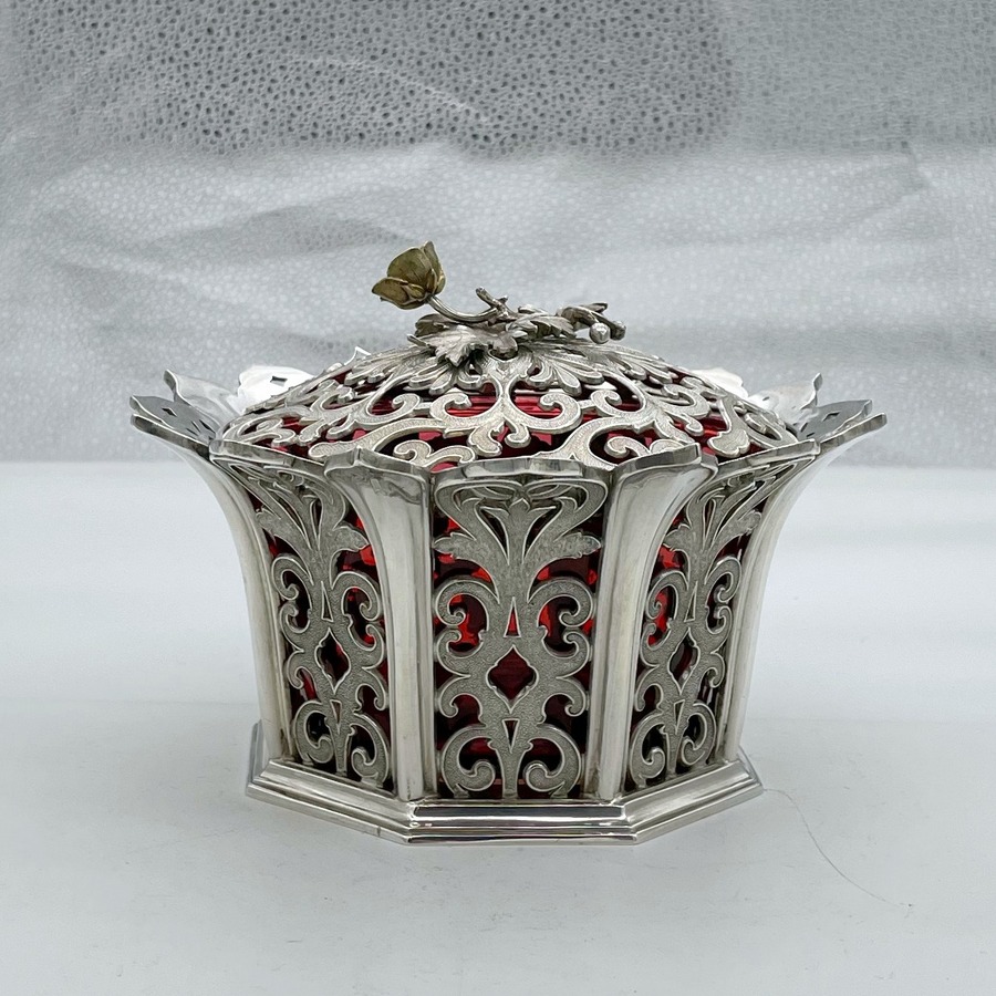 UA delightful and incredibly rare silver bon bon dish designed with elegant cast matt scrolling pierced panels and a beautiful cranberry liner insert. Â The upper rim is styled on a blossoming flower in which sits a delightful decorative matching lid mounted with a beautiful floral themed finial.
