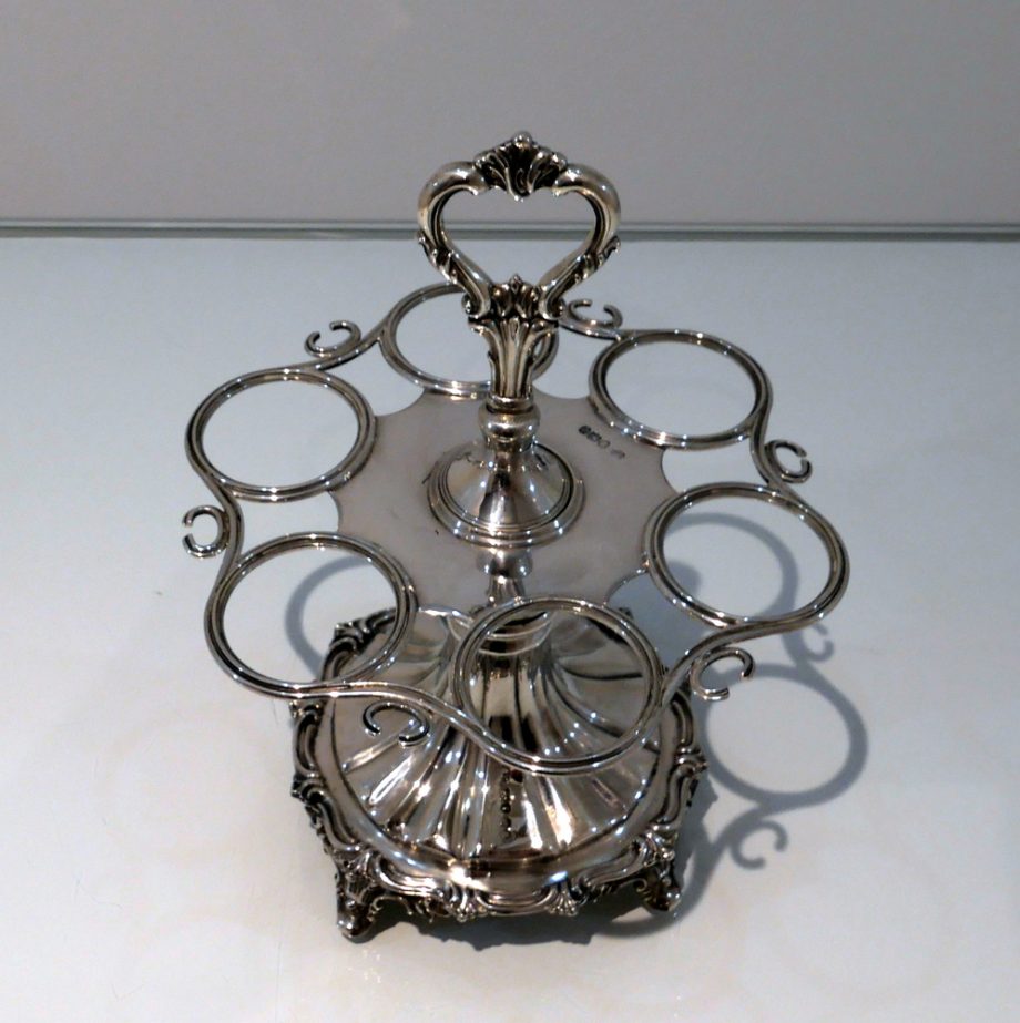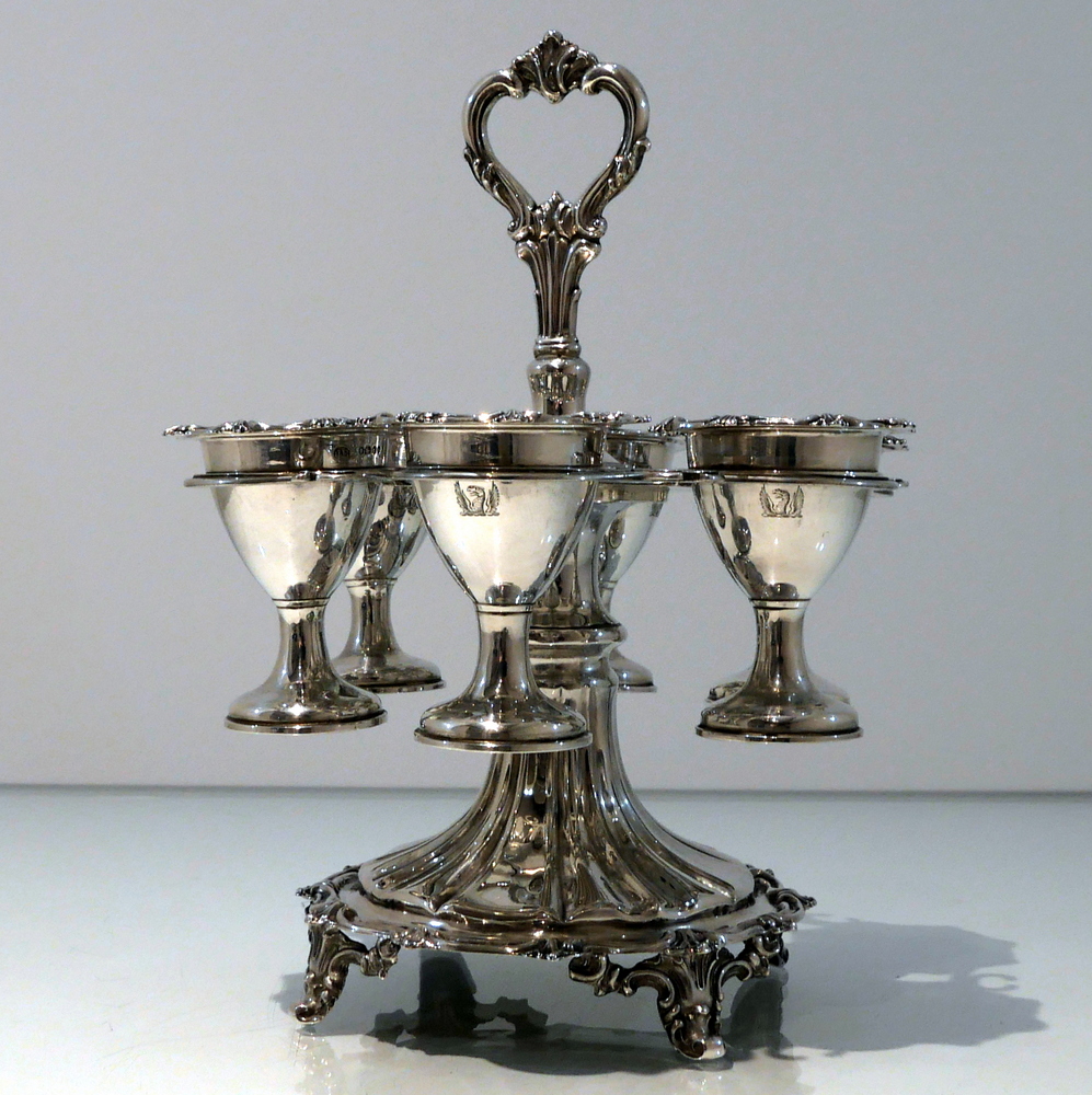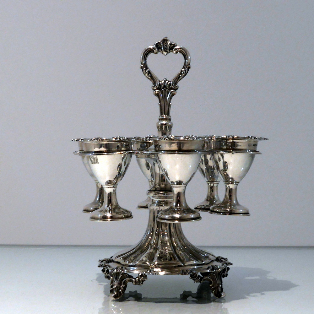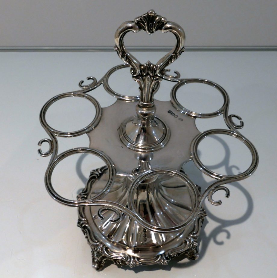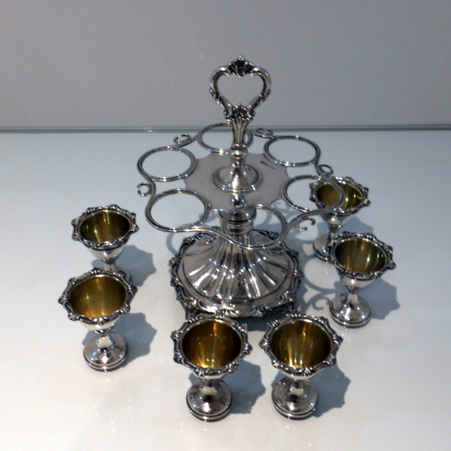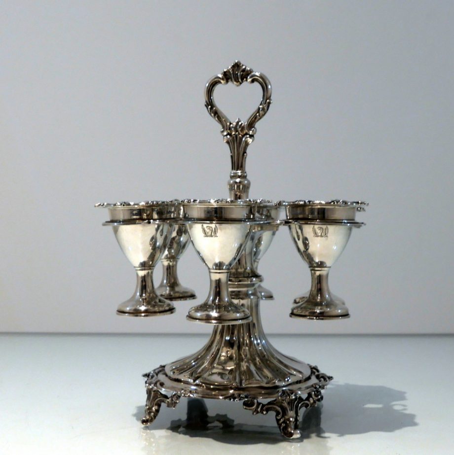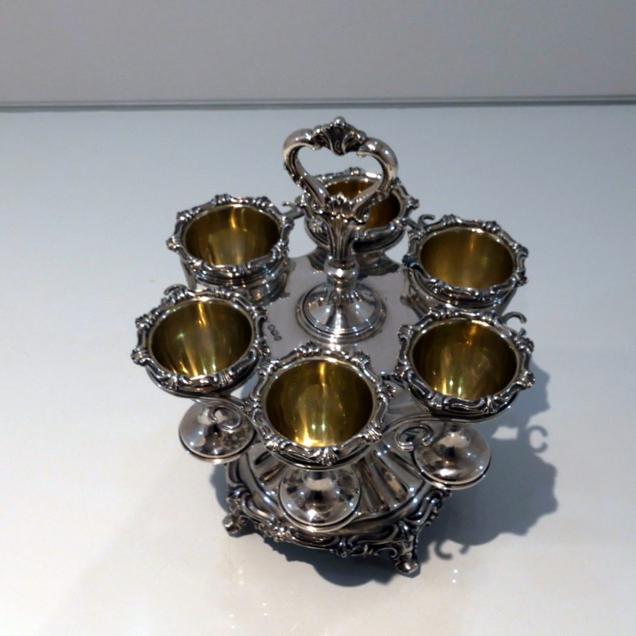 A rare and extremely stylish six cup sterling silver Victorian egg cruet designed with applied decorative wire borders. Â The base has flute designs for lowlights and the interiors of the detachable cups are gilt. Â The centre fronts of the cups have elegant contemporary crests.