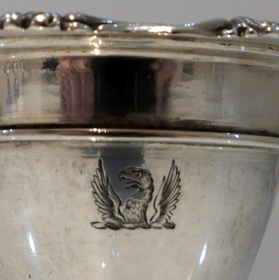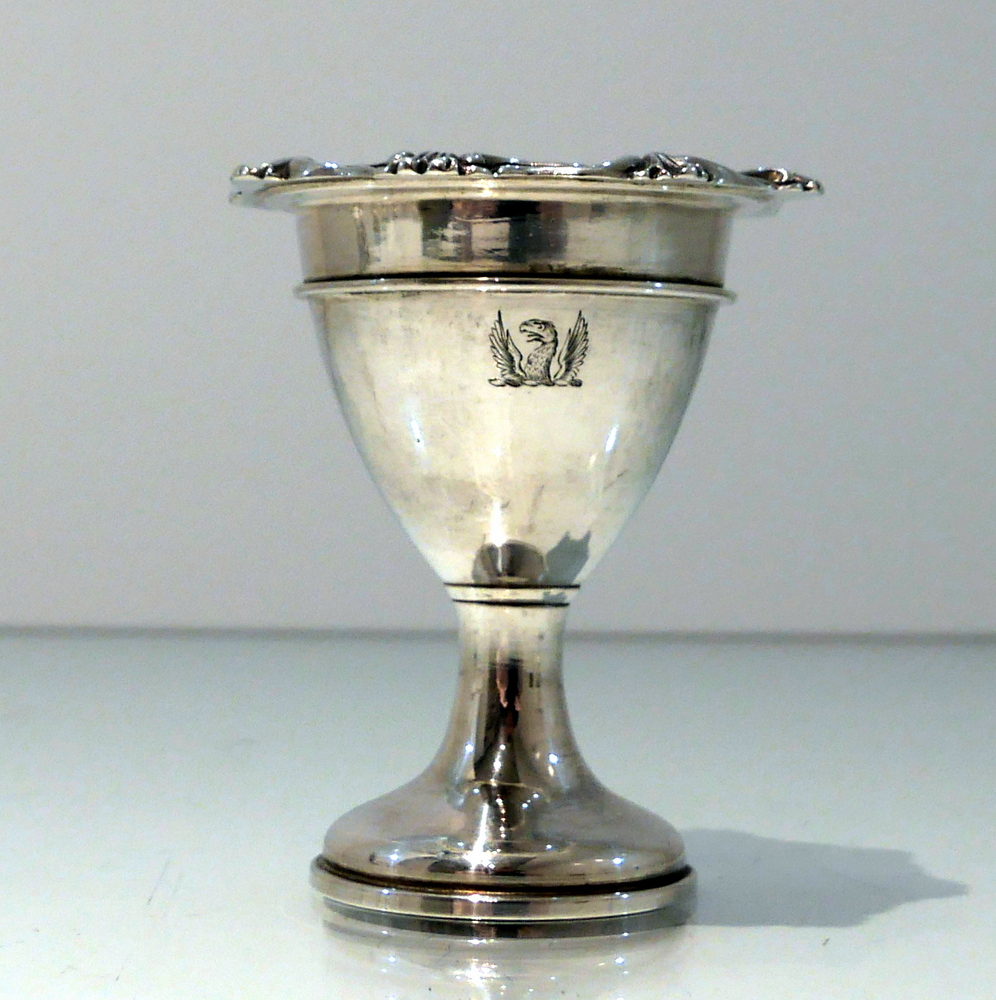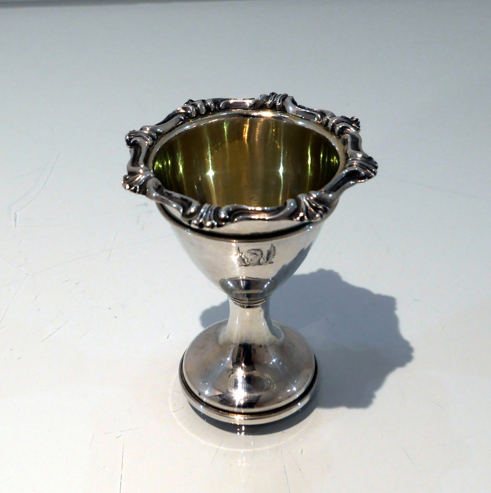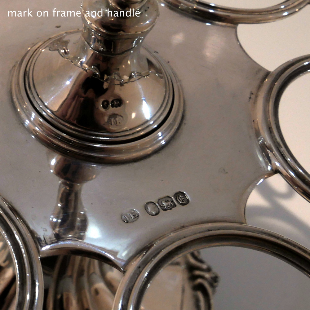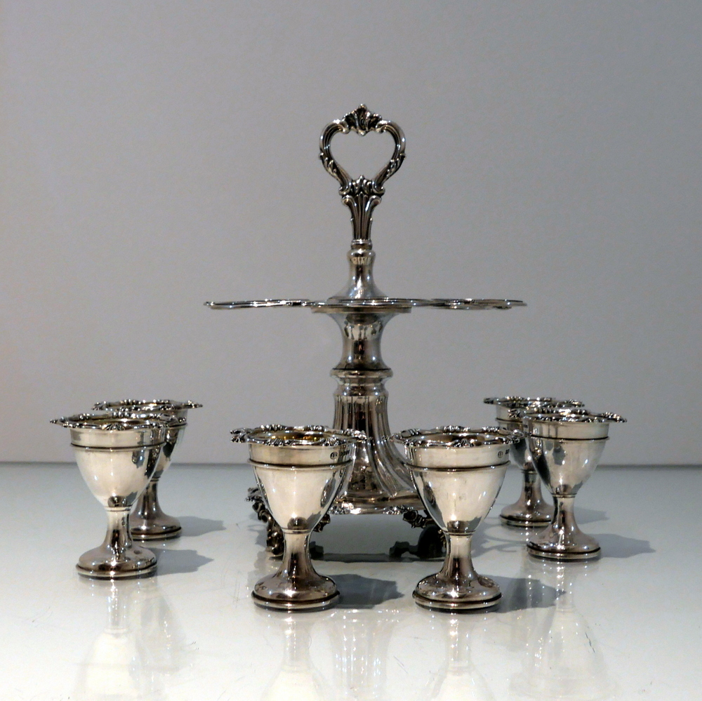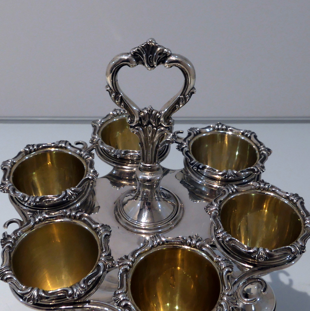 A rare and extremely stylish six cup sterling silver Victorian egg cruet designed with applied decorative wire borders. Â The base has flute designs for lowlights and the interiors of the detachable cups are gilt. Â The centre fronts of the cups have elegant contemporary crests.