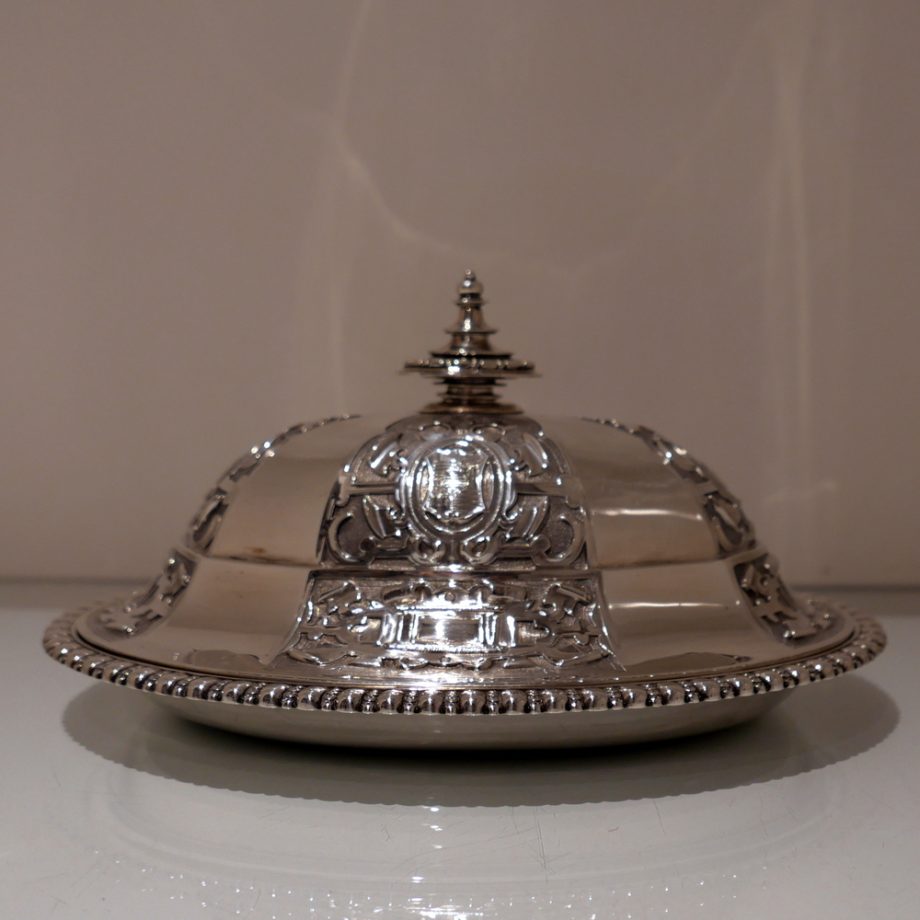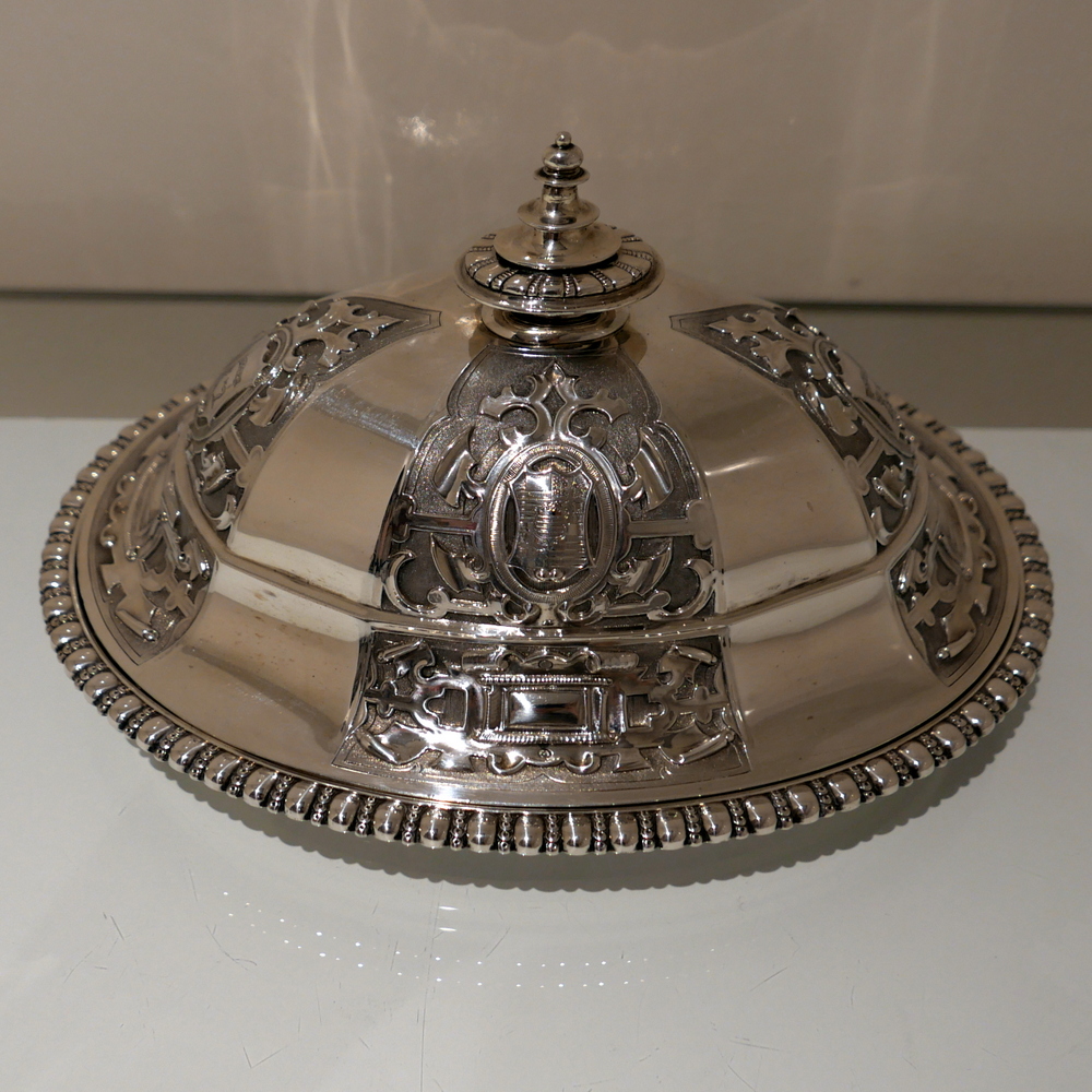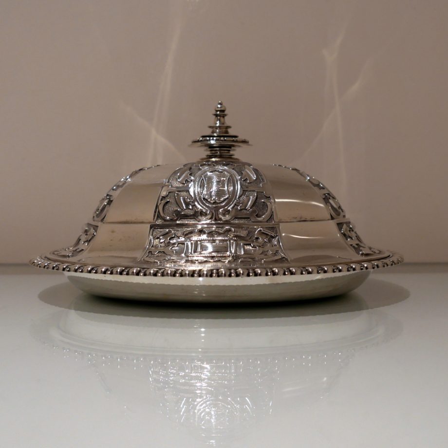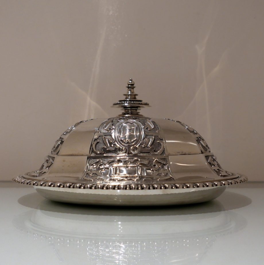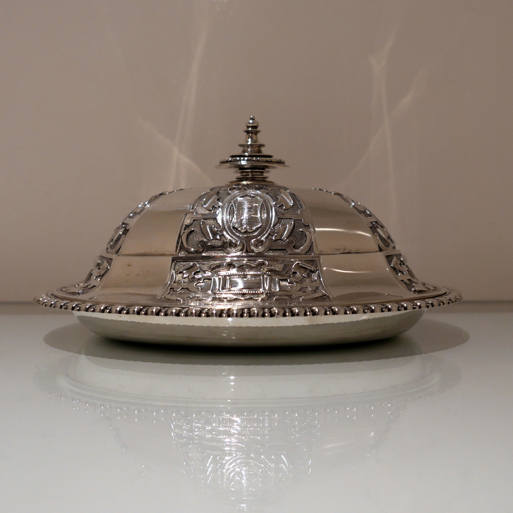 A truly impressive sterling silver oval entree dish and cover made by the renowned silversmith John S Hunt. Â The detachable lid is superbly decorated with incredibly ornate hand chasing which alternate plain formed panels for decorative contrast. Â The base has a delightful egg & tongue (style) border. Â There are contemporary applied armorials and crests respectively alternating within the ornate panels.