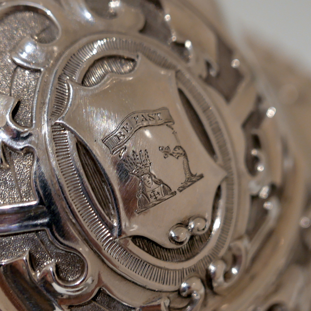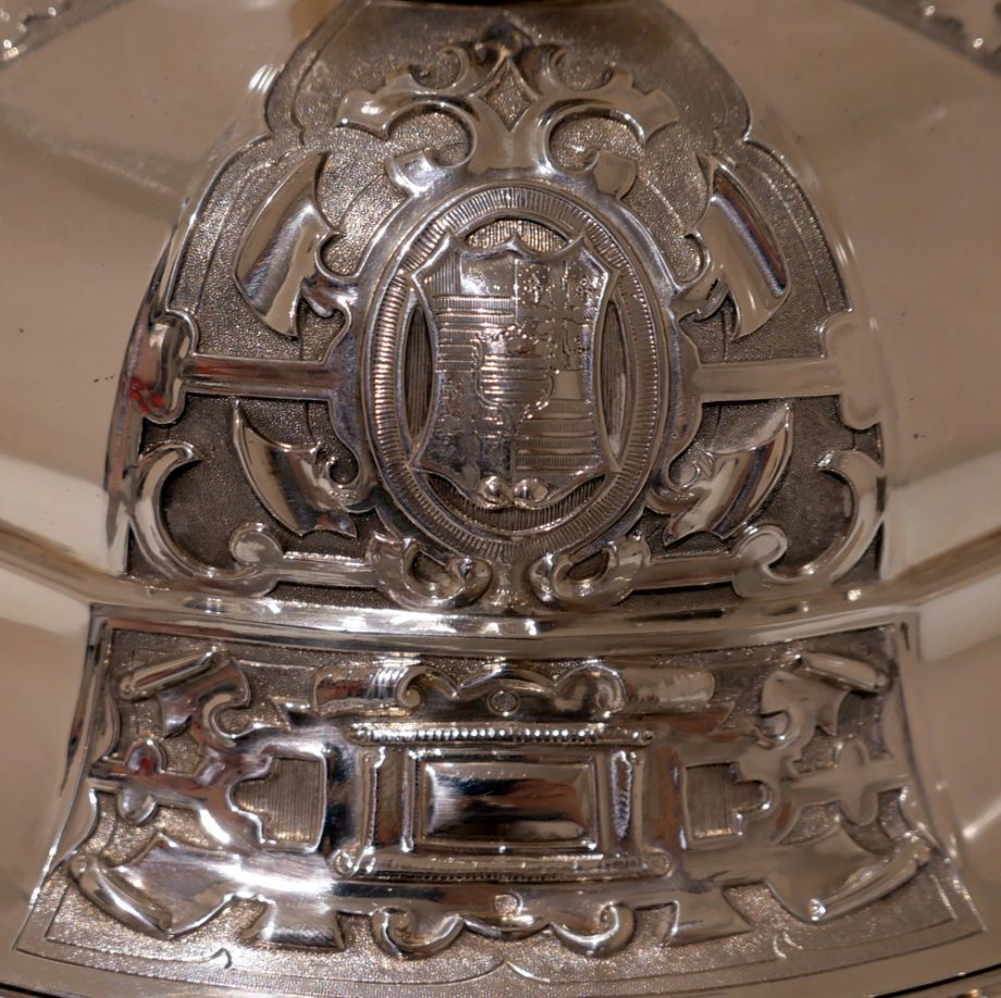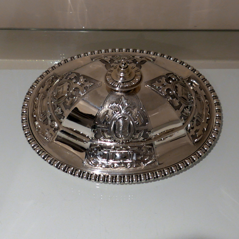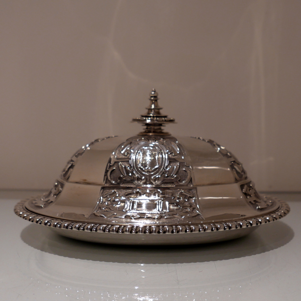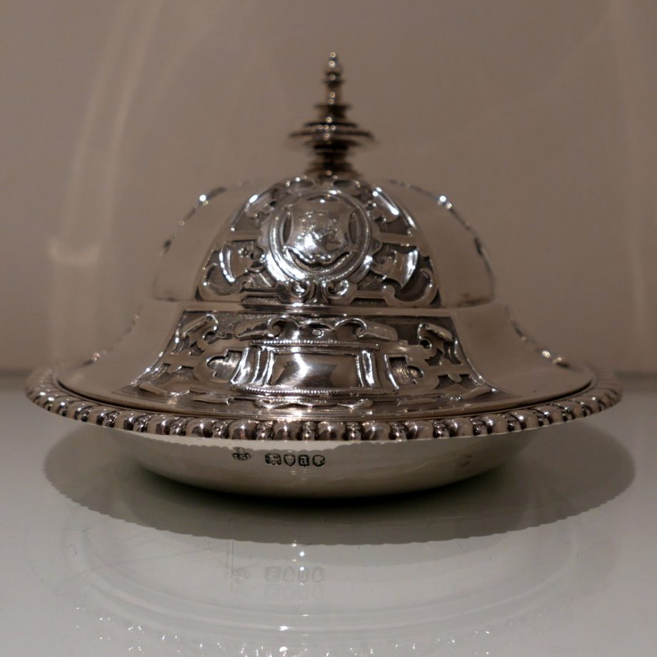 A truly impressive sterling silver oval entree dish and cover made by the renowned silversmith John S Hunt. Â The detachable lid is superbly decorated with incredibly ornate hand chasing which alternate plain formed panels for decorative contrast. Â The base has a delightful egg & tongue (style) border. Â There are contemporary applied armorials and crests respectively alternating within the ornate panels.