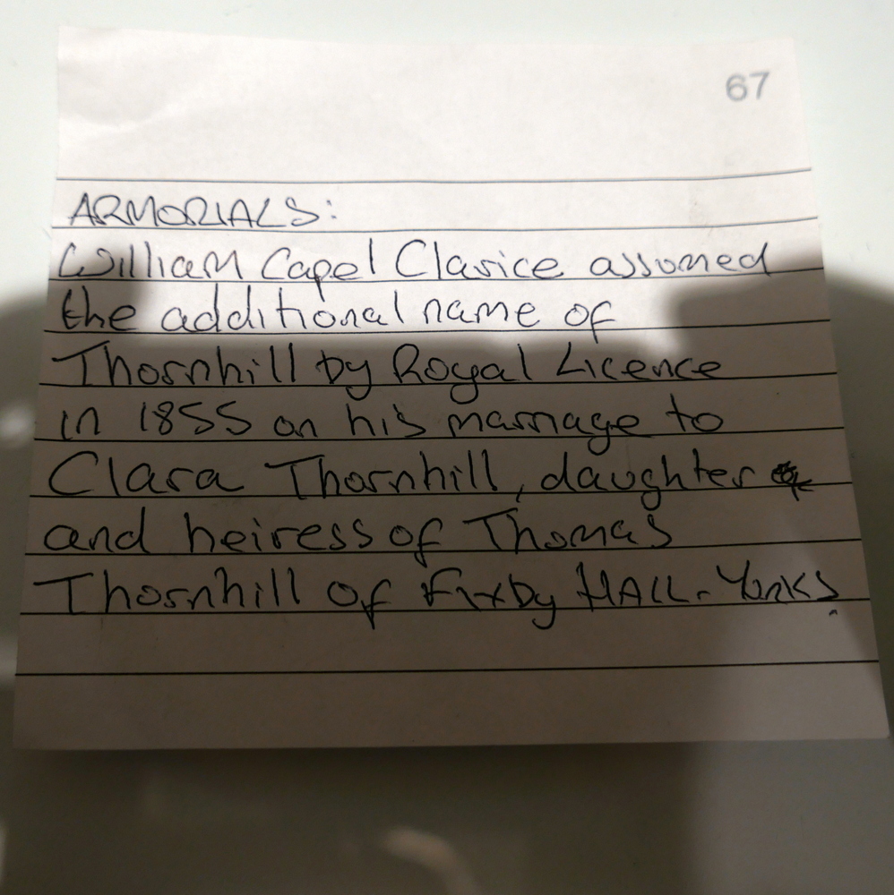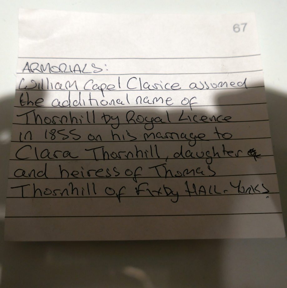 Armorials: Â William Capel Clasice assumed the additional name of Thornhill by royal licence in 1855 on his marriage to Clara Thornhill daughter and heiress of Thomas Fixby Hall of Yorks.